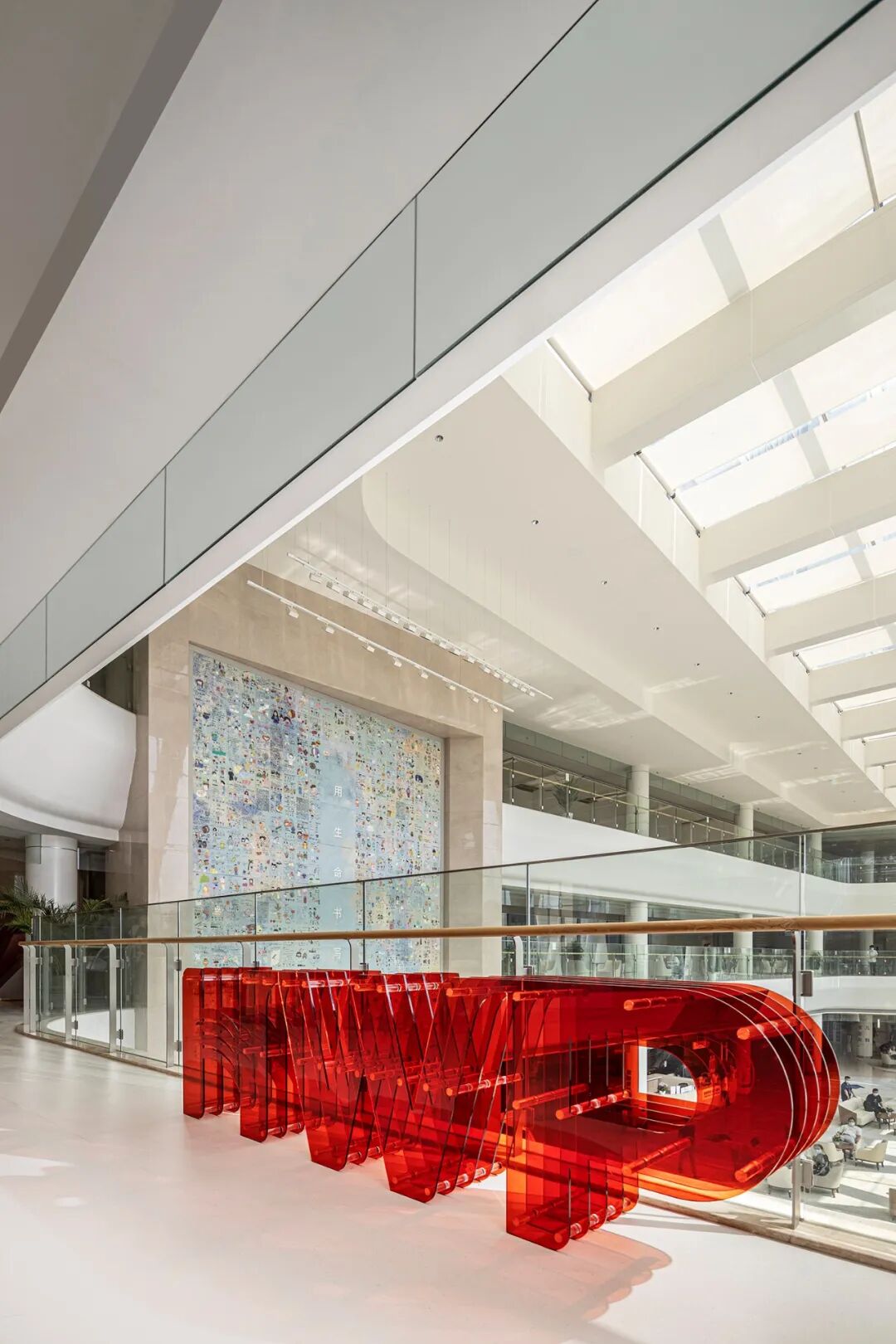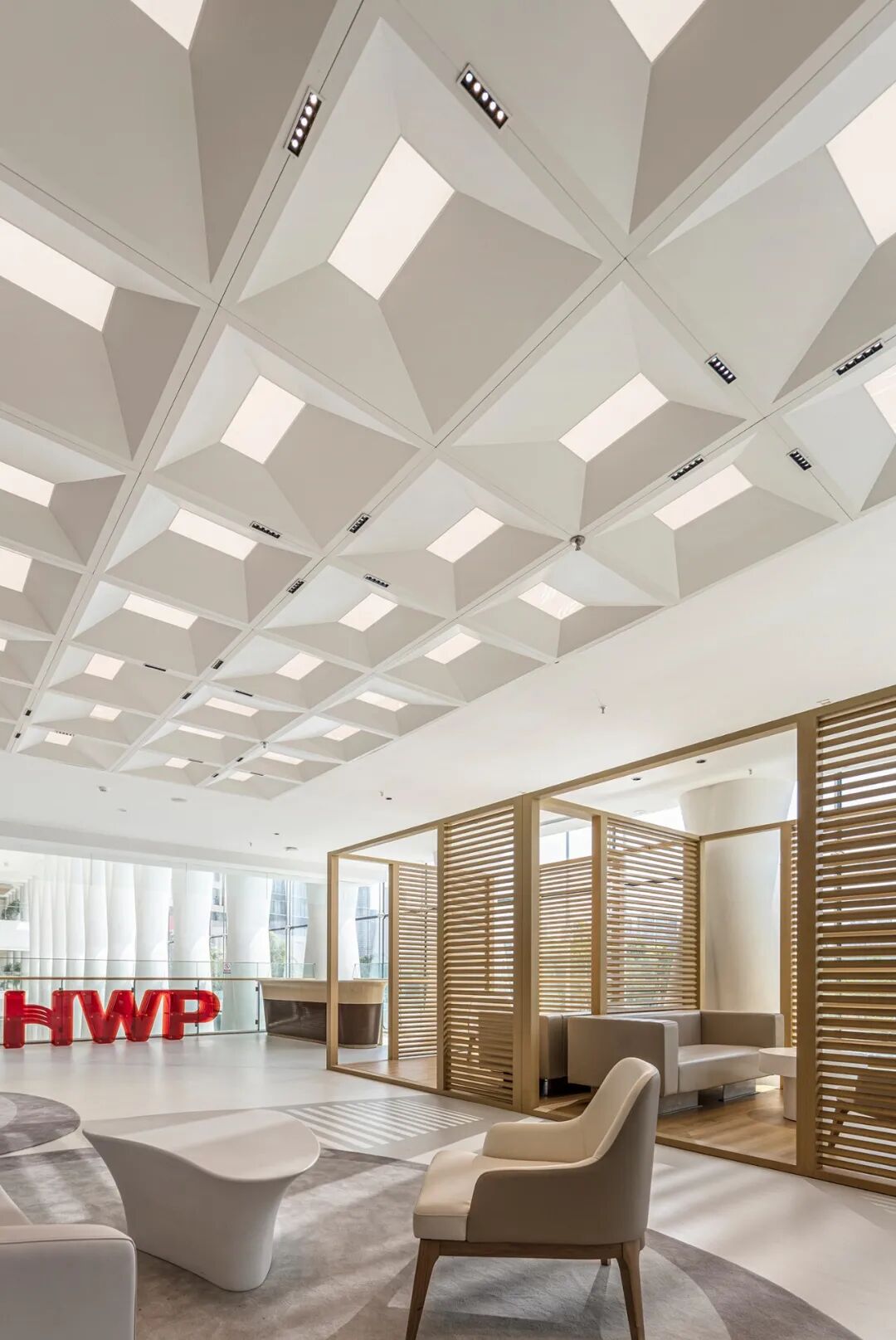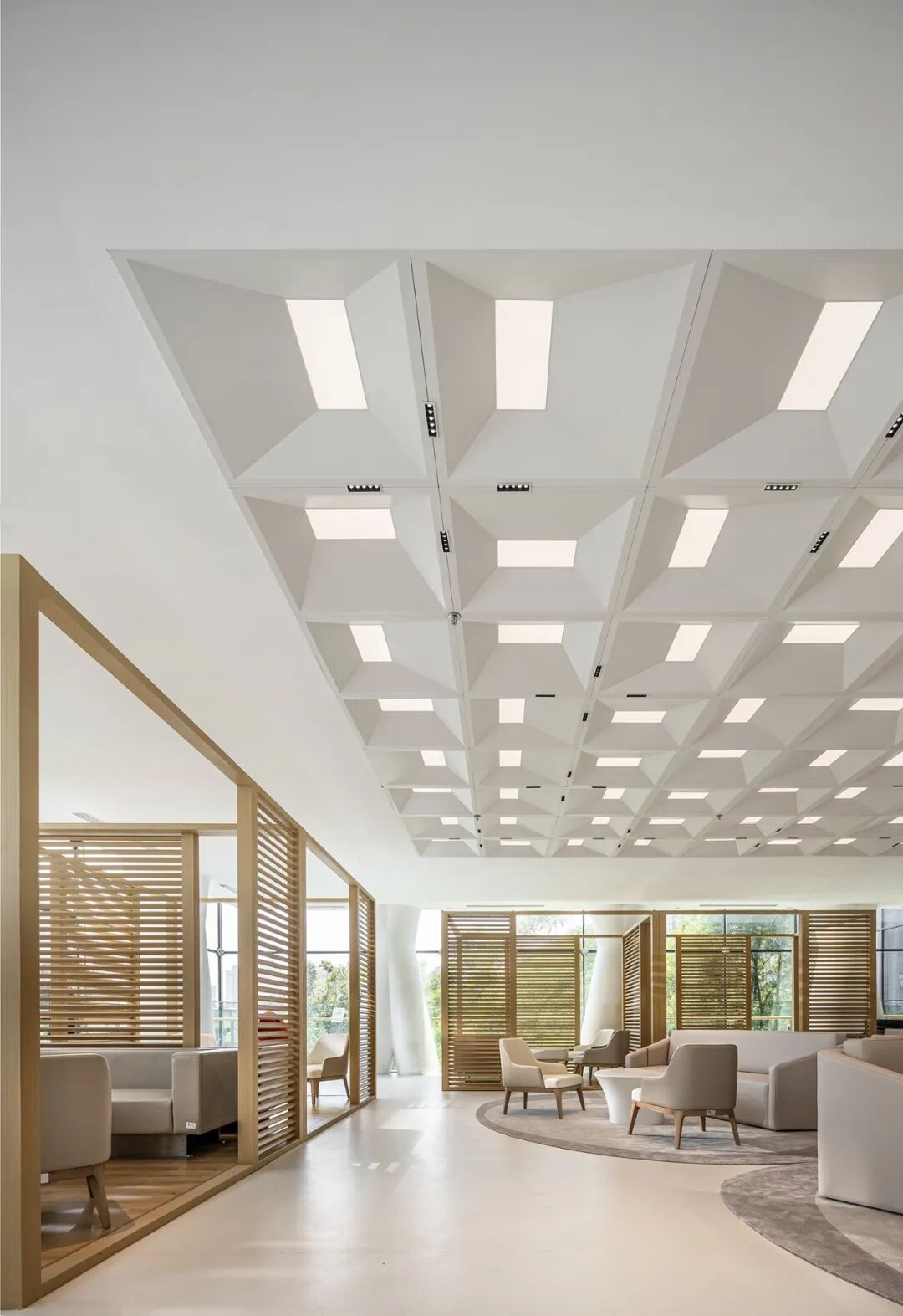 中央沙发的特殊布局既突破了洽谈空间的传统规划,又体现了情感交流的细腻。空间动线中,客户的每个驻足节点都经过精心设计,比如走出电梯的一刹那,客户不再老生常谈地看到机构化的接待台,而是一个影像橱窗装置;一层展厅与医院大厅的视觉交融被柔美的曲面分隔开,主题明确、隔而不绝;如果留心就会发现,天花的设计灵感来自泰康的 Logo——“一横一竖”的“人”字在大方块中划分出造型,仿佛在各个空间提醒大家泰康初心。