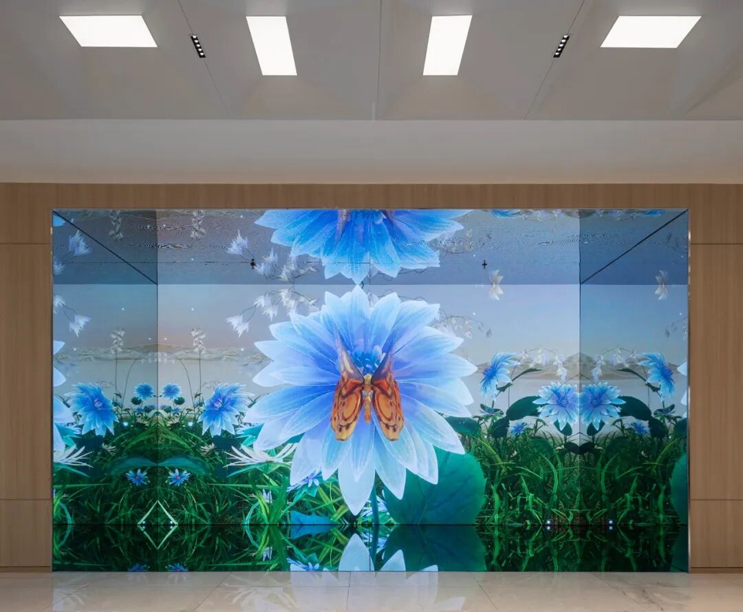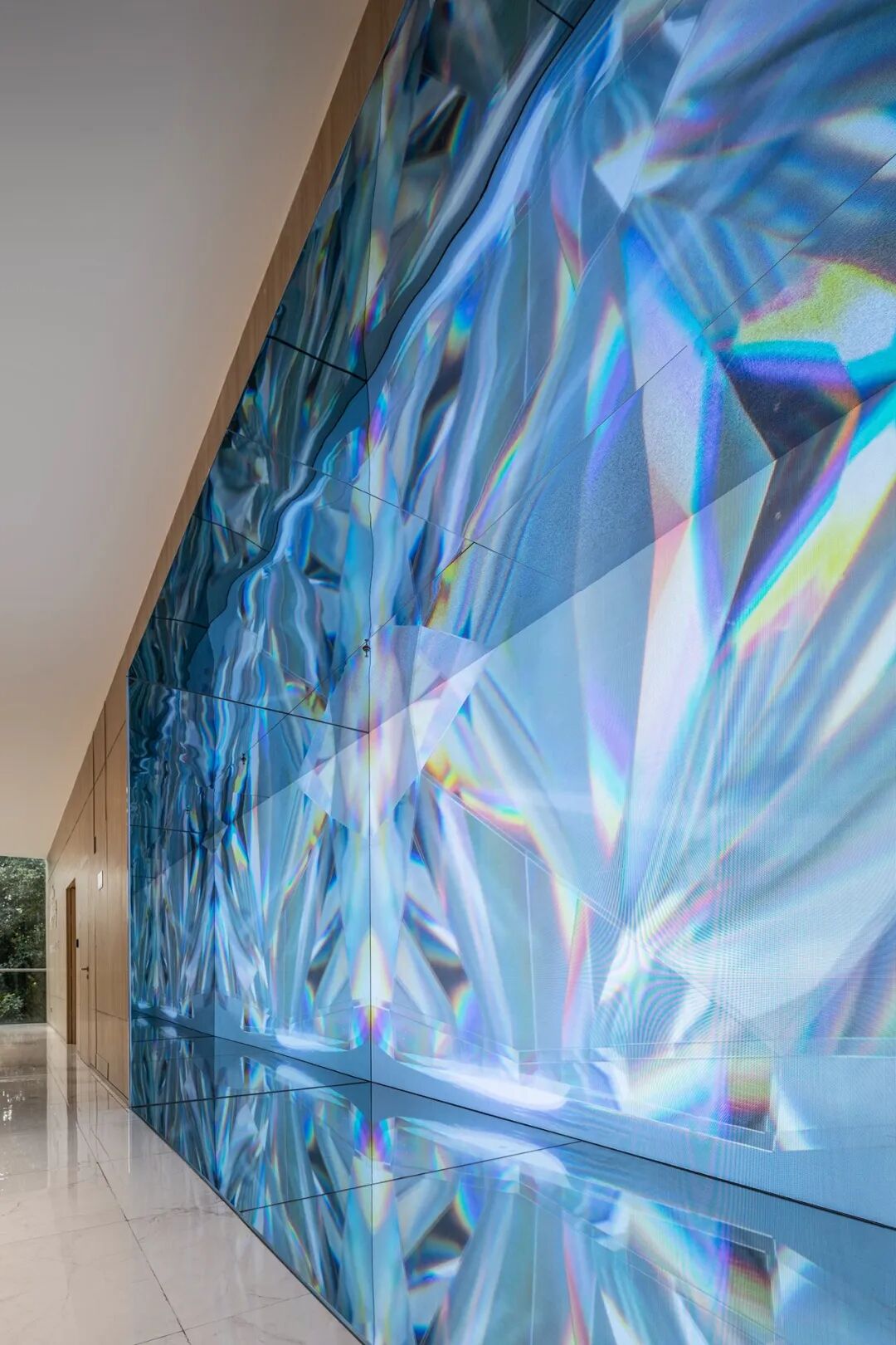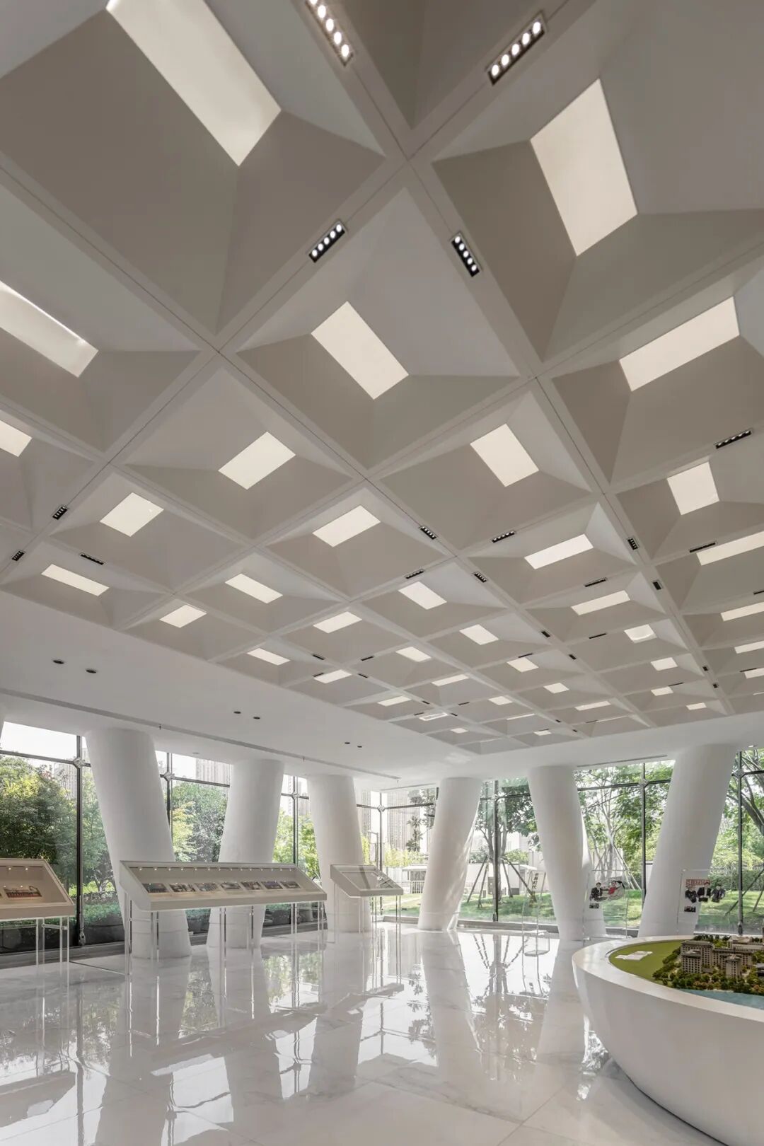 中央沙发的特殊布局既突破了洽谈空间的传统规划,又体现了情感交流的细腻。空间动线中,客户的每个驻足节点都经过精心设计,比如走出电梯的一刹那,客户不再老生常谈地看到机构化的接待台,而是一个影像橱窗装置;一层展厅与医院大厅的视觉交融被柔美的曲面分隔开,主题明确、隔而不绝;如果留心就会发现,天花的设计灵感来自泰康的 Logo——“一横一竖”的“人”字在大方块中划分出造型,仿佛在各个空间提醒大家泰康初心。