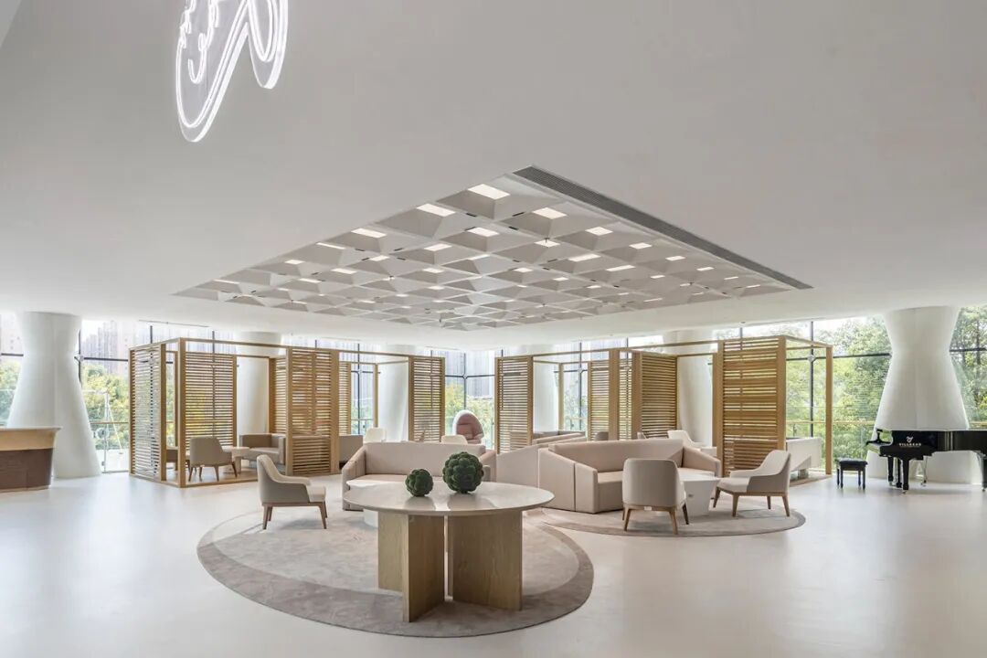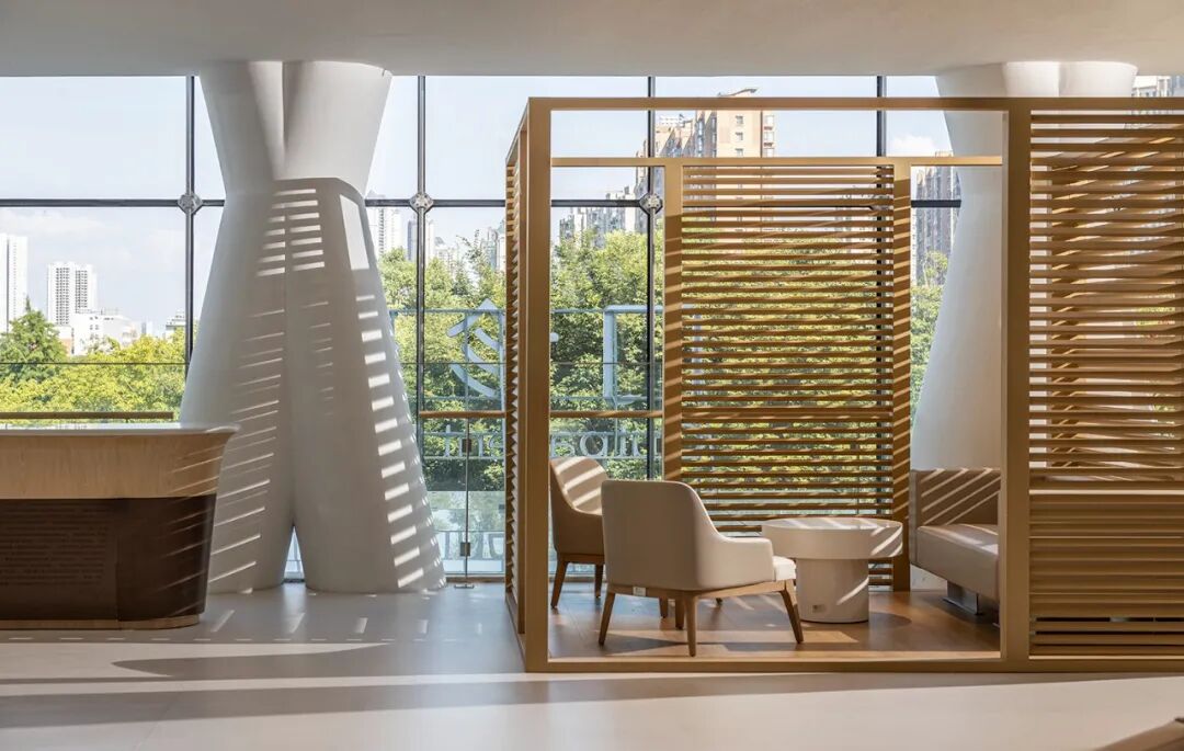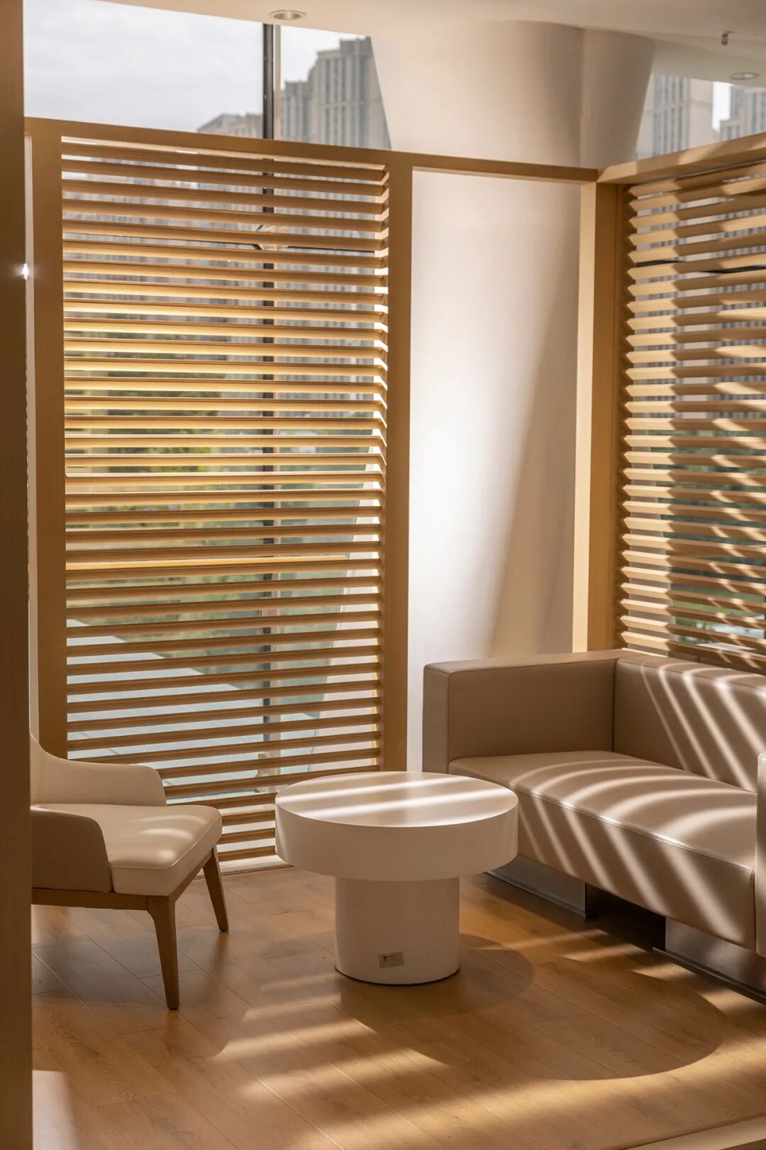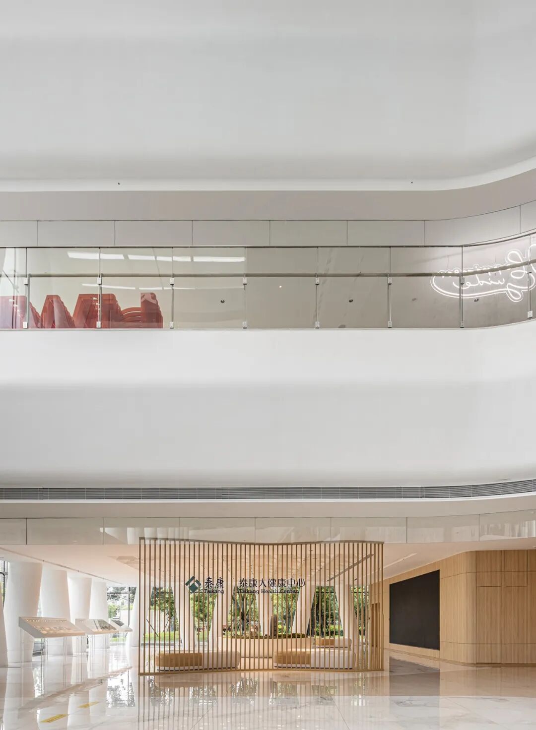 大健康中心二楼洽谈区着力打造“简约高品质”的同时,带有精神放松的“度假疗愈”氛围,在这里既可看到井然有序的医院大厅整体,还可以充分放松身心,享受尊贵的 VIP 服务并从整体氛围中获得自身健康未来的信念。