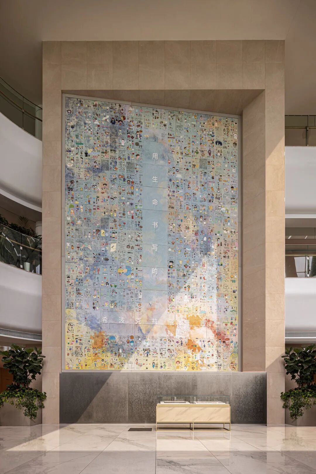 在泰康同济(武汉)医院大厅,有一幅巨大的壁画《用生命书写的希波克拉底誓言》,这是来自中央美院壁画系主任唐晖教授团队的作品。2020 年 2 月 7 日,泰康同济(武汉)医院吹响出征号角,火速入列,投入抗疫前线。这幅巨型壁画就是由当时参加抗击疫情的 1900 名医护人员与艺术家、插画师们共同完成。