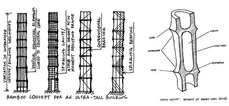 竹子结构的优良力学性能最主要是来自于竹节,对于长细比较大的超高层建筑来说参考意义极大,而超高层建筑常采用的筒体结构,本身就是参考竹子中空的整体结构形式而来的。