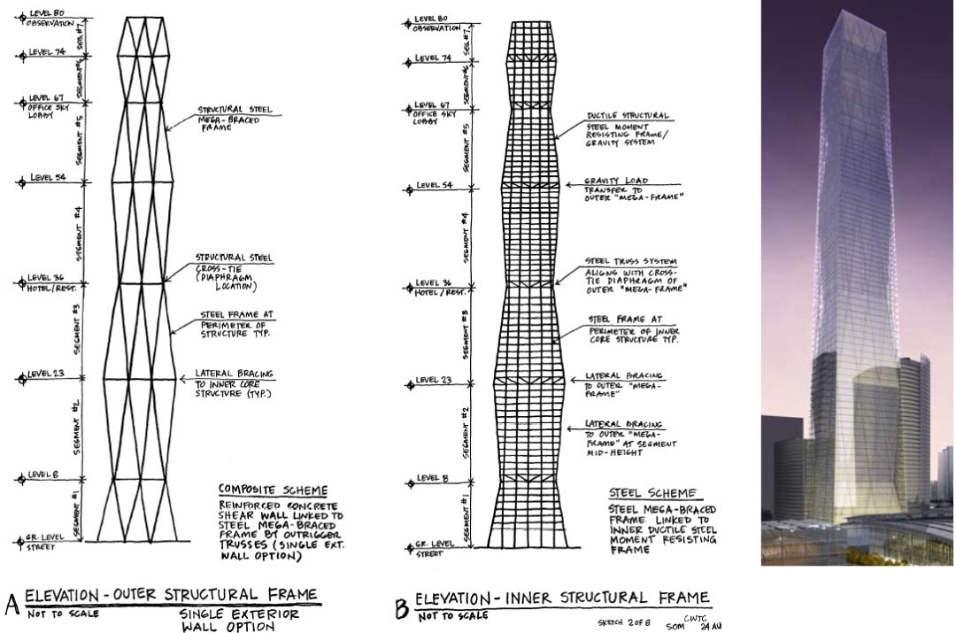 SOM将竹子的这些特性应用到了中国国际贸易中心(China World Trade Center)的结构方案设计中,结构采用外部巨型支撑+内部带伸臂桁架的框架核心筒双重结构体系,它主要从竹子结构的三个优良方面进行结构的仿生设计,即整体形态、竹节间距和壁厚变化。