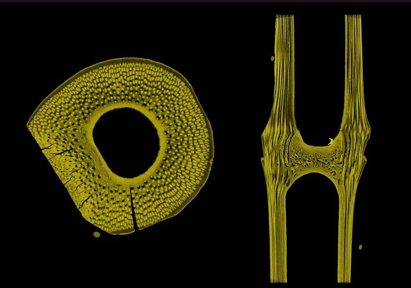 竹子的典型段包含竹节和节间,其中节间是空心的,所有的材料都集中在外侧,这样在减小了自重的同时也增大整个截面惯性矩,其微观特性也反映了同样的规律,越靠近边缘细胞越为致密,使得整个结构抗弯强度及刚度最大化。