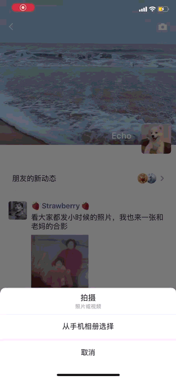 如下图,发朋友圈,点击「从手机相册选择」,这时候新页面从屏幕底部出现,导航栏左侧为「关闭」。