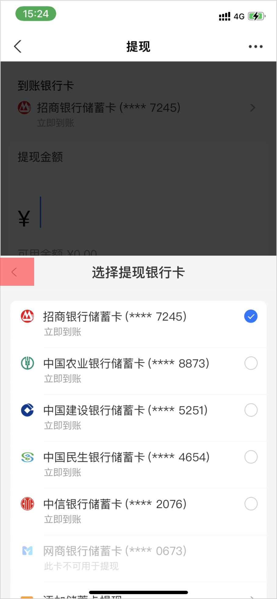 支付宝充值提现,选择银行卡时,浮层面板从底部出现,使用返回,不符合交互动效,这种做法不对,如下图所示:
