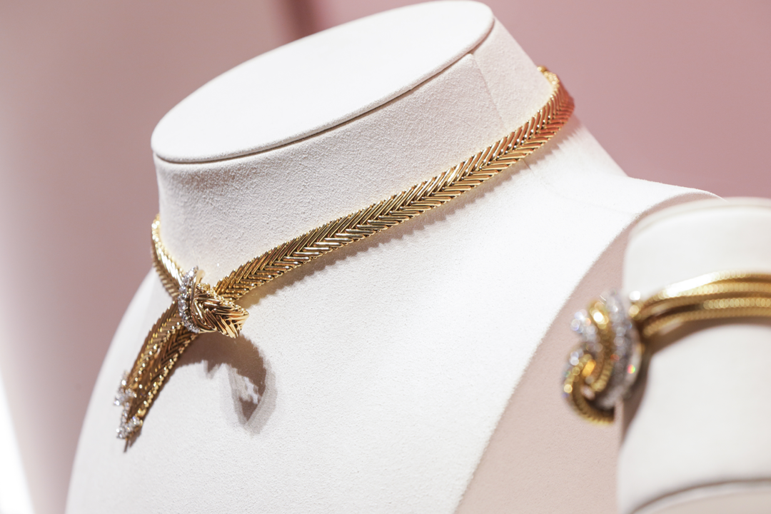 以各种织物为灵感,梵克雅宝用黄K金做出纺线、编织出人字纹带、平针织物、薄纱、蝴蝶结等等精美珠宝作品。缠绕、编织,黄K金在项链、胸针、耳饰与手链中绽放光彩。
