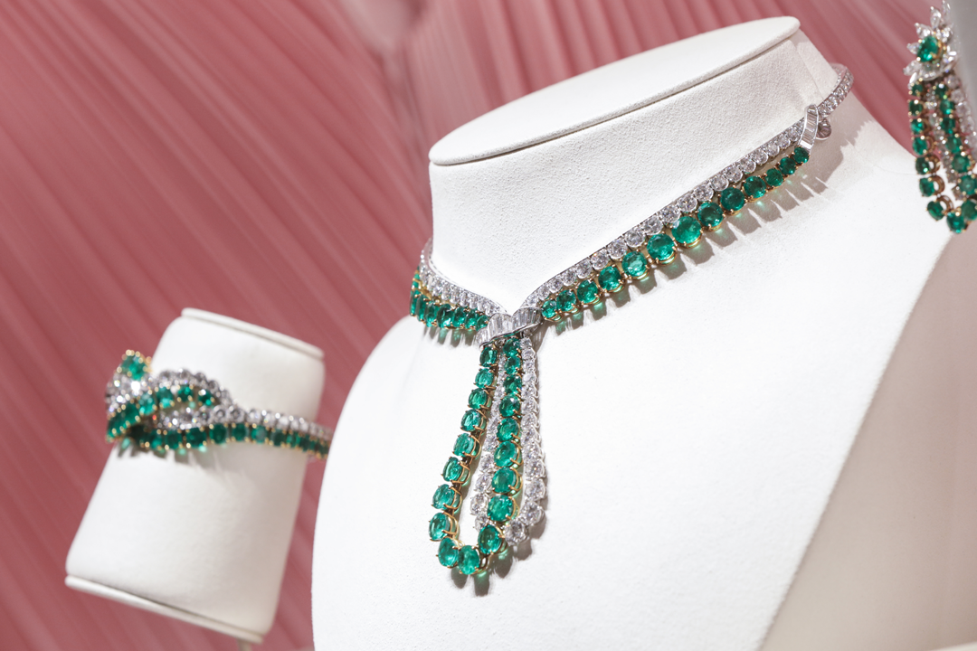这一组镶嵌钻石和祖母绿的珠宝套件创作于1955年,可以被归为“礼服珠宝”这一类,是1950年代代表性的华丽风格。