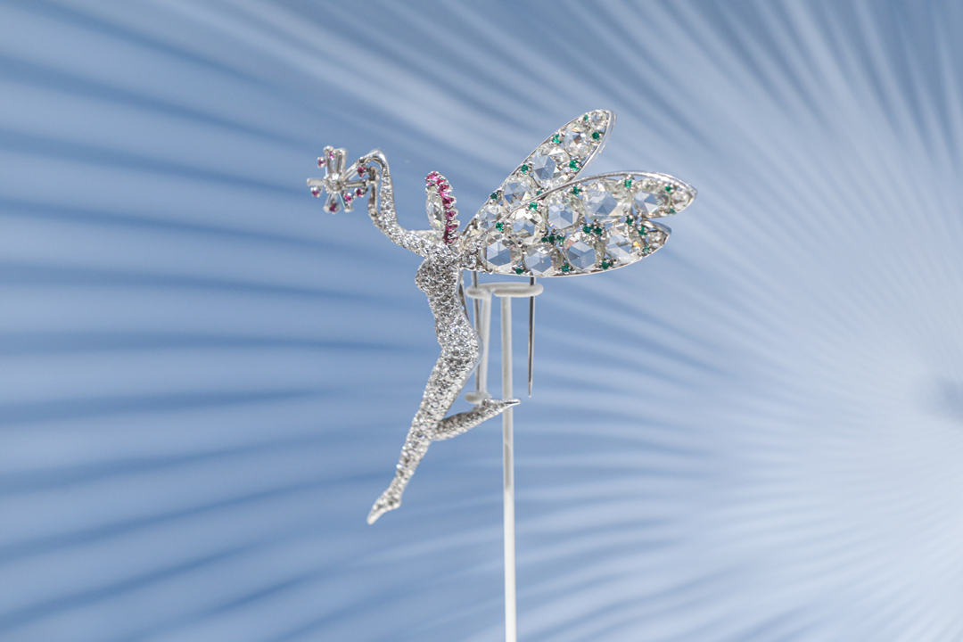 这枚仙子胸针的姿态仿佛是悬在空中,缓缓轻盈下落。仙子的脸庞是一颗玫瑰形切割的白钻,身影以铂金勾勒,蜻蜓般纤薄的翅膀上是闪耀的白钻。
