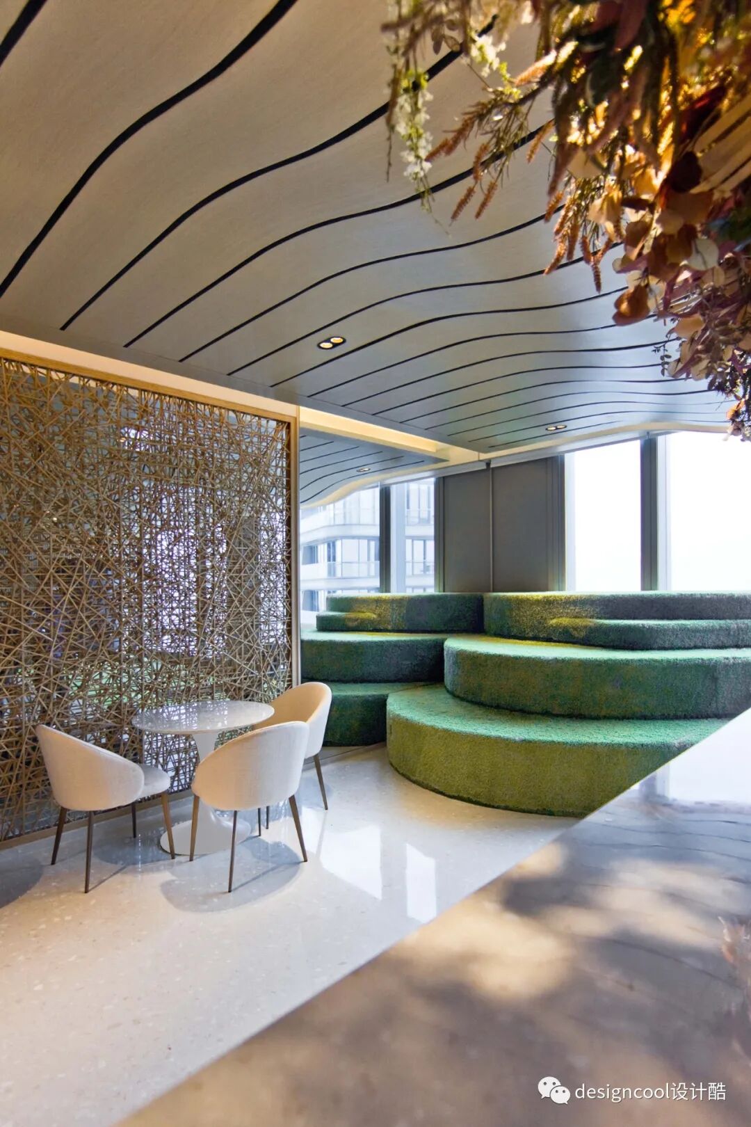 自然光、干燥的植物、绿色的草坪座椅和竹屏风为饮食顾问区的零售和营养咨询活动提供了平静和休闲的时刻。