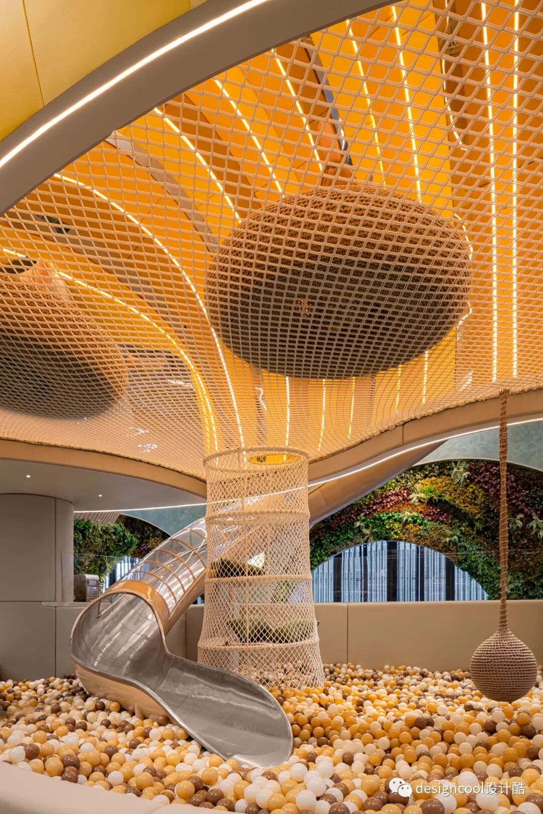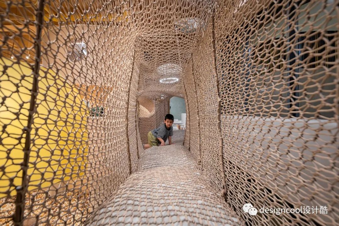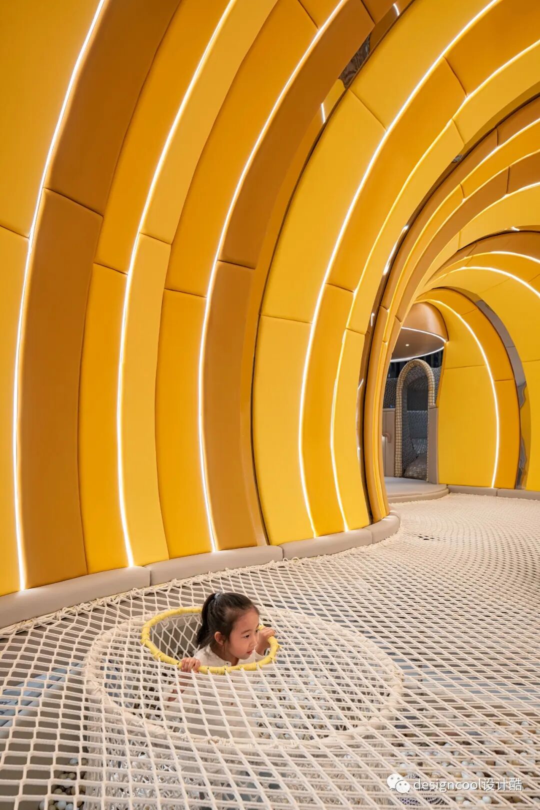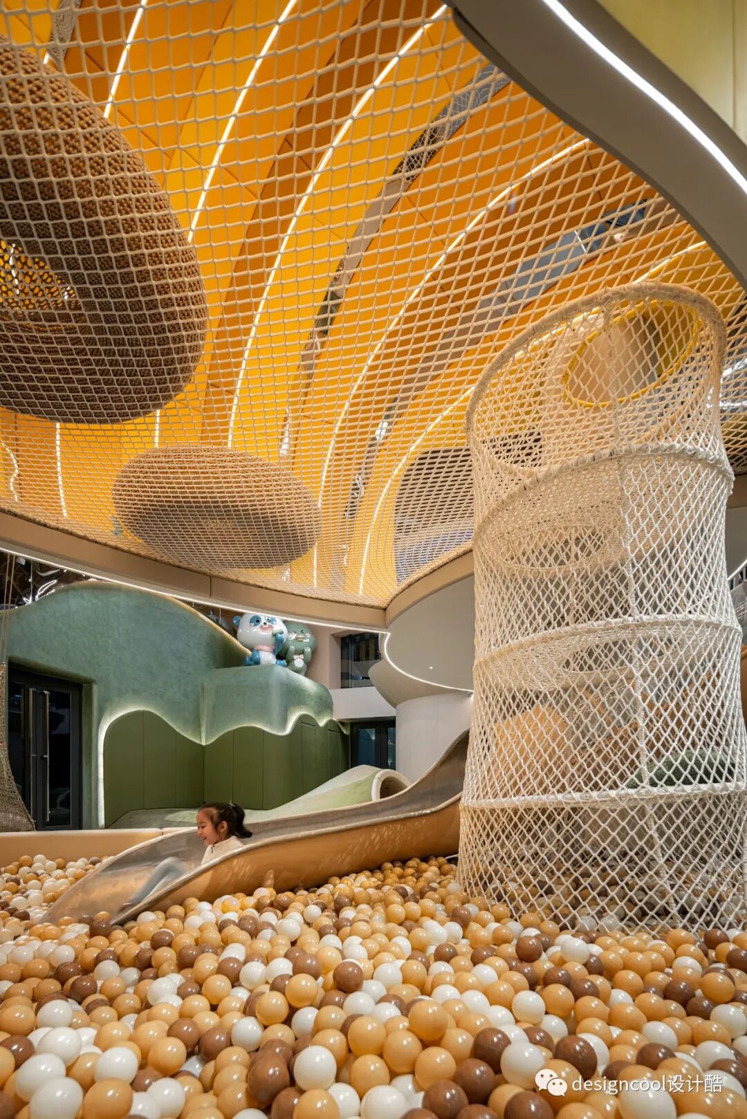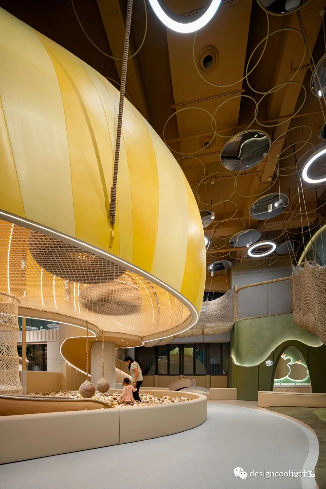 黄色调的第二个区域是沙滩式的开阔区域,球池、跳跃和攀岩绳索排列,夹层与茧桥相连。