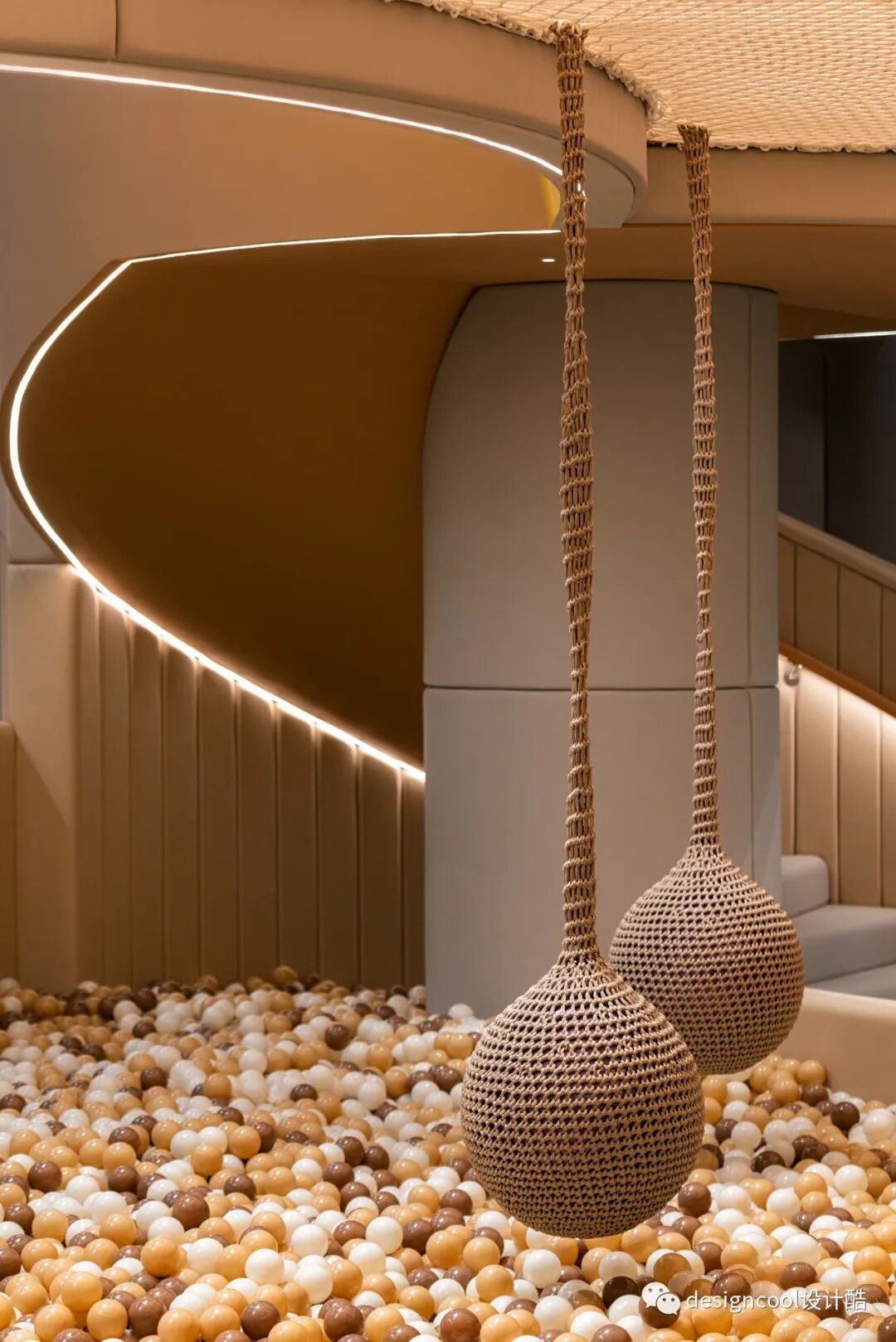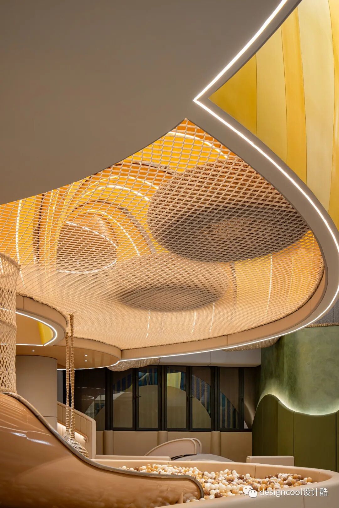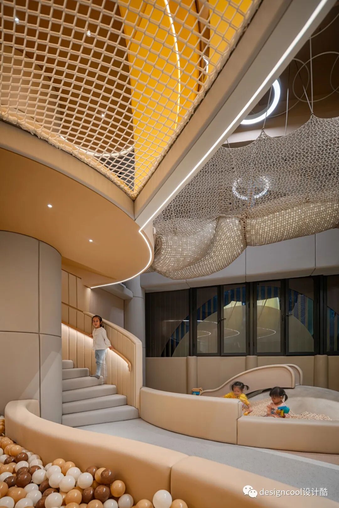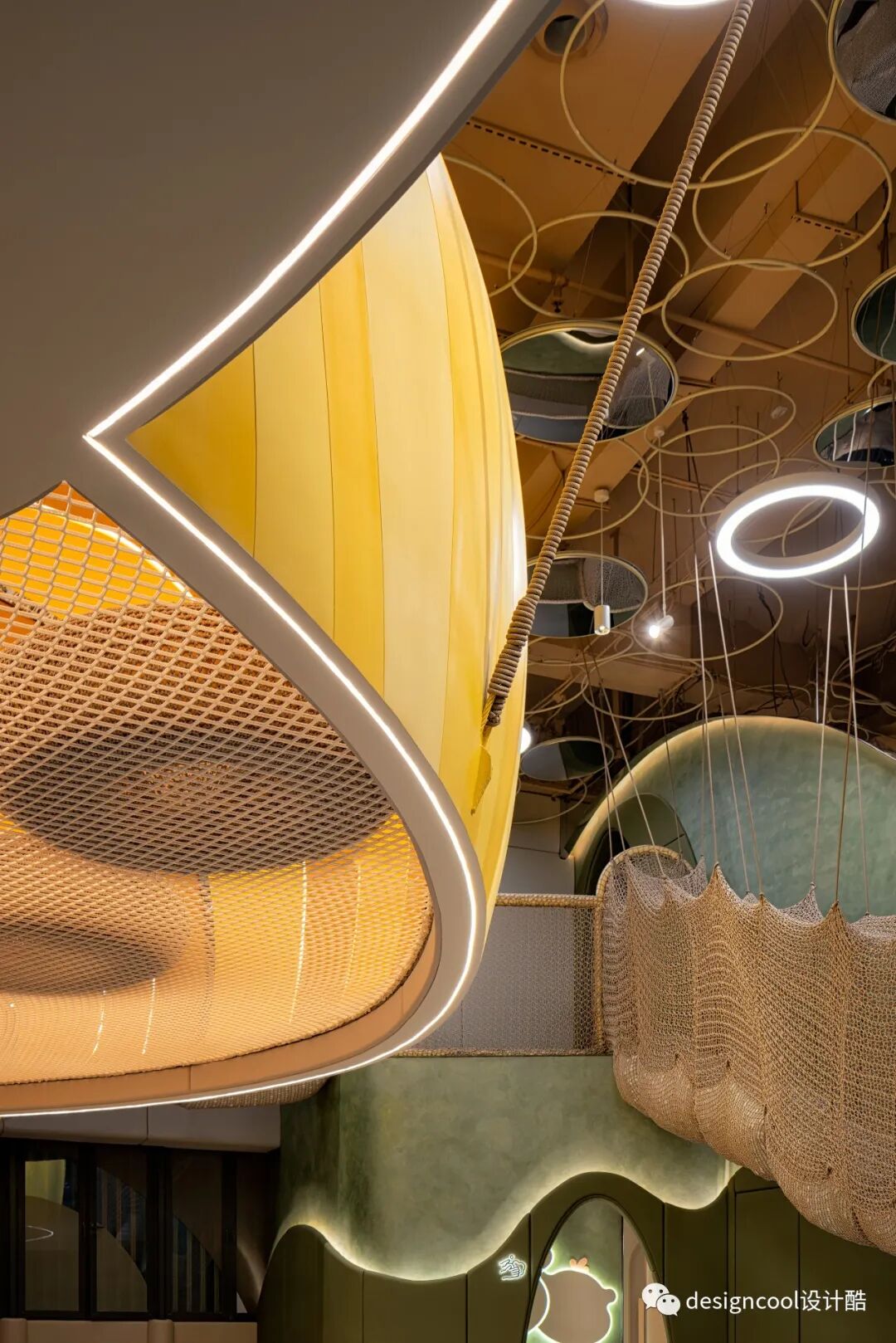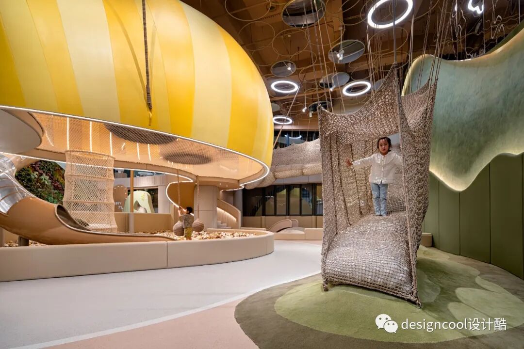 黄色调的第二个区域是沙滩式的开阔区域,球池、跳跃和攀岩绳索排列,夹层与茧桥相连。