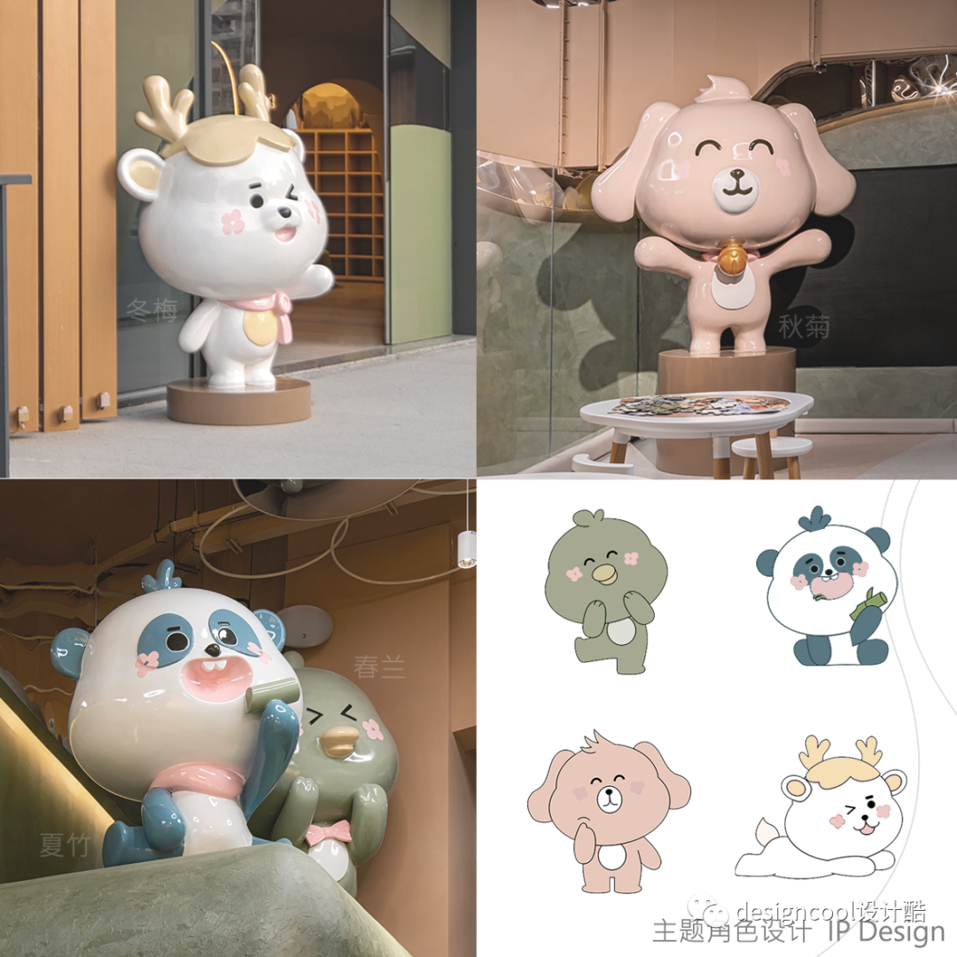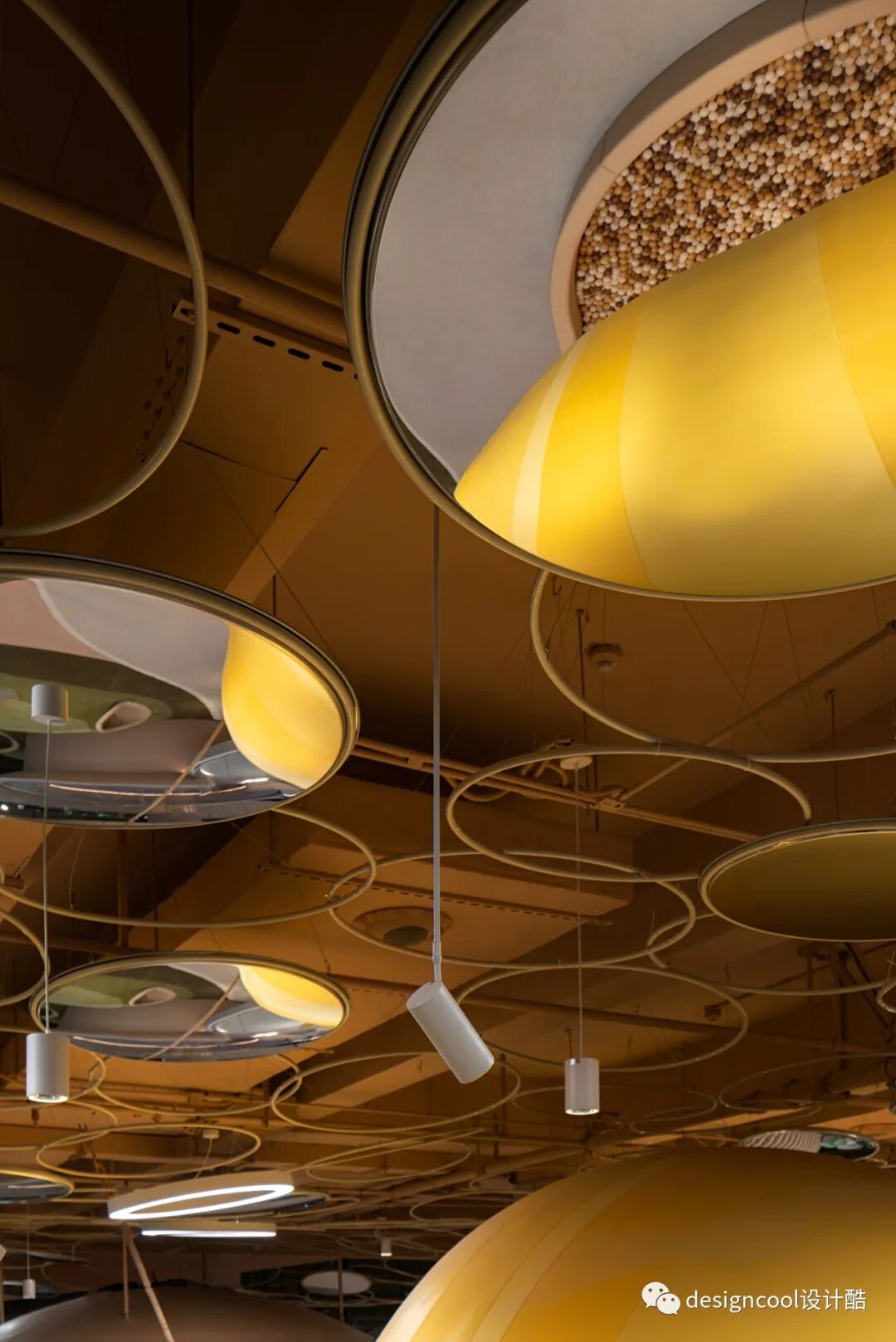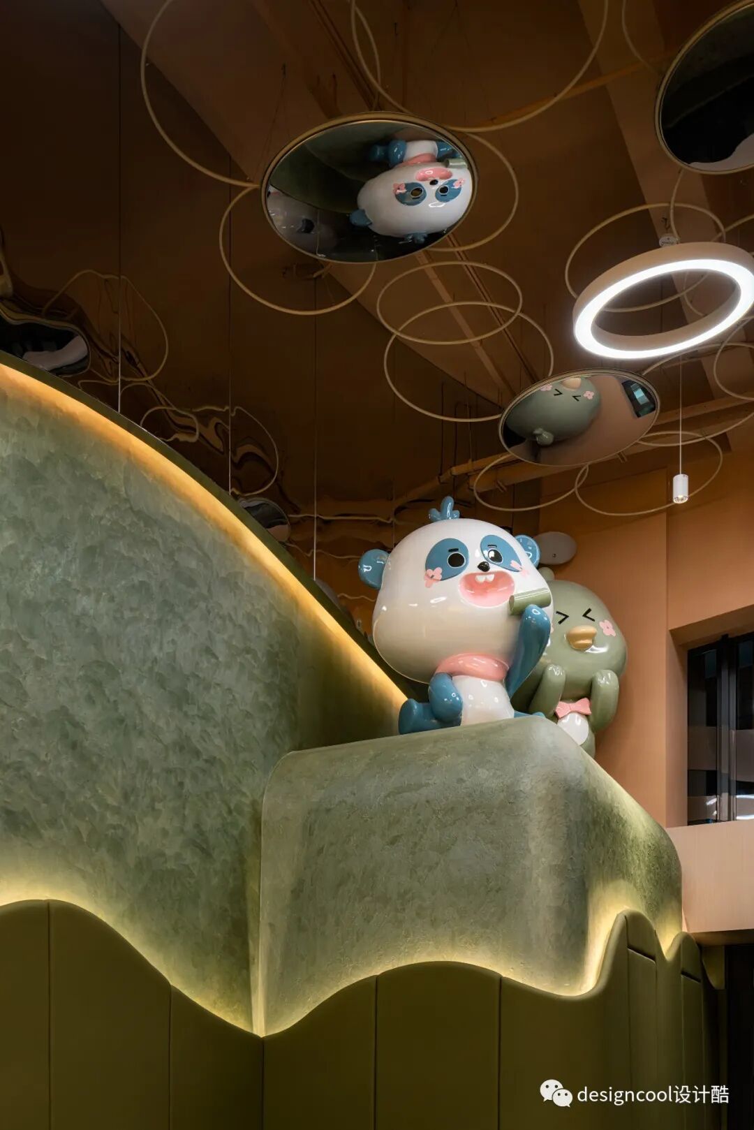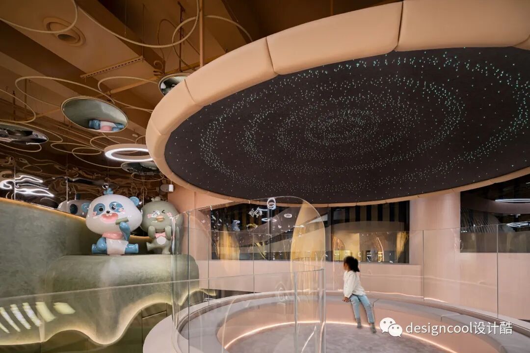 整体开敞的天花布满富有韵律感的凸面镜面圆盘,结合扭曲的镜面墙,视觉上纵横延伸,增加了梦幻感。不同定制设计的3D卡通角色赋予了整个空间生命并完成品牌叙事。