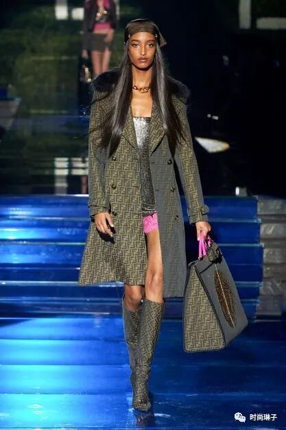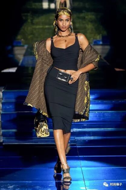 Donatella Versace 打造的FENDI BY VERSACE系列大量采用Fendi的FF Monogram图案,Versace范思哲金色图腾印花,搭配芬迪字母图案,复古又时髦。性感的亮片裙,使Fendi的世界更年轻叛逆。