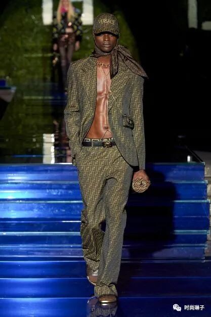 VERSACE BY FENDI系列由Kim Jones和Silvia Venturini Fendi以自己的视角诠释Versace。设计师从品牌90年代中后期的风格出发,将 Fendi芬迪品牌标志与Versace范思哲希腊回纹图案相结合,Versace范思哲经典的别针元素也成了服饰中的一大亮点,散发着摇滚魅力。