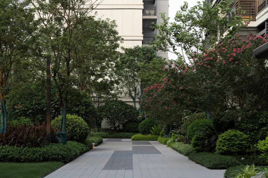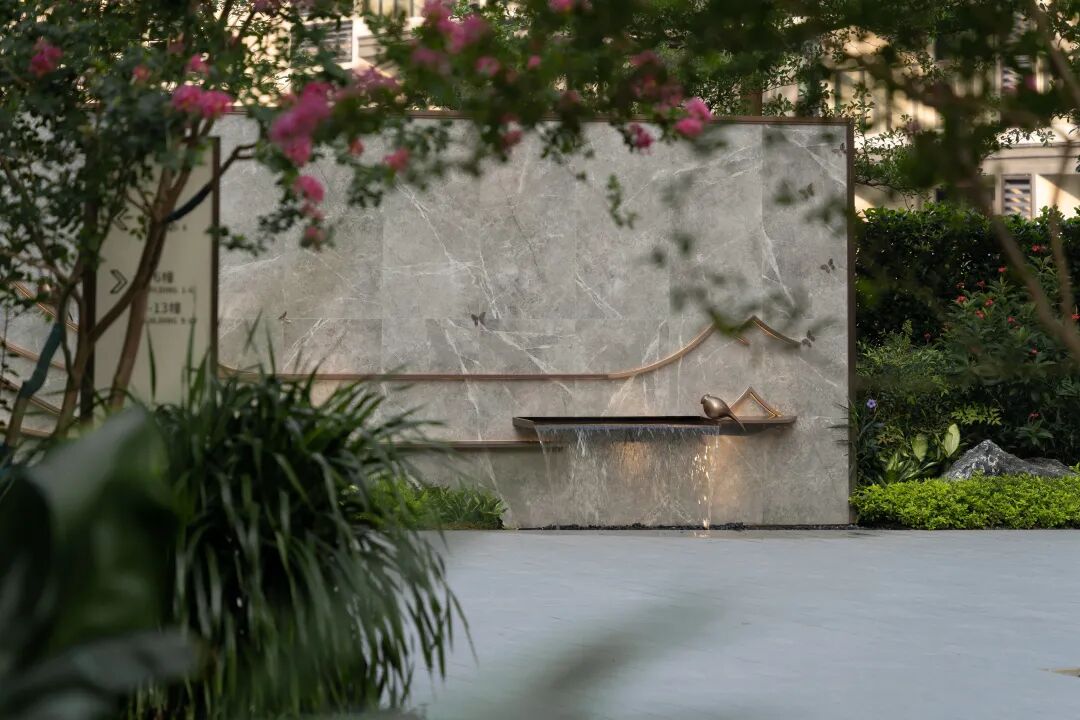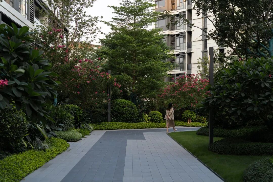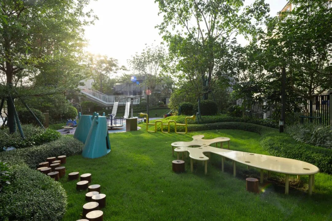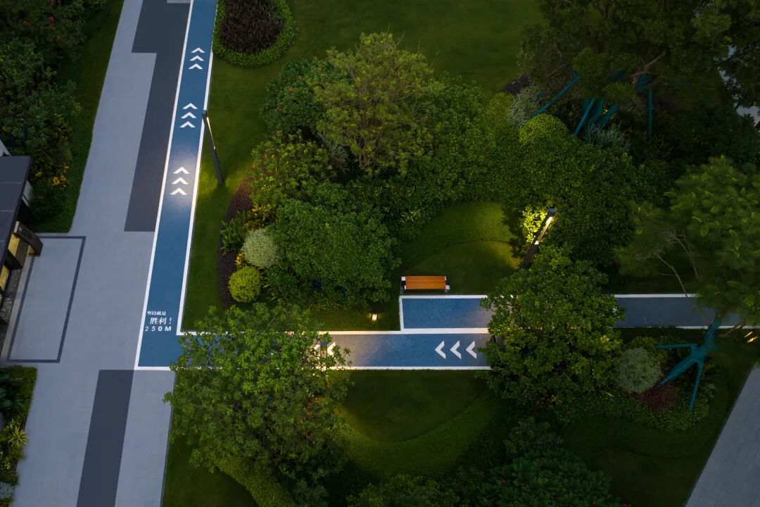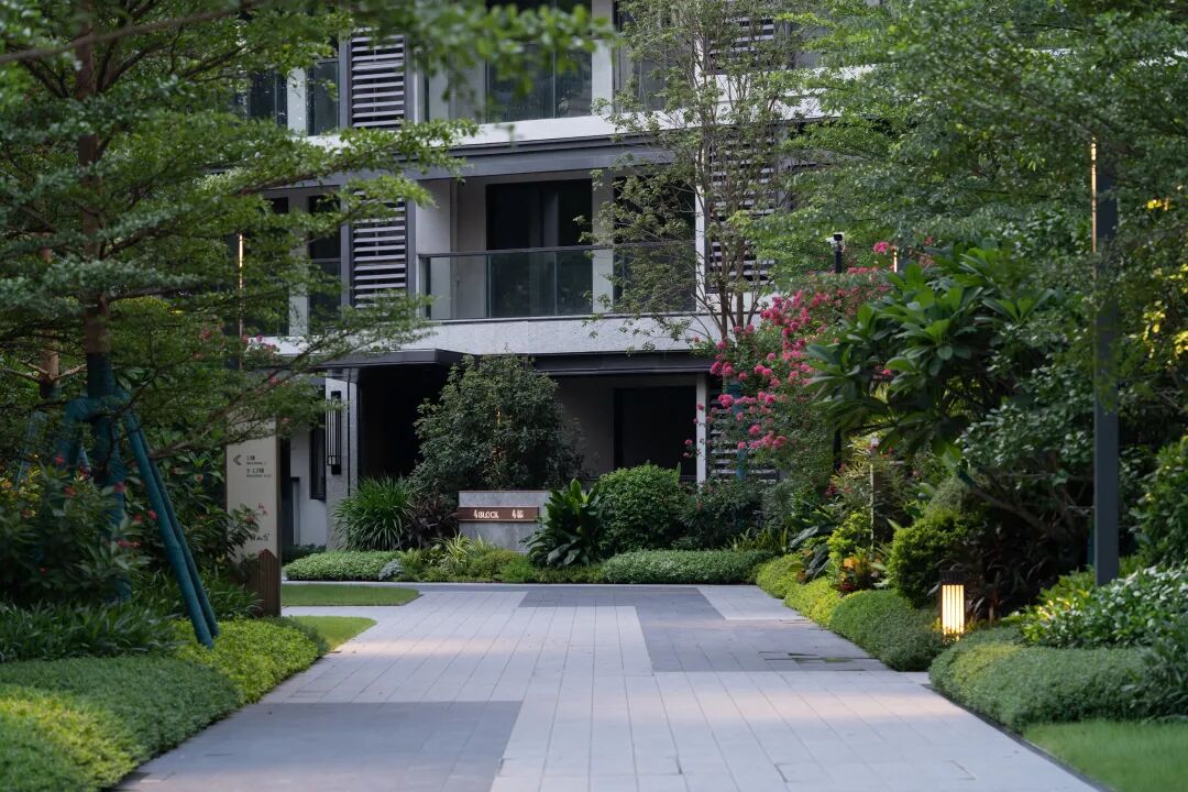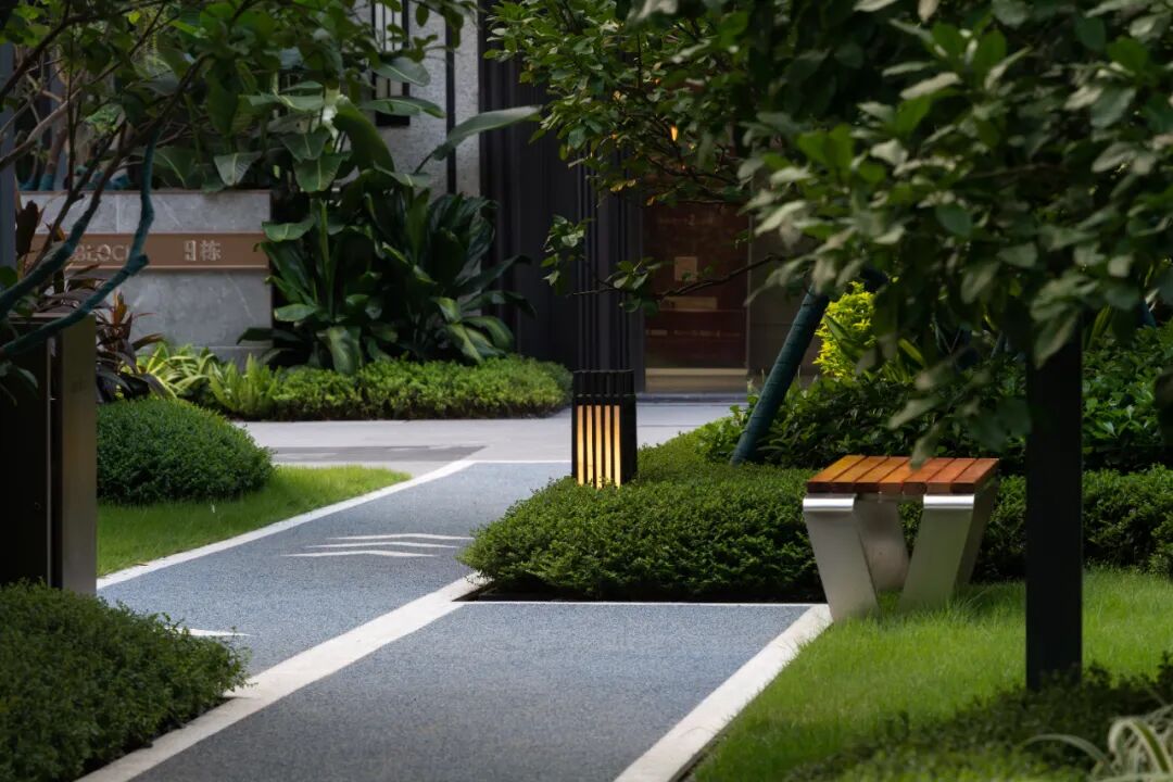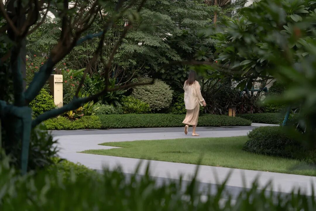 运用“障景”的手法,一步一景,打造曲径通幽的美景,经过枝繁叶茂的香柚迎宾道(香柚寓意“佑子”)后,便是别有洞天的游园见林,令人豁然开朗。