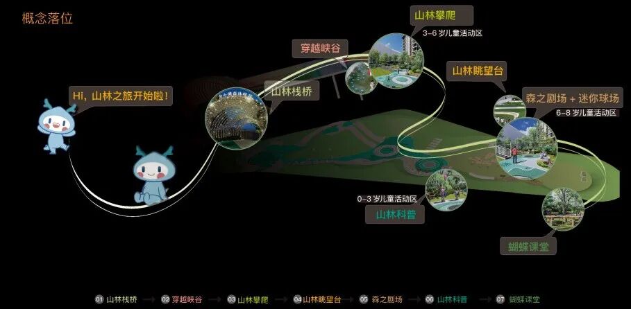 穿过凤仪亭,来到连接山林秘境的全龄探险乐园,通过龙小湖的引领一同体验属于龙山森林里的秘密。