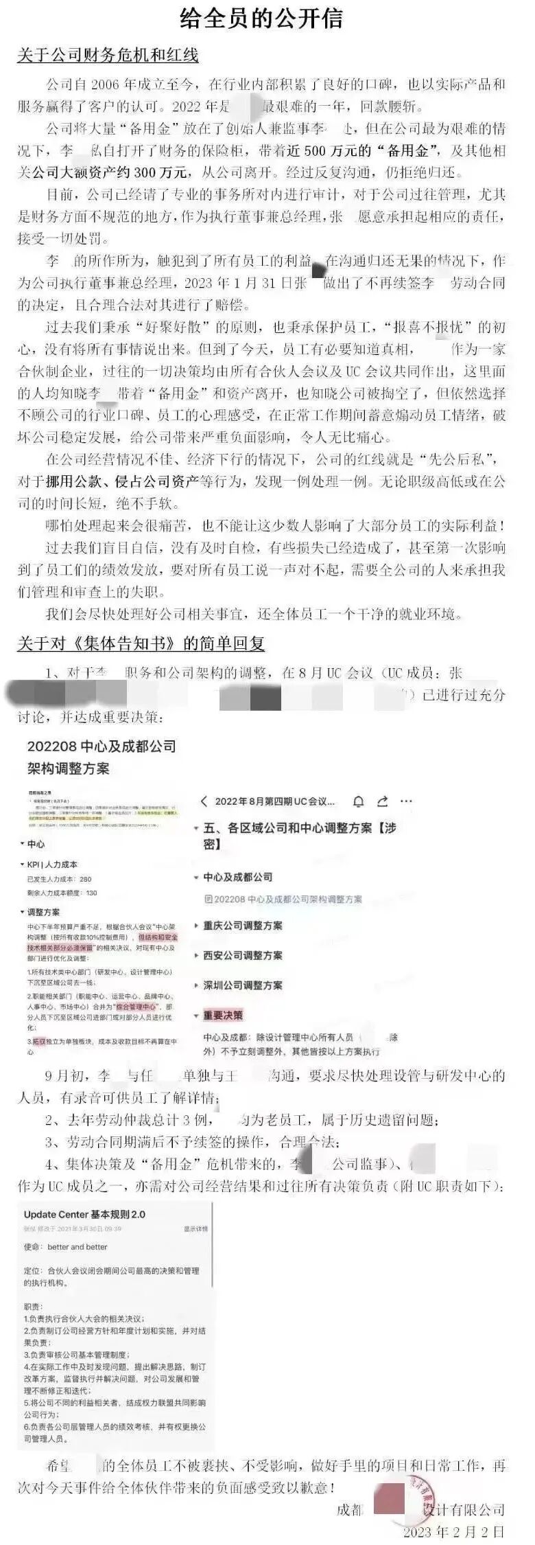 首先是该公司总经理张某以公司名义发布“给全员的公开信”,文中表示,在公司回款腰斩之际,监事李某反行其道,私自打开了财务的保险柜,带着近500万元的“备用金”,及其他相关公司大额资产约300万元,从公司离开。经过反复沟通,李某仍拒绝归还,故张某决定不再续签李某的劳动合同,以避免挪用公款、侵占公司资产等行为发生。