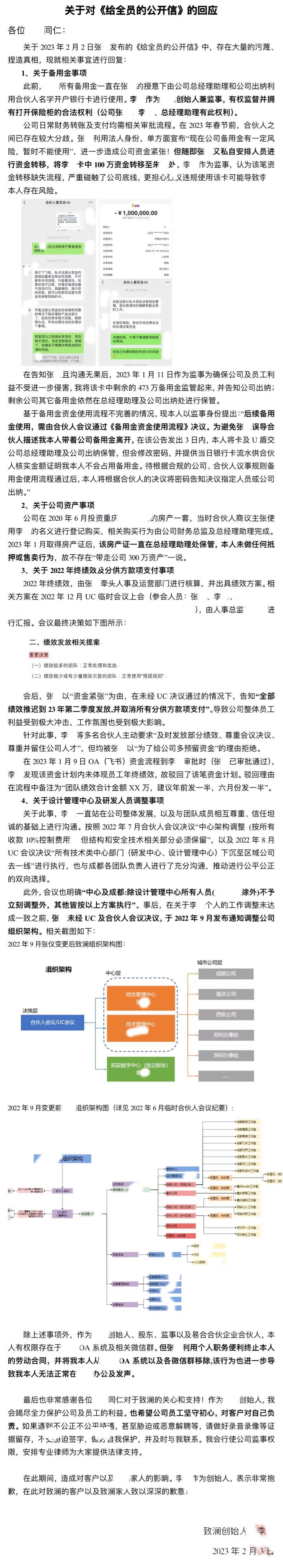 李某第一时间回应并附上聊天记录、转账记录等作为辅证,斥责张某所发布的《给全员的公开信中存在大量不实信息。
