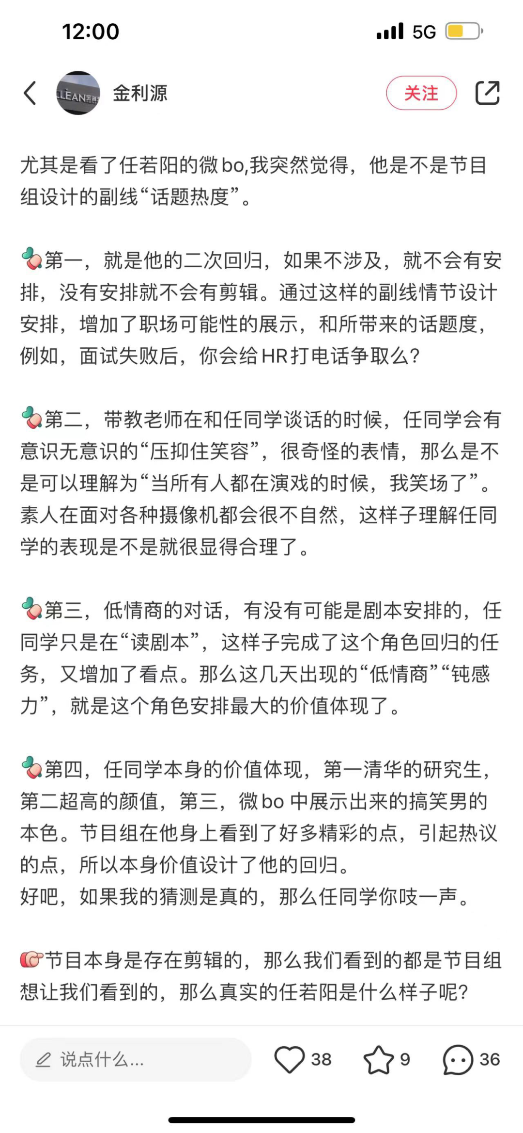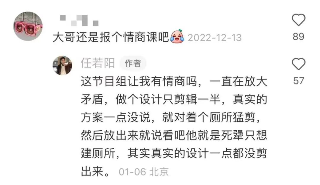 观点2023-03-15 反转?清华任若阳吐槽被鹅厂恶意剪辑,offer第一勇 最近很难不刷到任若阳的吐槽,他在社交平台上吐槽被节目组恶意剪辑搞营销。建议大家还是理智观看,不要把节目效应上升到个人,综艺节目大多数都会有一些剧本和节目效果在的,毕竟清华也不是人人都能考得上的。 任同学被恶意剪辑,来自📖网友的看法 综艺节目,你怎么看? 本文来自微信公众号“绘图空间”(ID:huitukongjian)。大作社经授权转载,该文观点仅代表作者本人,大作社平台仅提供信息存储空间服务。 TAGS: 剪辑建筑恶意综艺节目 相关文章速归8.3分还是挨骂,这部国产…新怪谈题材都市科幻风格游戏…中国美学:大巧若拙中国人,悄悄承包了阿拉伯头…上海惊现人工云奇观,背后竟…67%零售业高管尝试元宇宙…Lab代表大会 | 没有补…半年连开两个项目,是什么给…当代写意国画,都是这样死的
