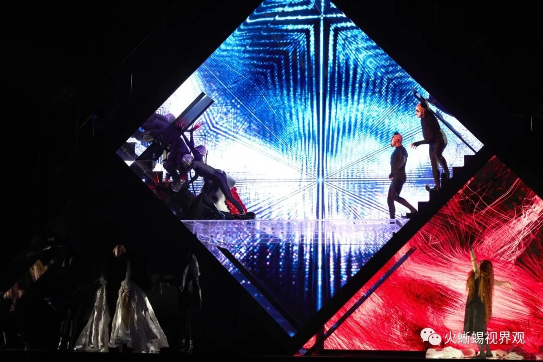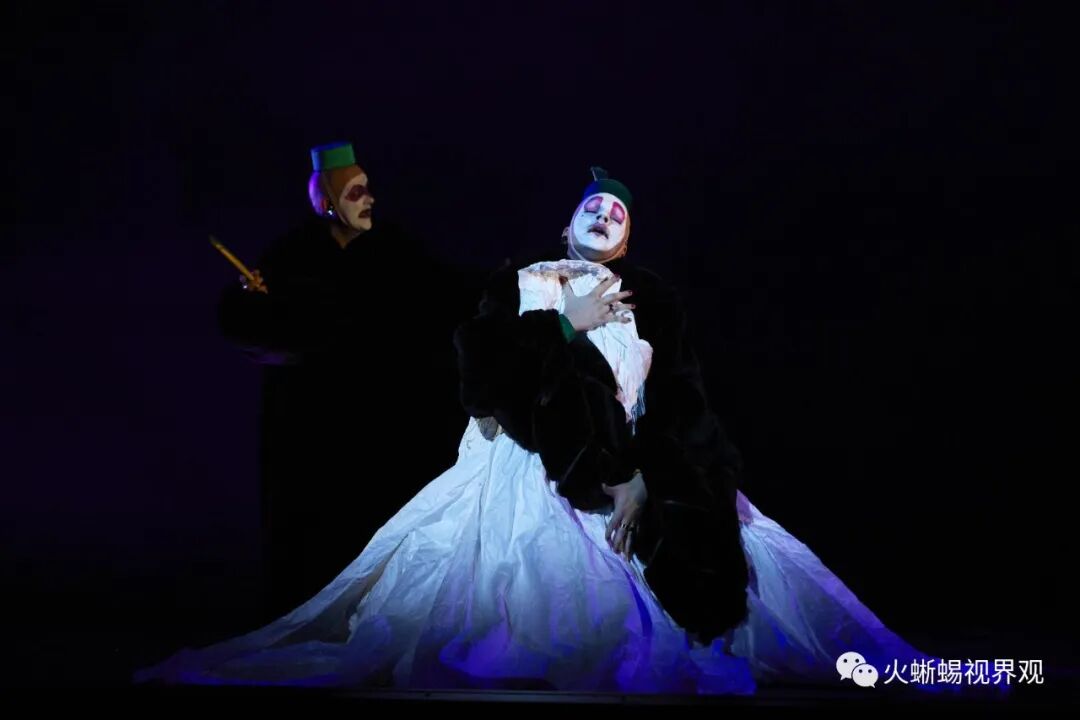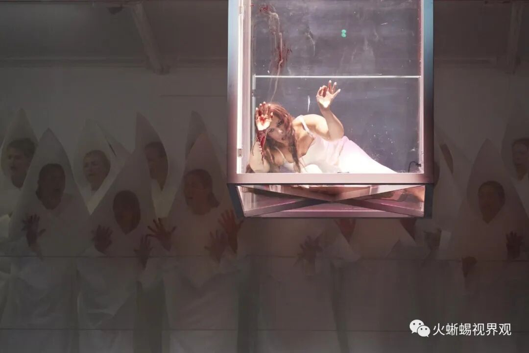 因此我们看到,在这版《图兰朵》中,失败的男人将会失去生殖器,这显然是一个未来主义,反乌托邦的游戏节目:如果你答错三个问题,你不会失去你的脑袋,你会失去你的生殖器。在某一时刻,图兰朵像一只可怕的黑色幼虫出现,想要阉割王子。这是一个受虐的世界,角色Ping、Pang、Pong是长着小丑脸的太监,他们一度赤身裸体的样子让人很难忘记他们的嘴脸!而文官则是一个脖子上挂着反射盘的白脸哑剧演员。在关键的谜语场景中,图兰朵出现在舞台的高处,在一个十面多面体中穿着金色的衣服。当卡拉夫答对了,图兰朵就会穿上一件时髦的白色婚纱,但后来这件婚纱被丢弃了,因为她似乎穿着黑色的丧服,而Ping、Pang和Pong,一度穿着色彩鲜艳的婚纱出现,却对图兰朵的黑色丧服着迷不已。与此同时,卡拉夫看起来像一个兵马俑。这一切,构成了改编版本《图兰朵》暗黑、末世的一面。