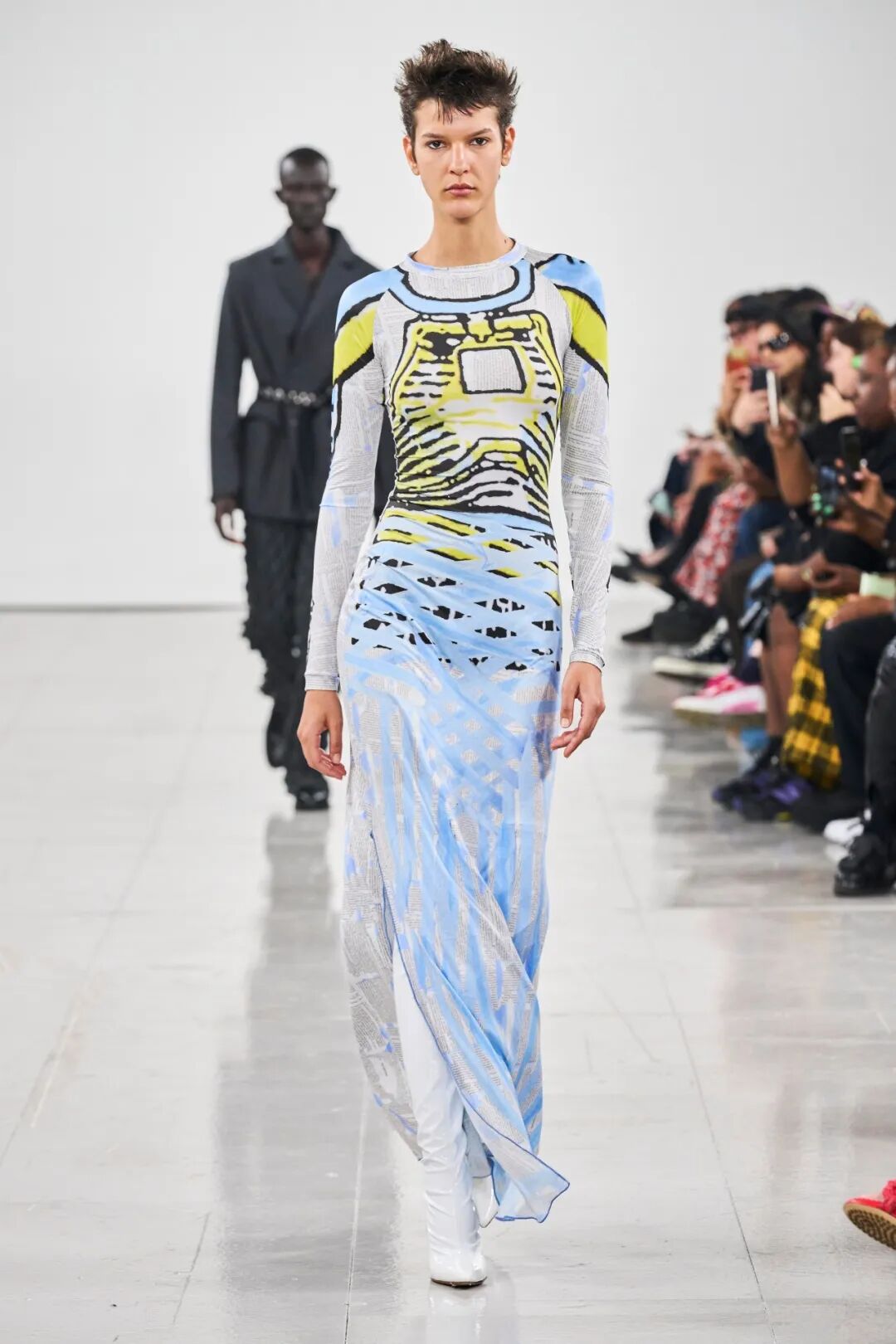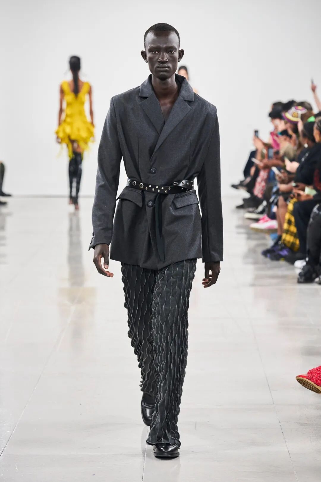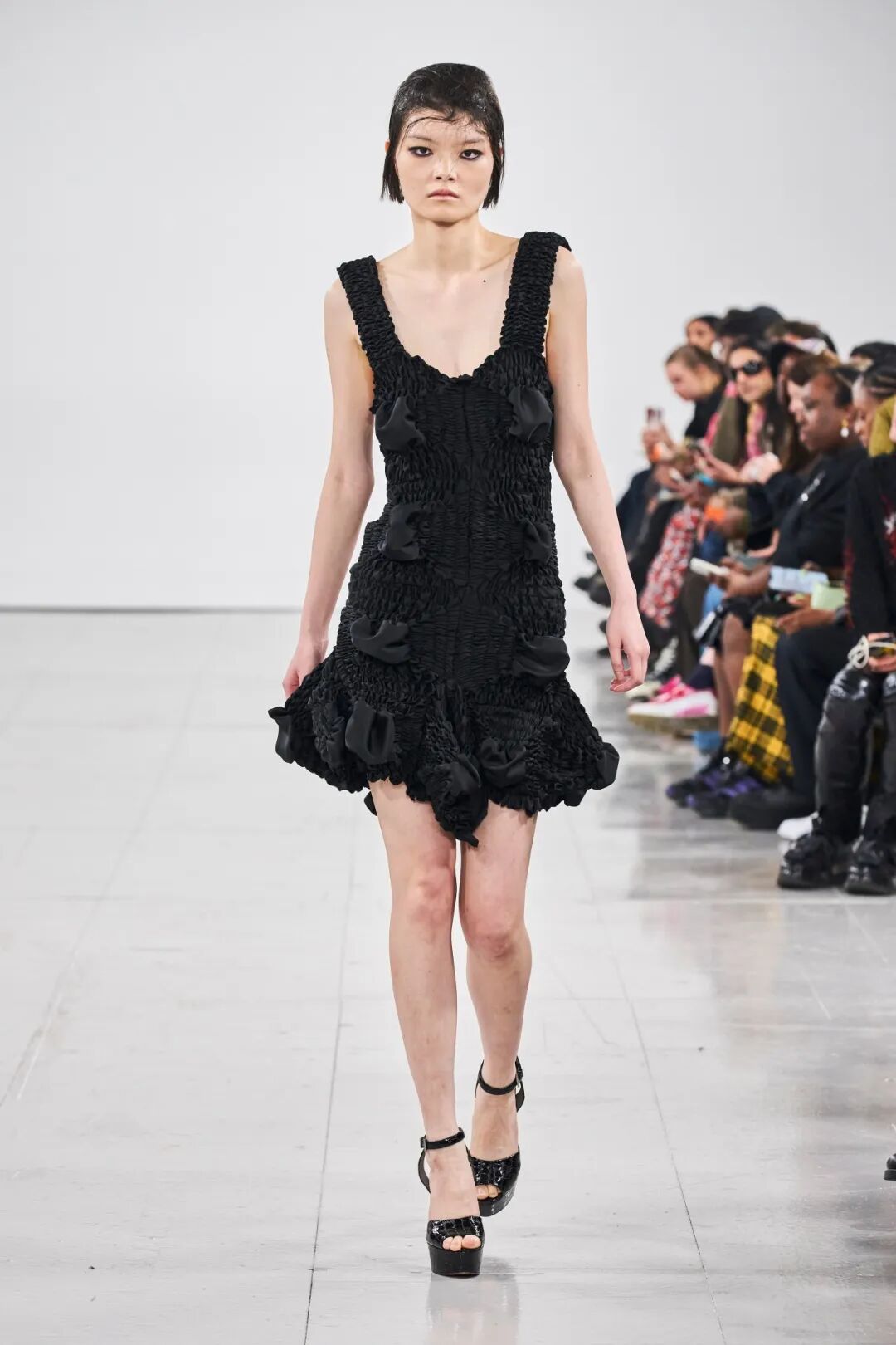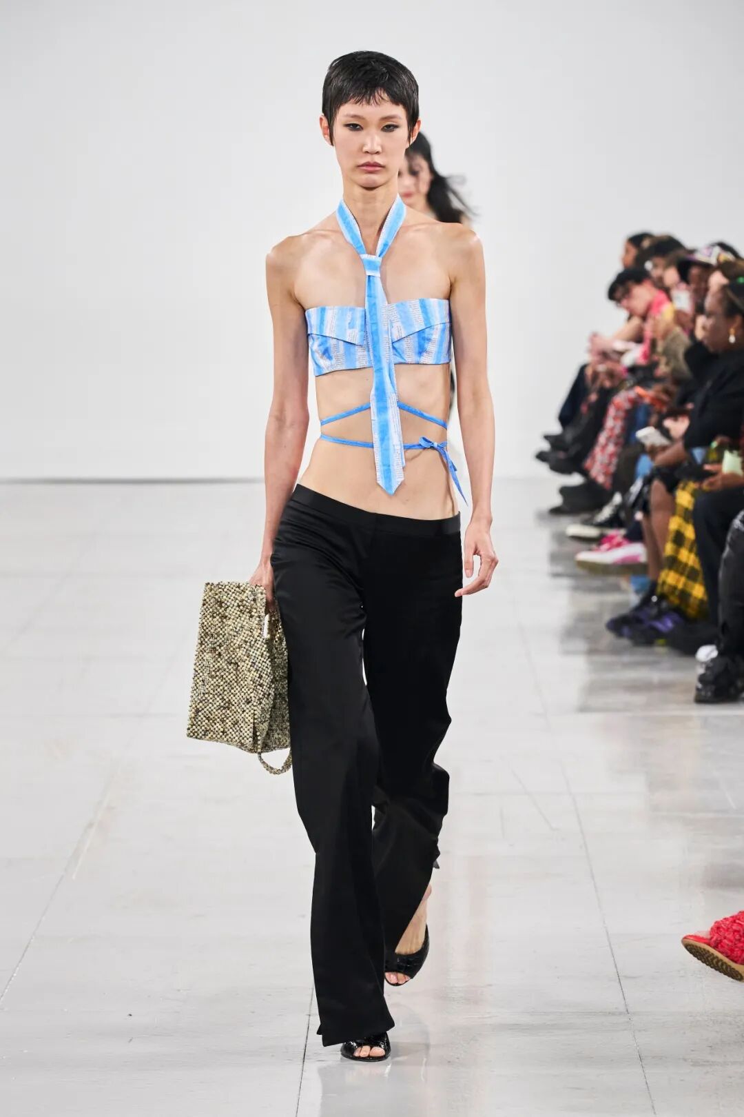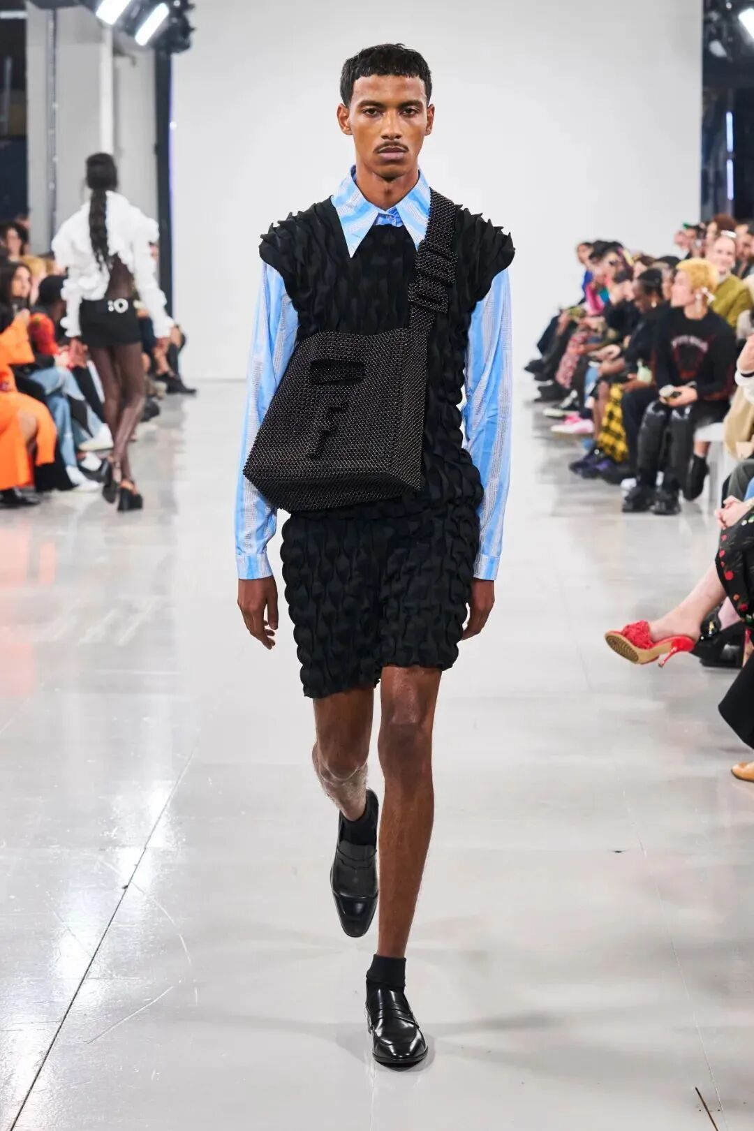 Feben标志性的丝绸扭曲技术,创造出一英里外都能辨认的泡泡纱,在本次秀场被广泛应用,从臀部向外张开的深领中长连衣裙到亮白色的高领露脐上衣,都充分展示了Feben设计的商业潜力,而少数男装造型是设计师阵容中受欢迎的补充。