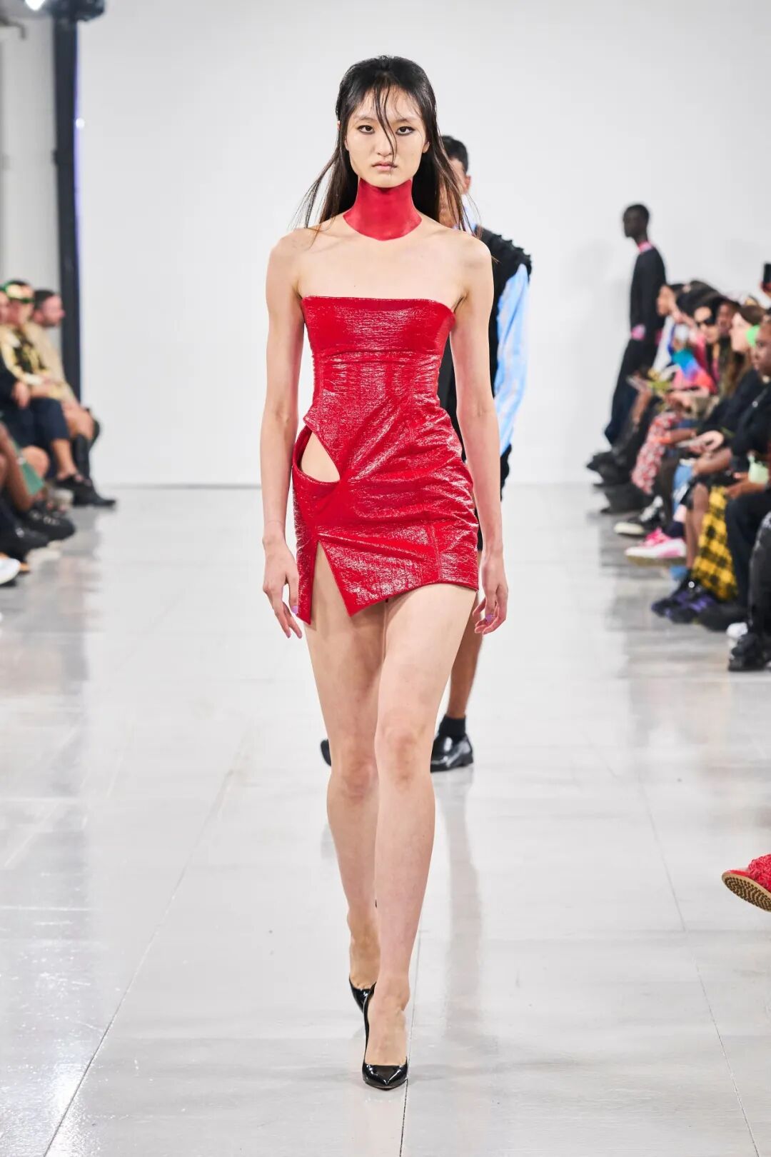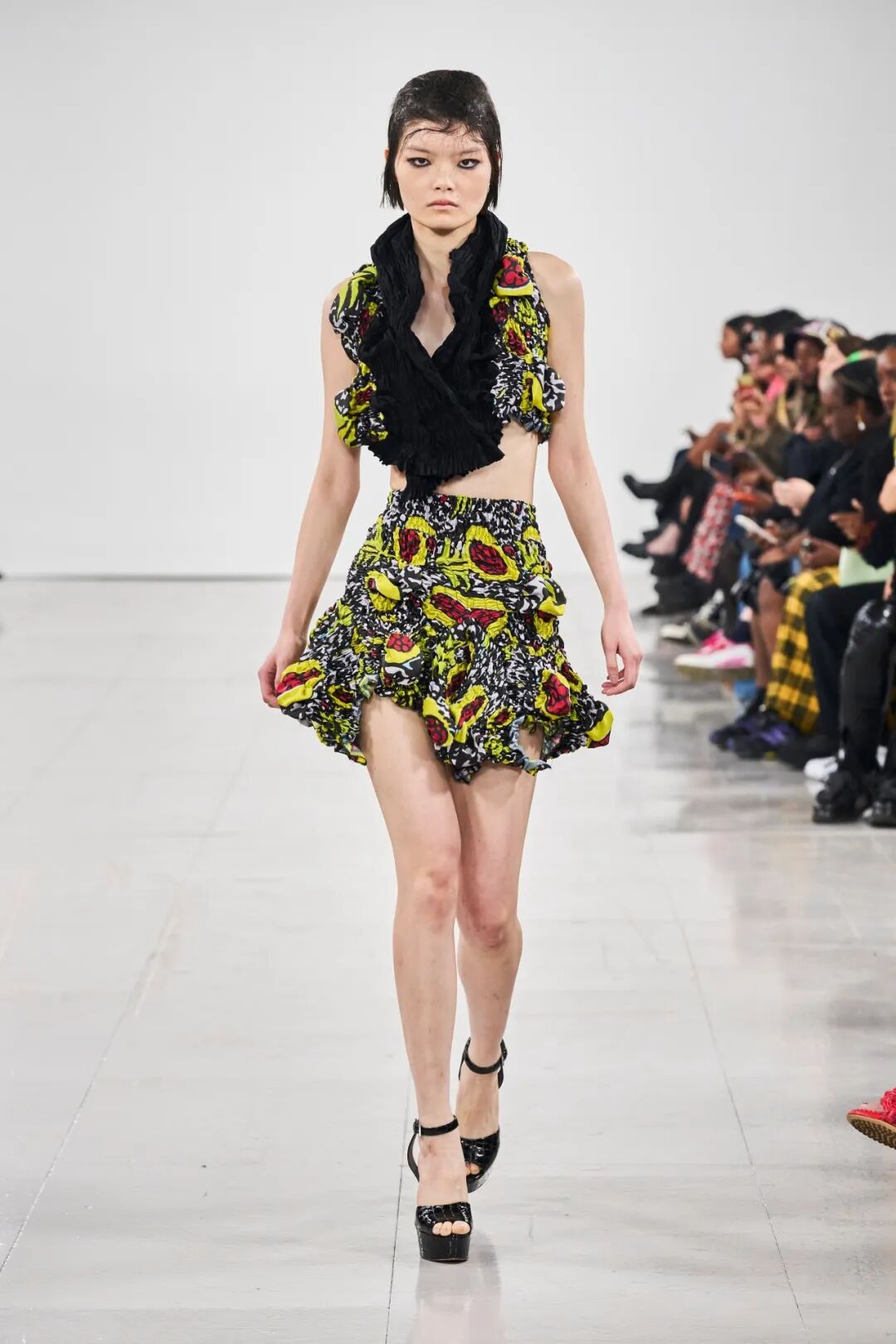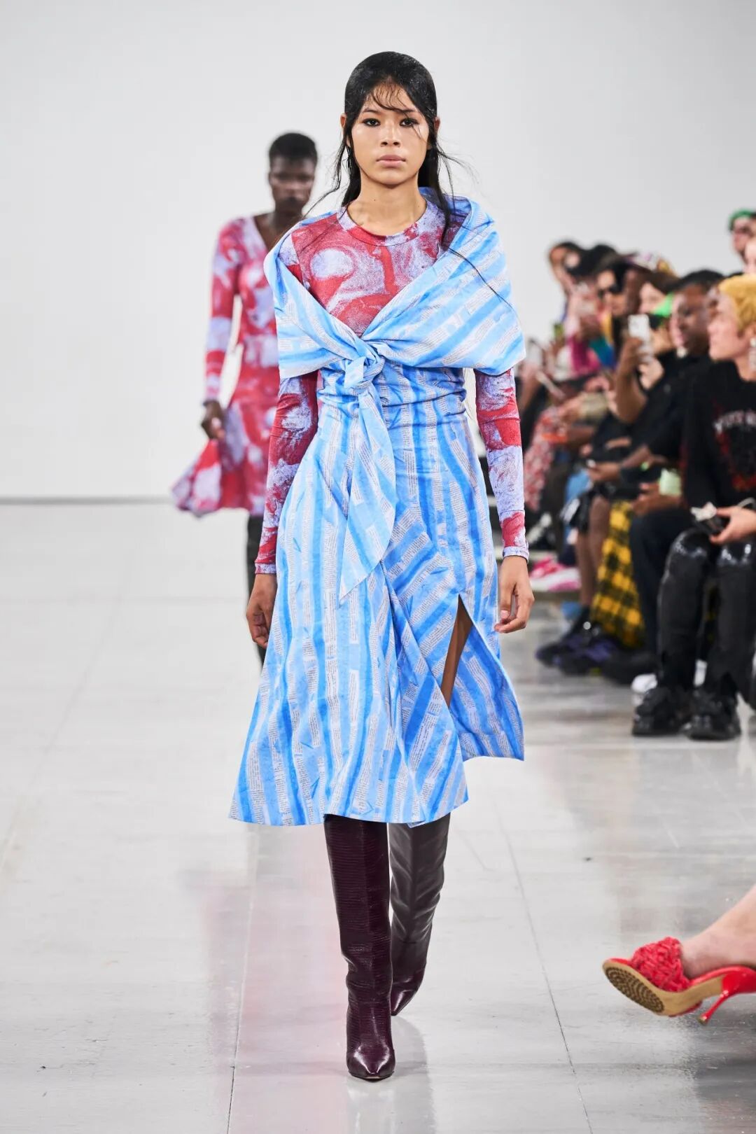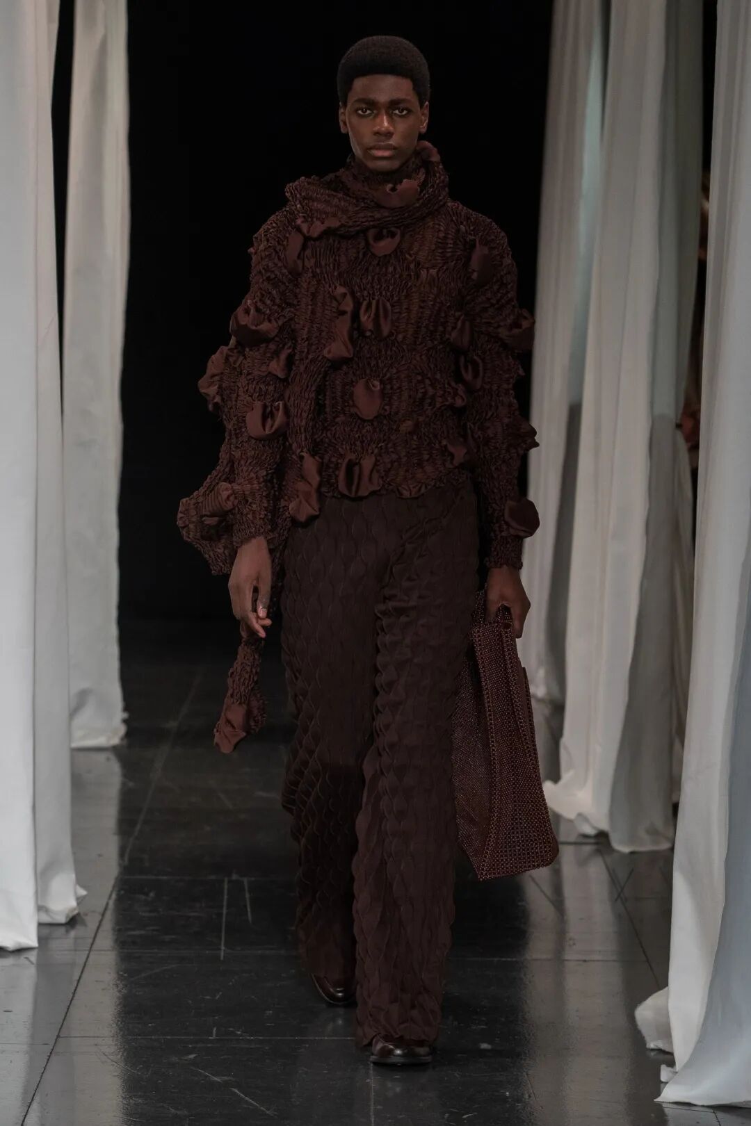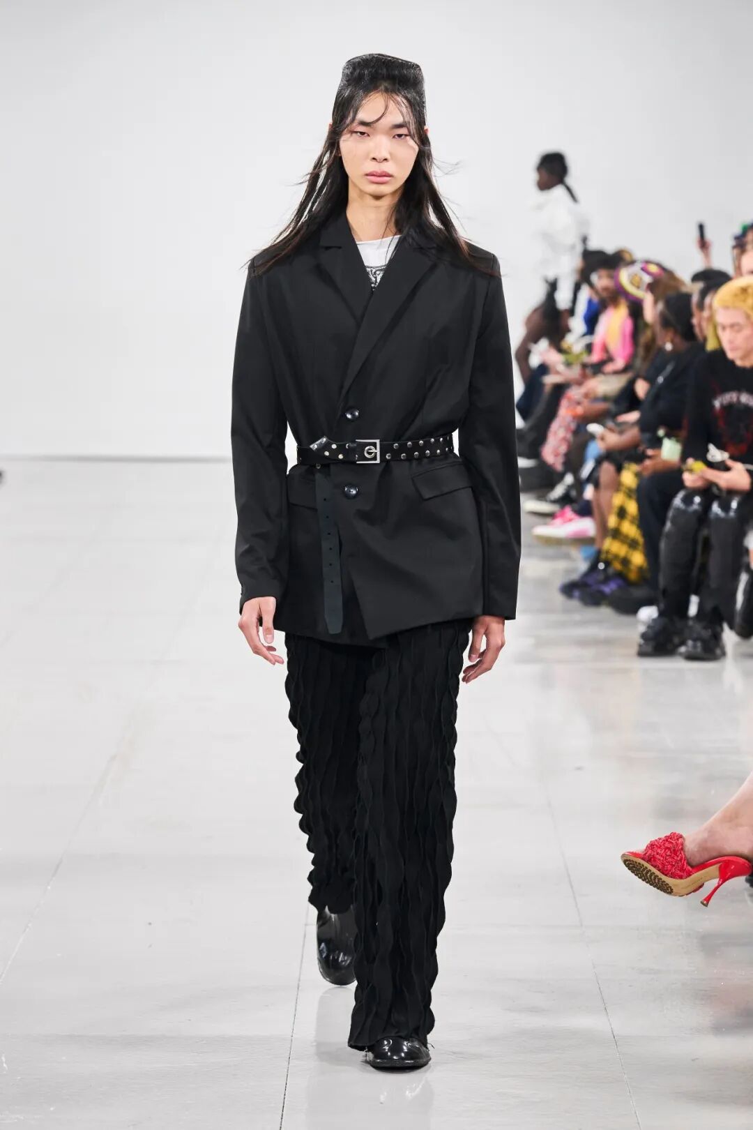 Feben标志性的丝绸扭曲技术,创造出一英里外都能辨认的泡泡纱,在本次秀场被广泛应用,从臀部向外张开的深领中长连衣裙到亮白色的高领露脐上衣,都充分展示了Feben设计的商业潜力,而少数男装造型是设计师阵容中受欢迎的补充。