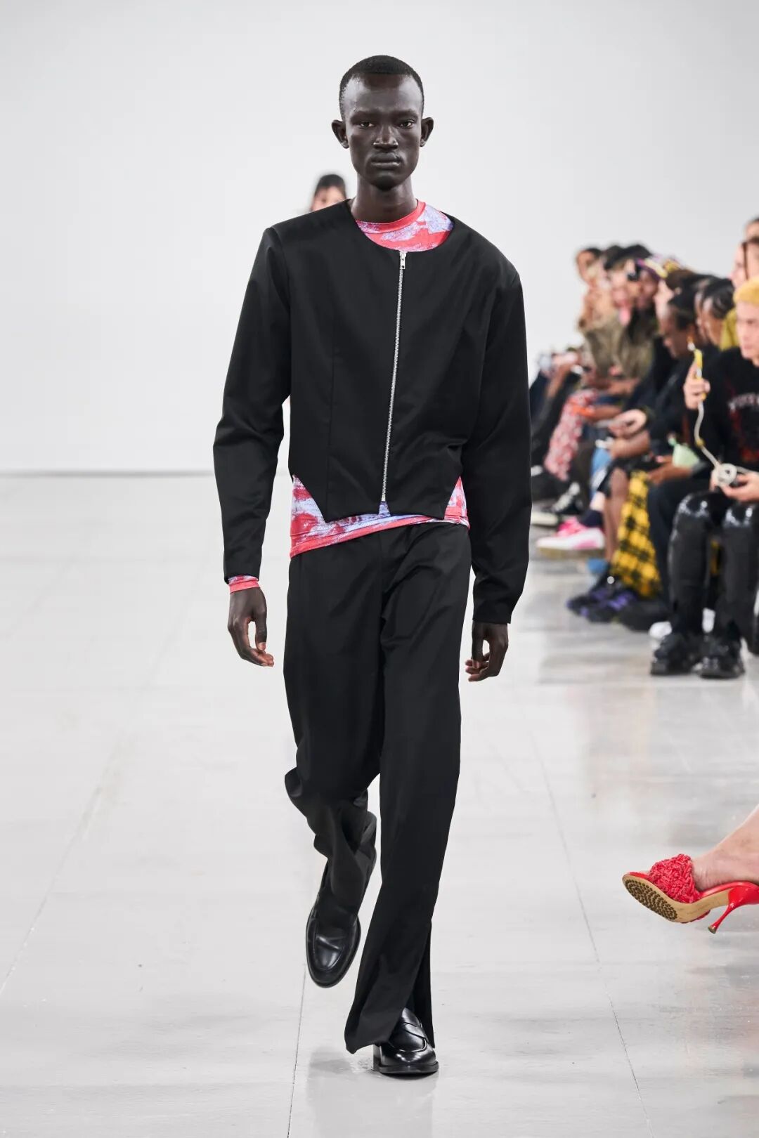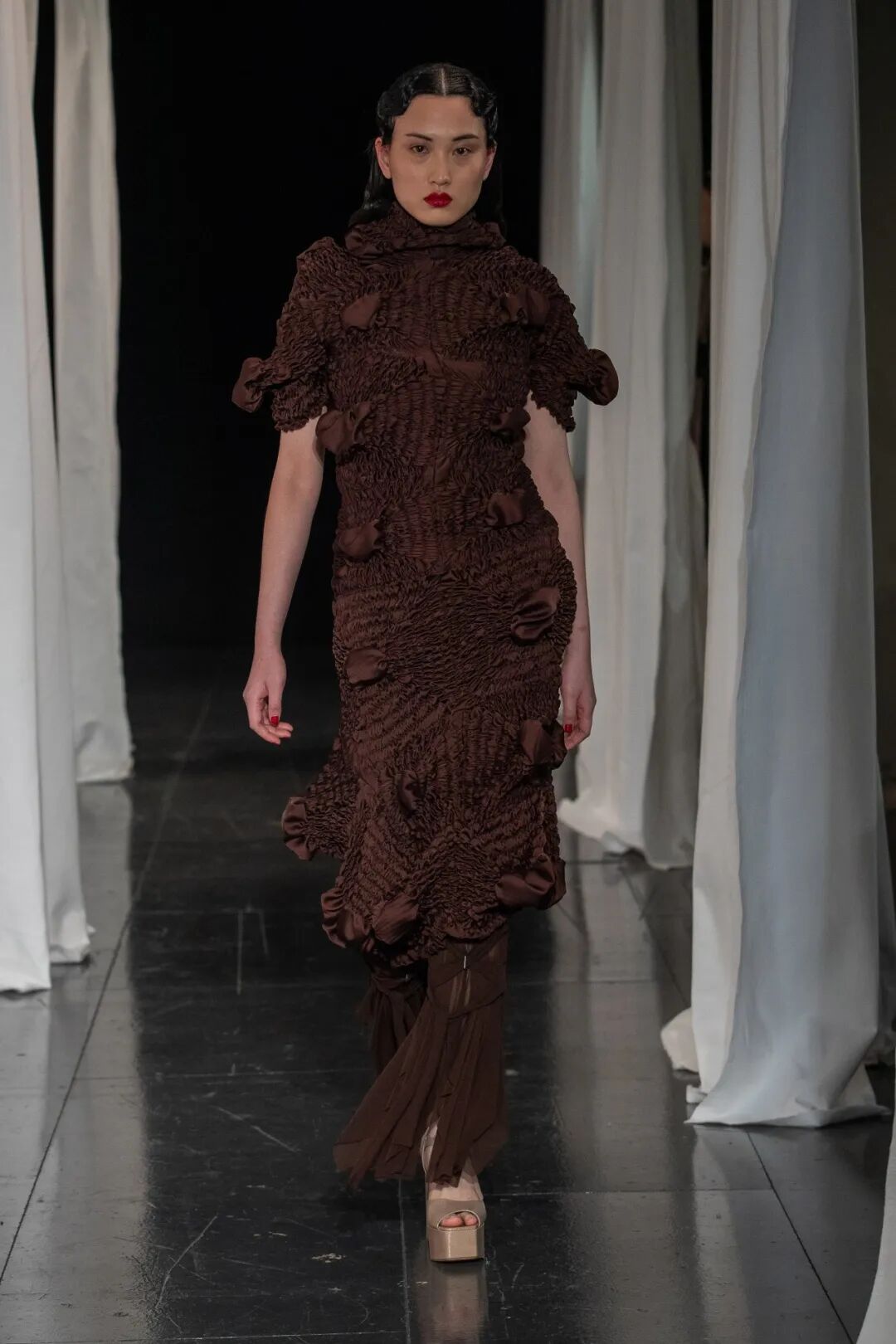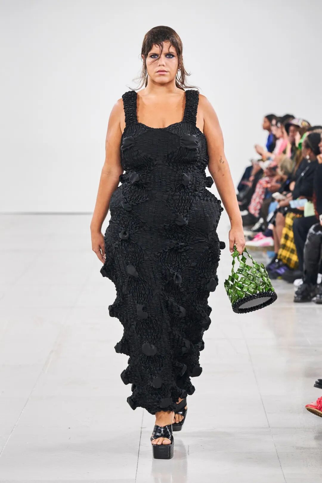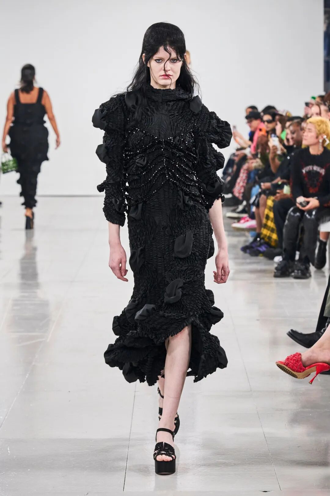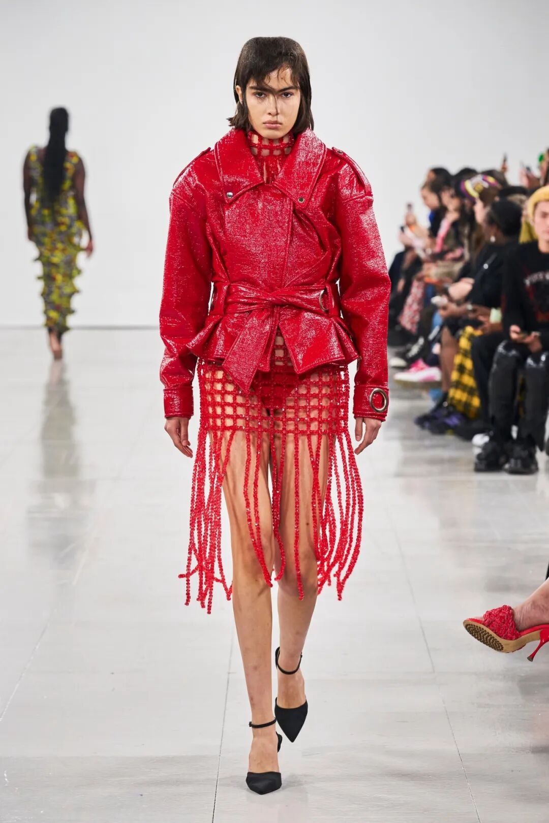 Feben标志性的丝绸扭曲技术,创造出一英里外都能辨认的泡泡纱,在本次秀场被广泛应用,从臀部向外张开的深领中长连衣裙到亮白色的高领露脐上衣,都充分展示了Feben设计的商业潜力,而少数男装造型是设计师阵容中受欢迎的补充。