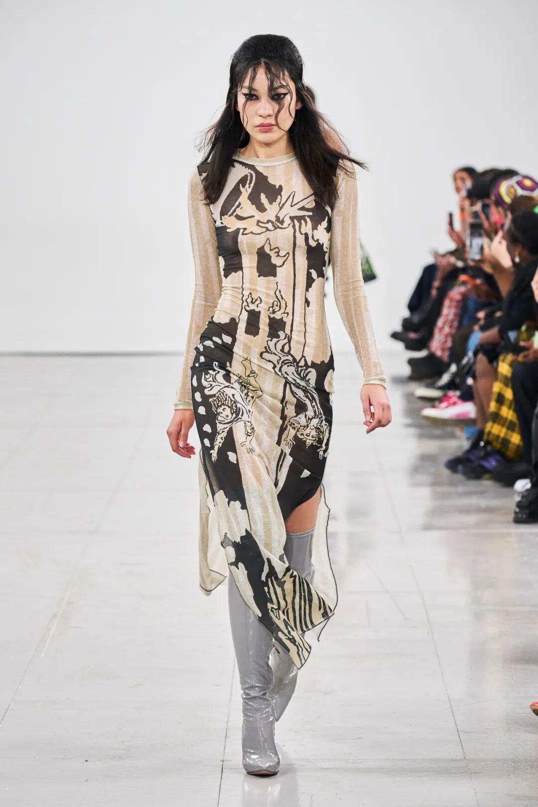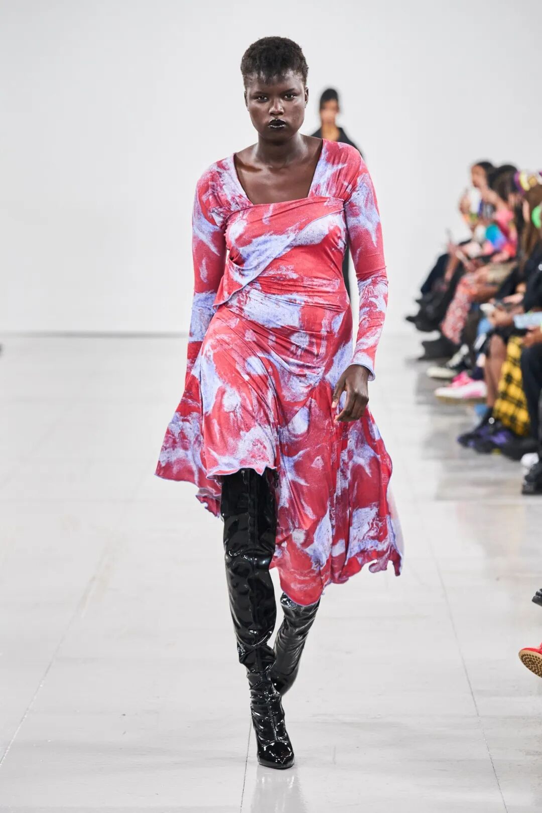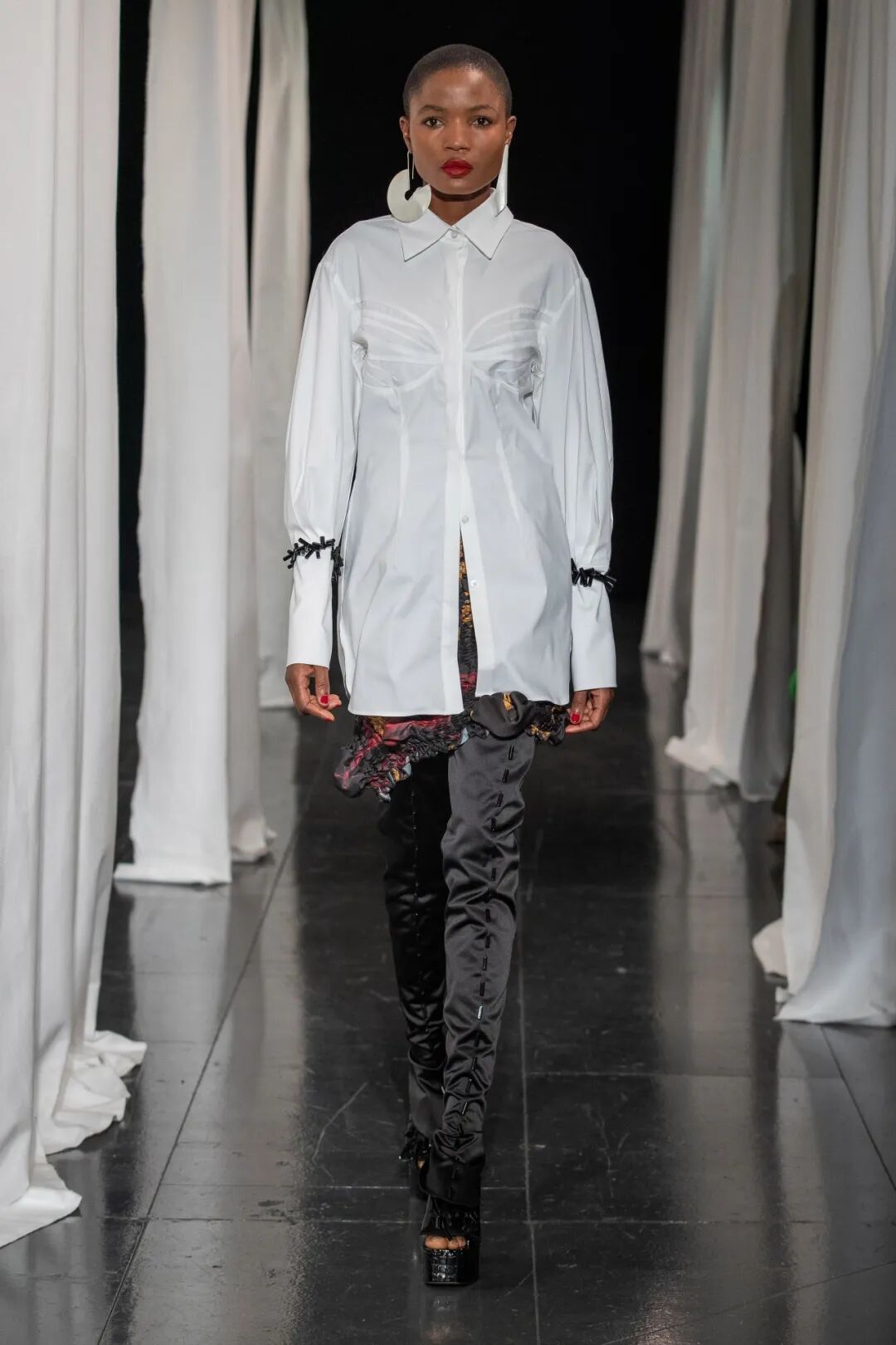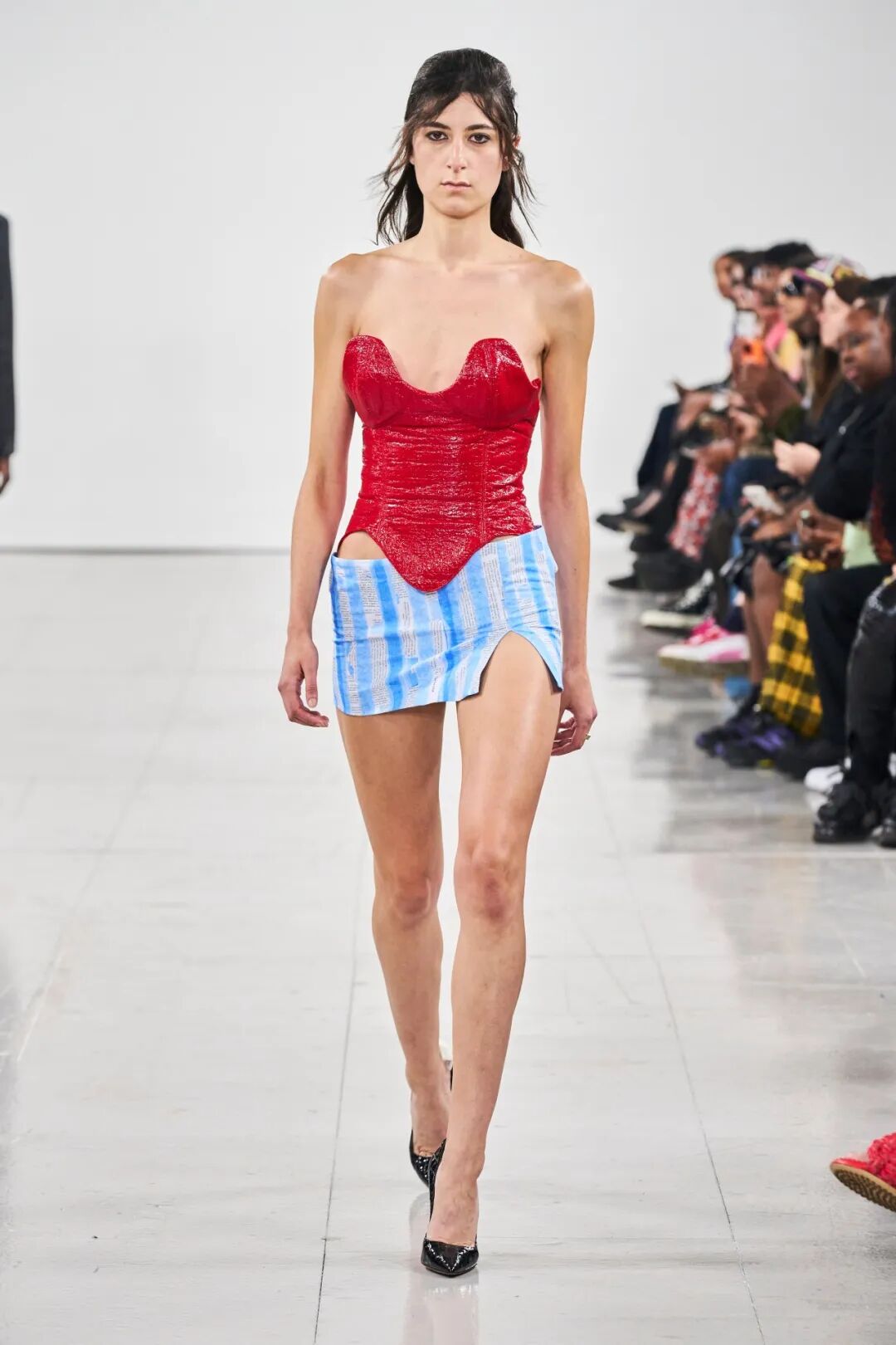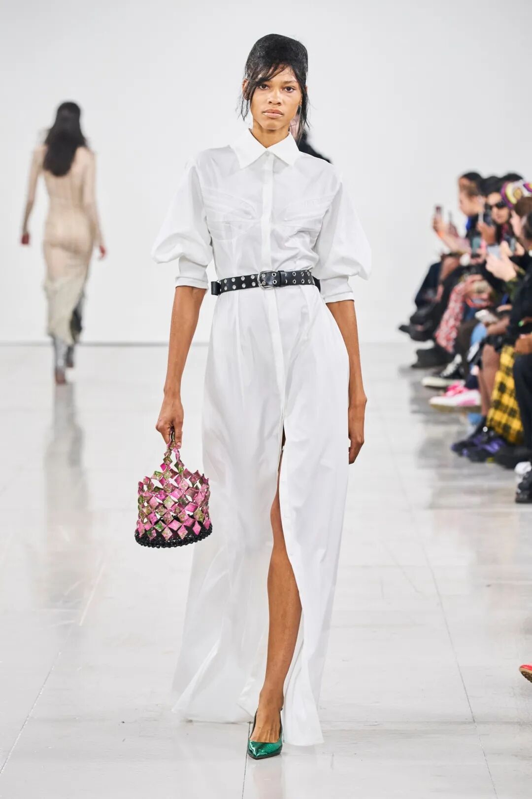Feben标志性的丝绸扭曲技术,创造出一英里外都能辨认的泡泡纱,在本次秀场被广泛应用,从臀部向外张开的深领中长连衣裙到亮白色的高领露脐上衣,都充分展示了Feben设计的商业潜力,而少数男装造型是设计师阵容中受欢迎的补充。