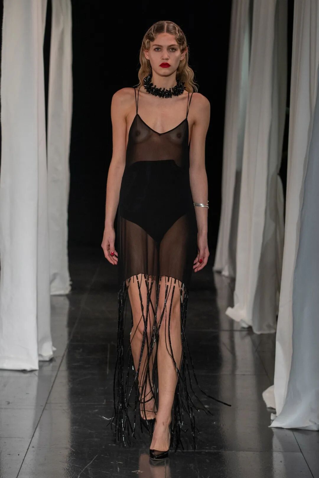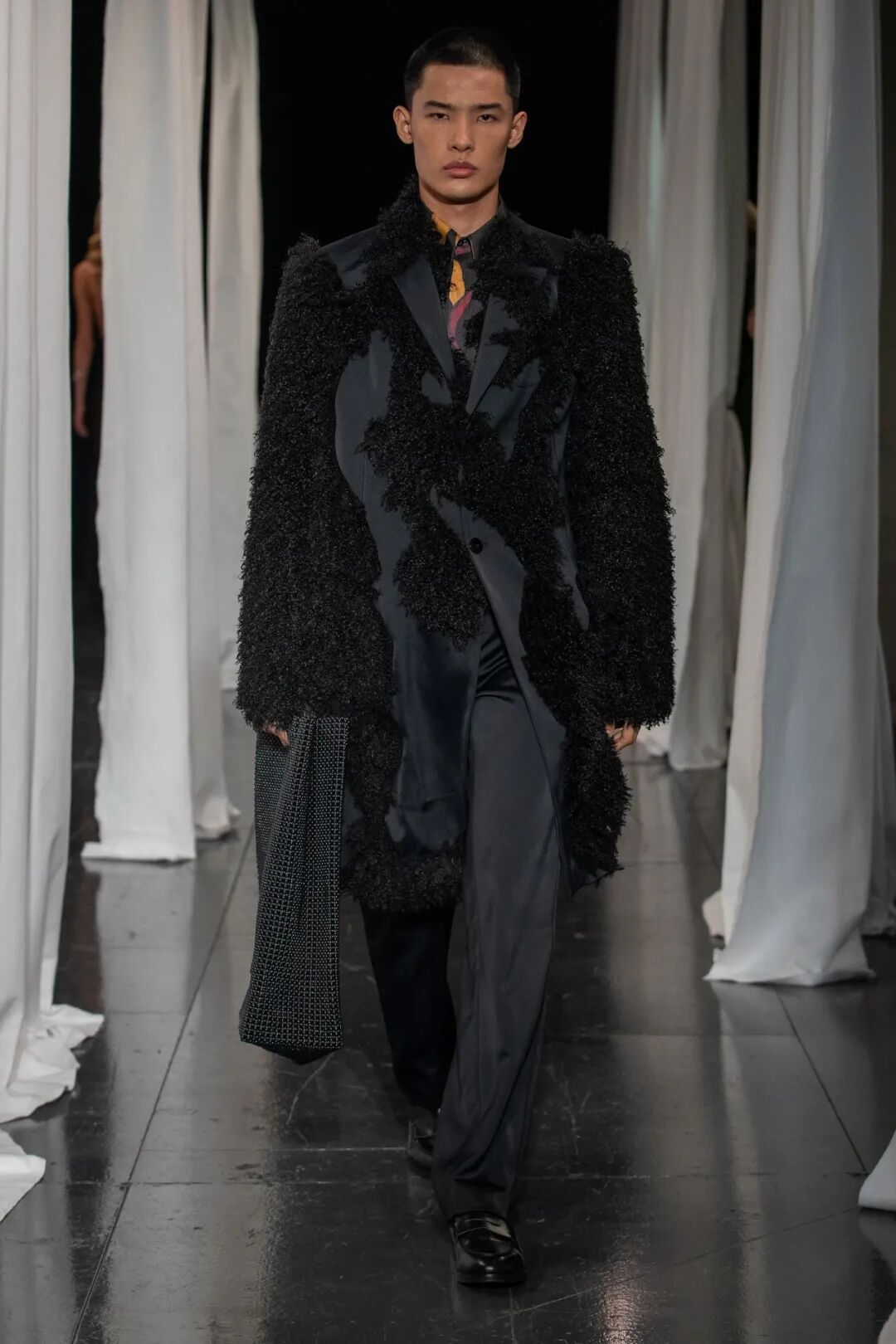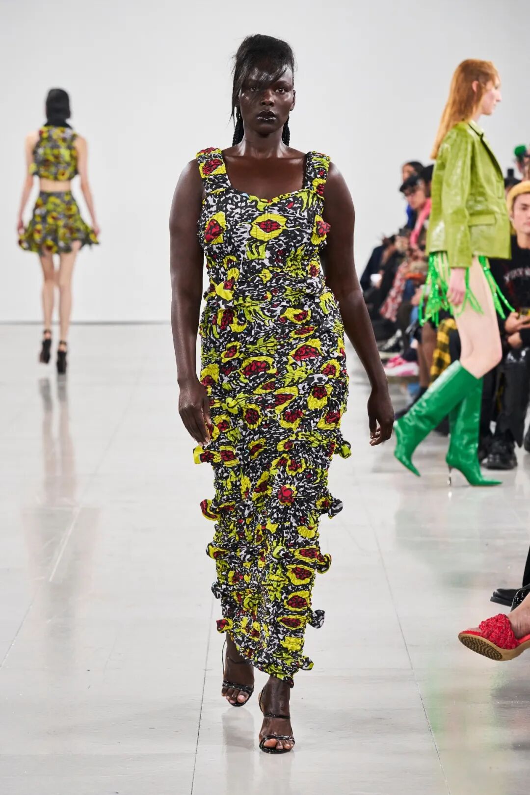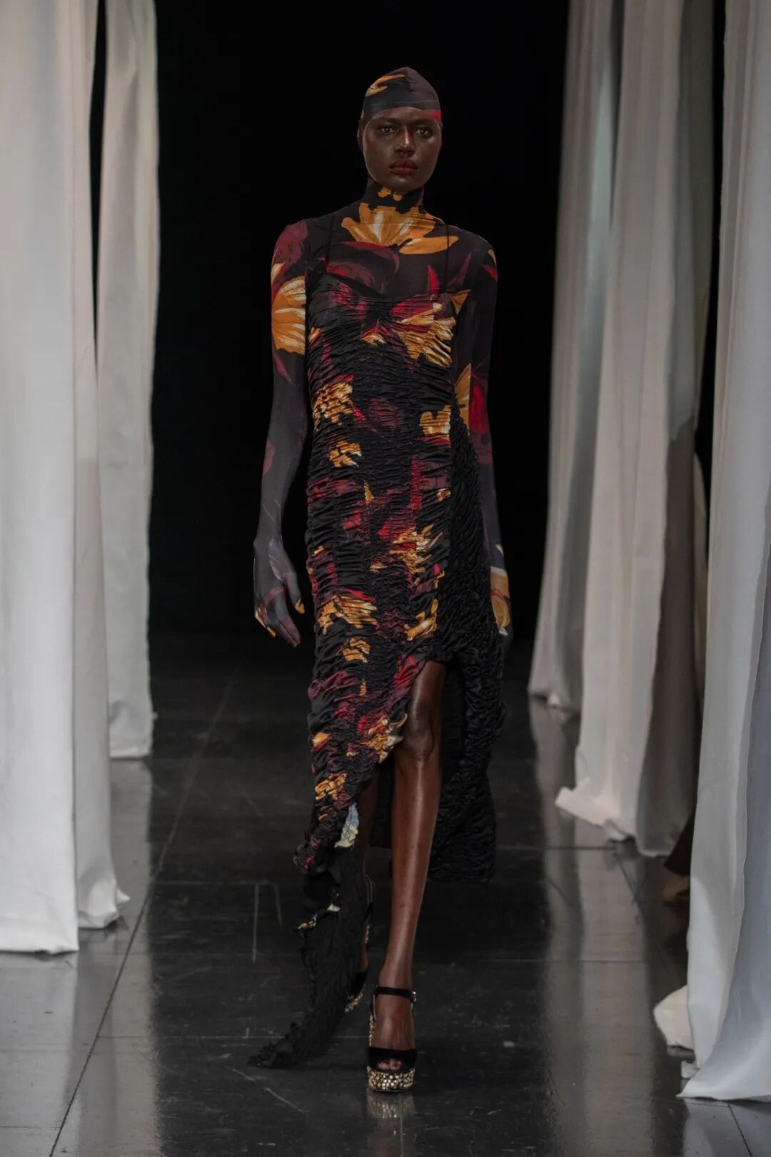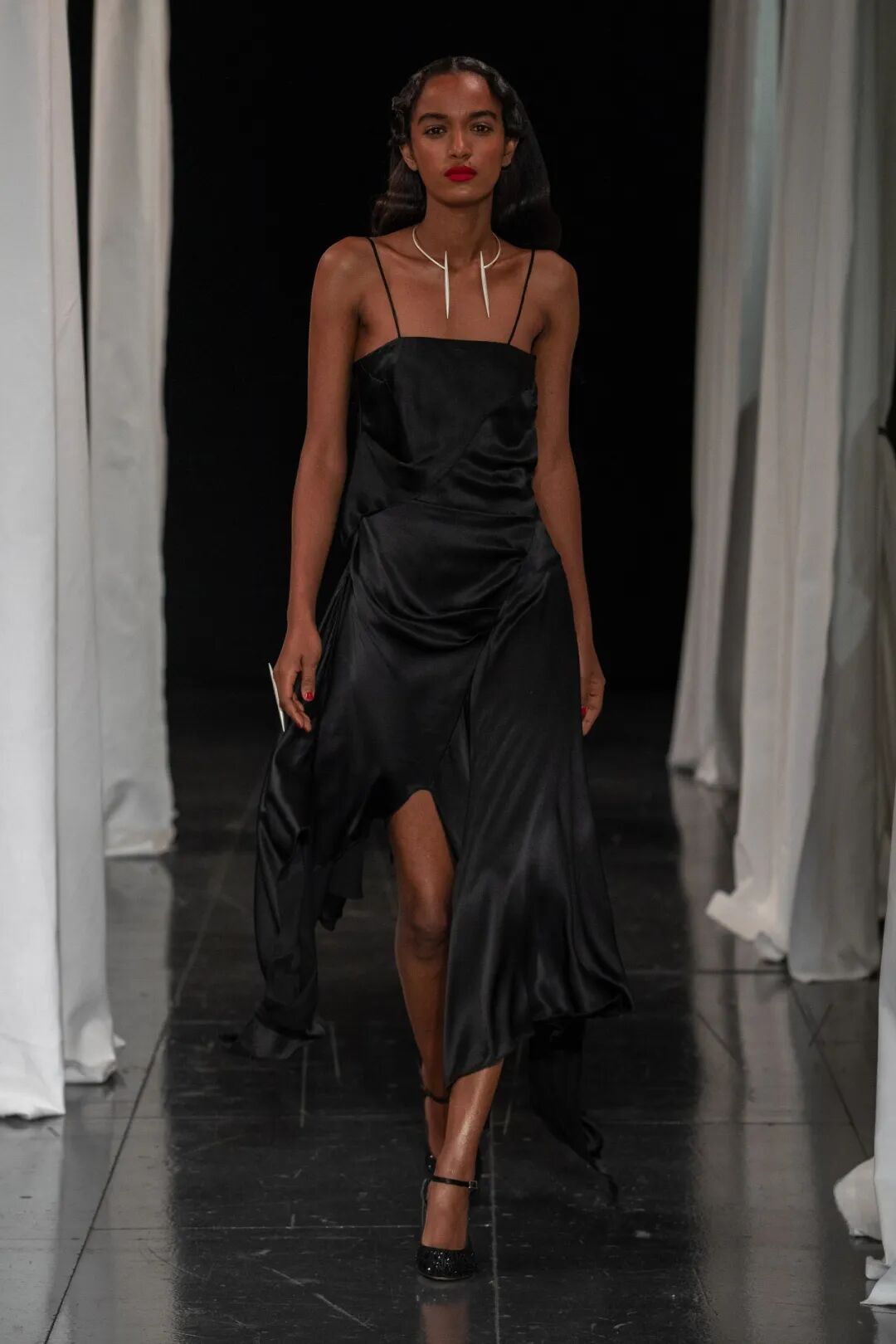Feben标志性的丝绸扭曲技术,创造出一英里外都能辨认的泡泡纱,在本次秀场被广泛应用,从臀部向外张开的深领中长连衣裙到亮白色的高领露脐上衣,都充分展示了Feben设计的商业潜力,而少数男装造型是设计师阵容中受欢迎的补充。