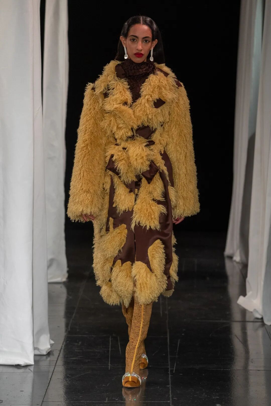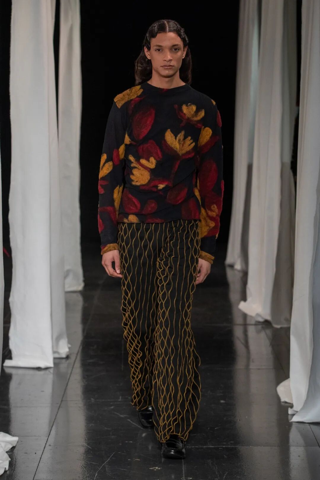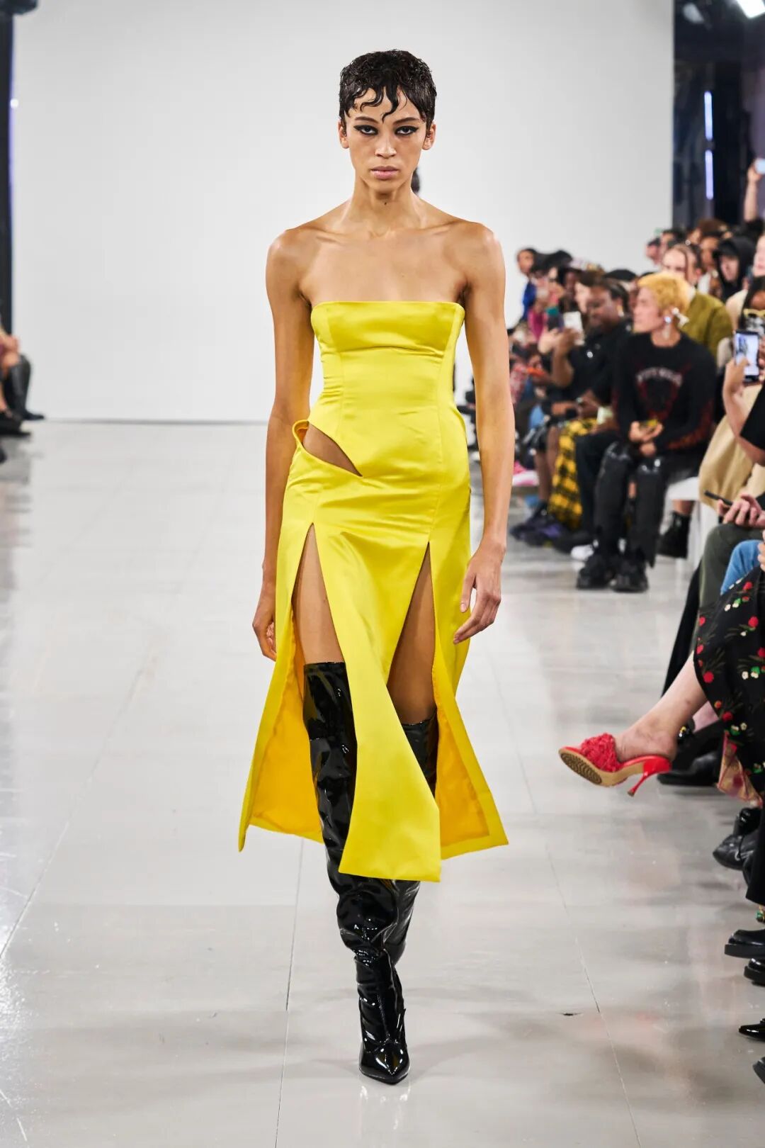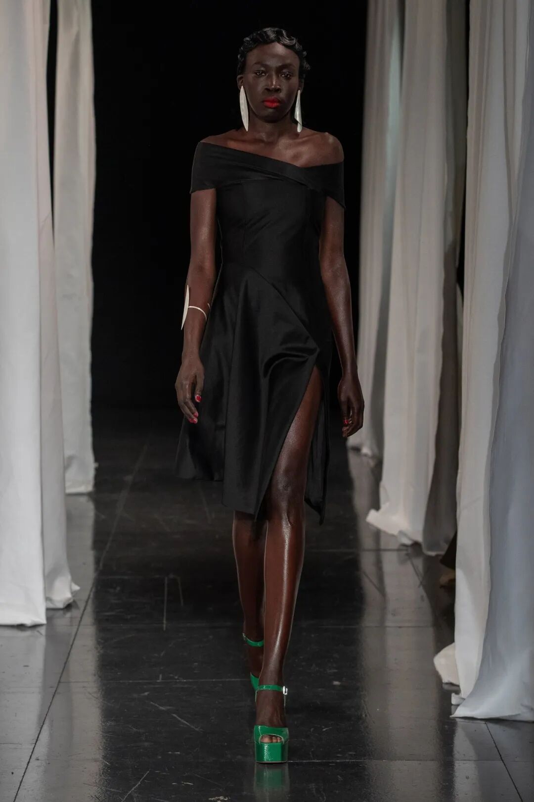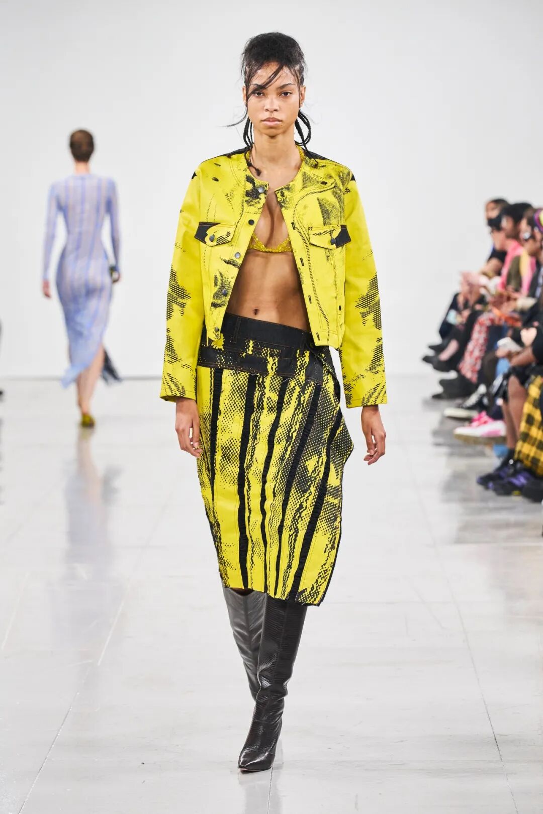 Feben标志性的丝绸扭曲技术,创造出一英里外都能辨认的泡泡纱,在本次秀场被广泛应用,从臀部向外张开的深领中长连衣裙到亮白色的高领露脐上衣,都充分展示了Feben设计的商业潜力,而少数男装造型是设计师阵容中受欢迎的补充。