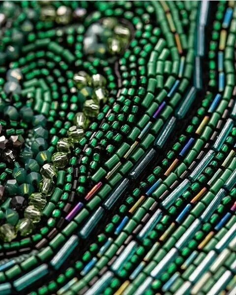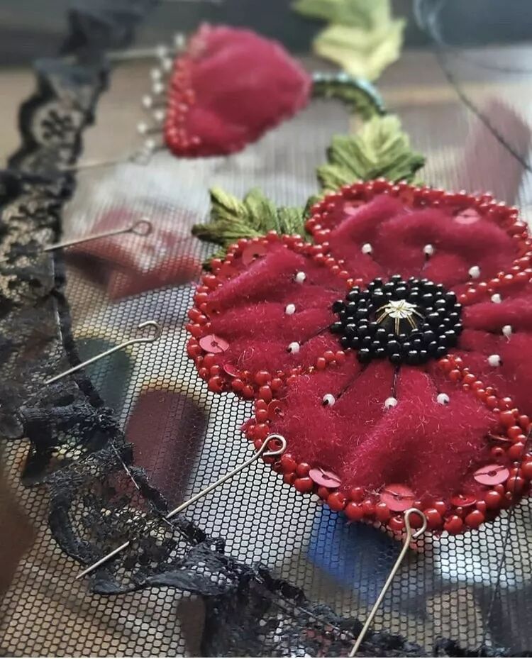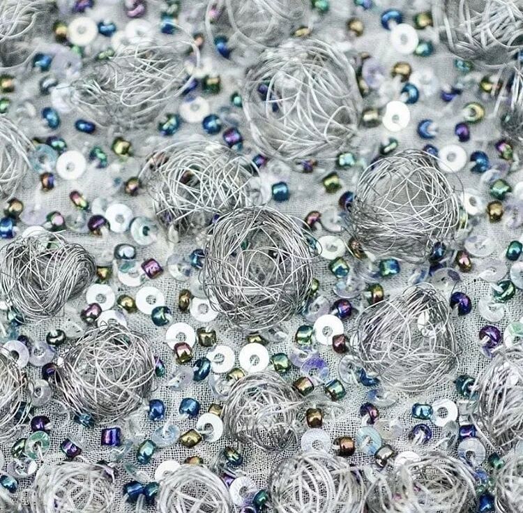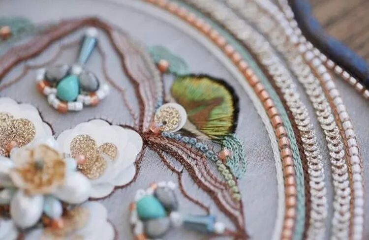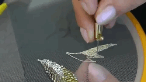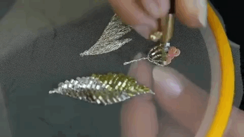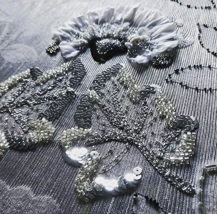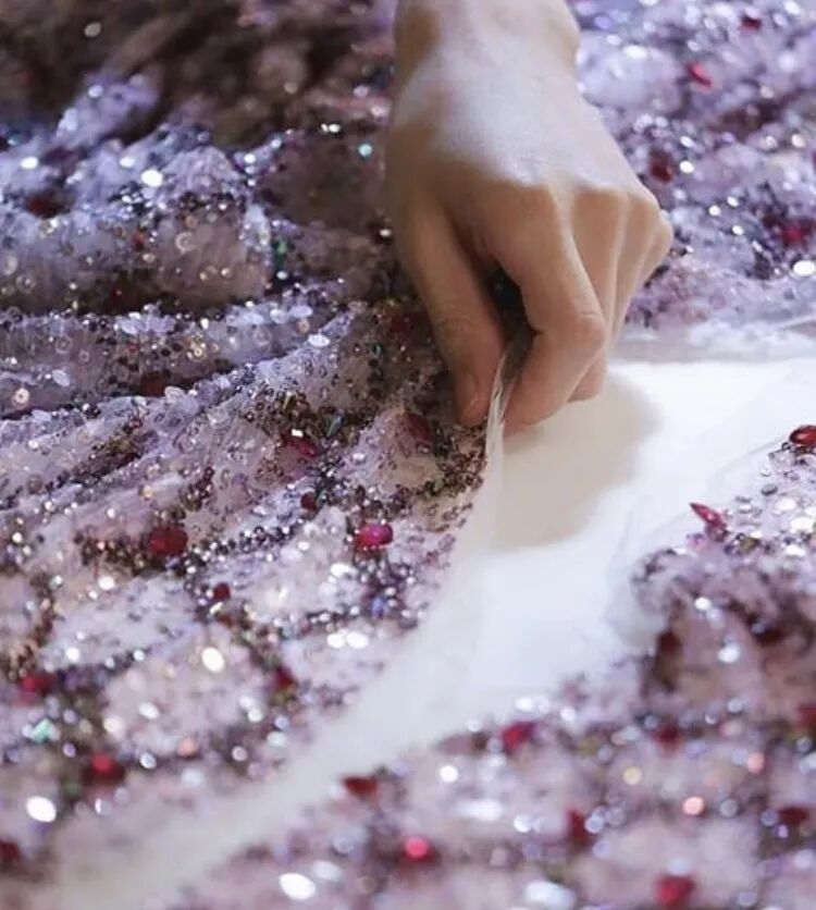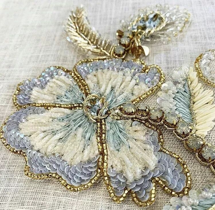 法式刺绣是运用一种名叫Lunéville的独特钩针进行隐藏性的反面刺绣,同时结合各种手针刺绣的针法用丝线将亮片、缎带、宝石、珍珠…等丰富的材料结合在一起。