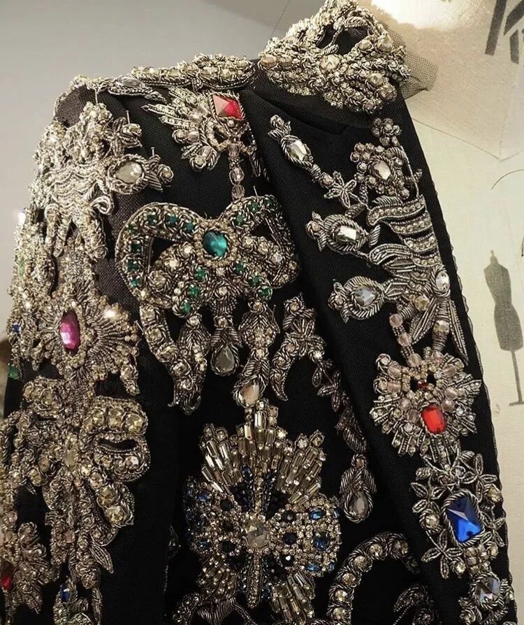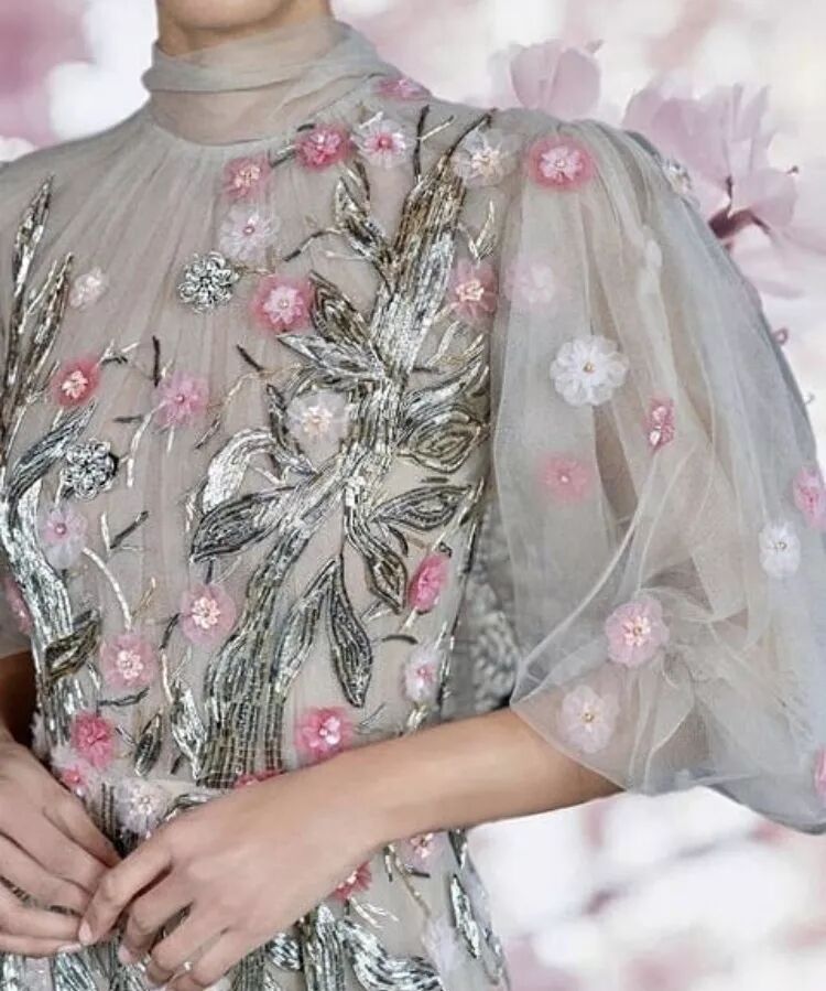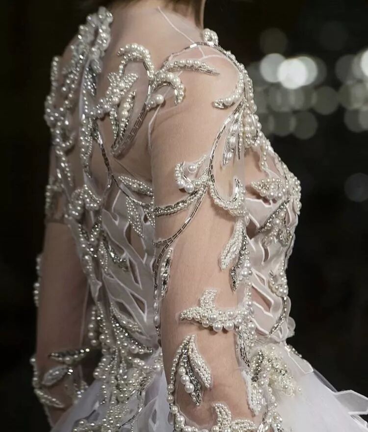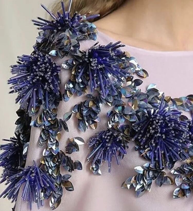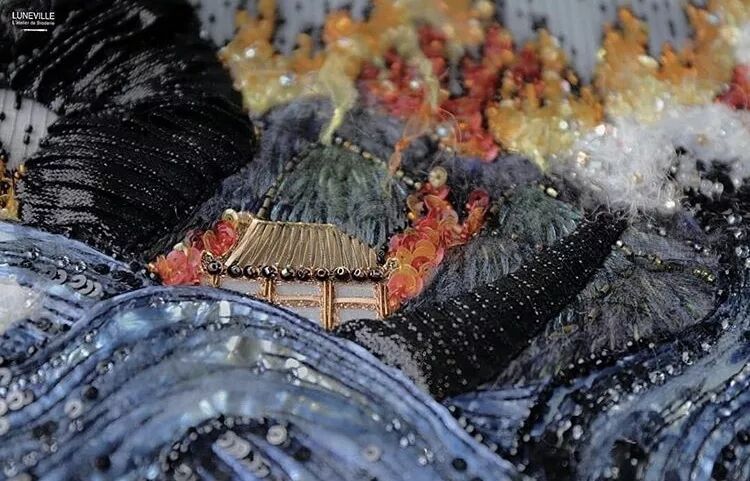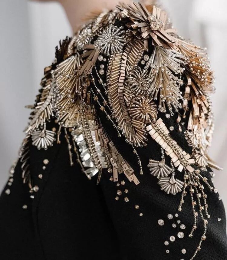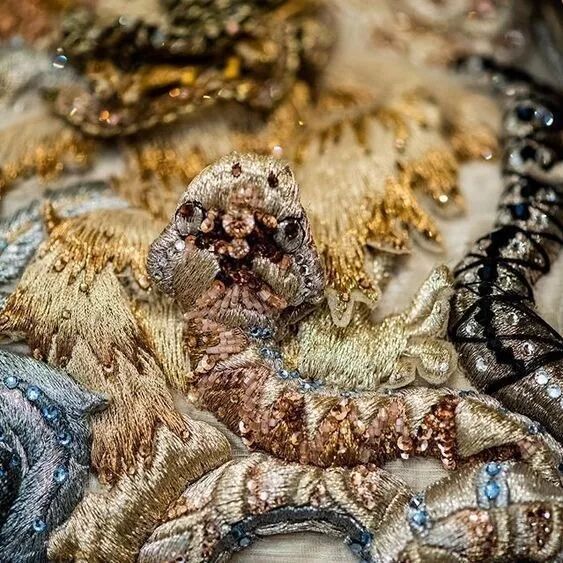 如果是中式的秀是一幅画,那么法式的刺绣就是一件雕塑。法式刺绣注重用各种材料构造出立体感,或是宝石、或是珍珠,空间上的设计是法式刺绣的玄妙之处。