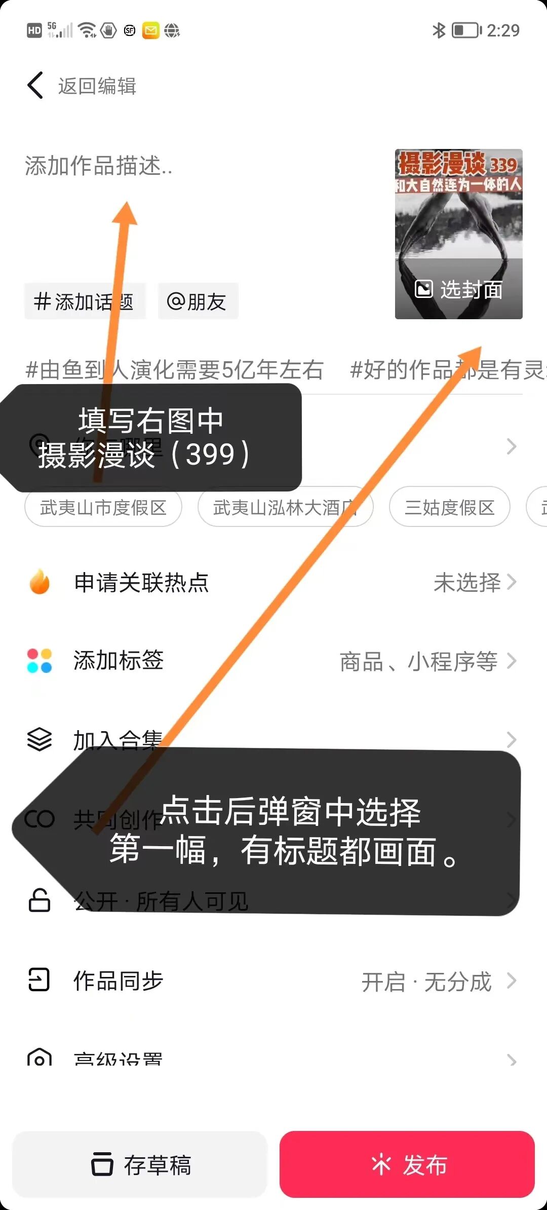 第二步:1、编辑文字标题:摄影漫谈(xxxx) 或者柒谈怪论(xxx)具体是什么,看视频第一页图片上写的。2、点击右上角相应视频小框子中的“选择封面”,选择并保存第一帧图片做封面。
