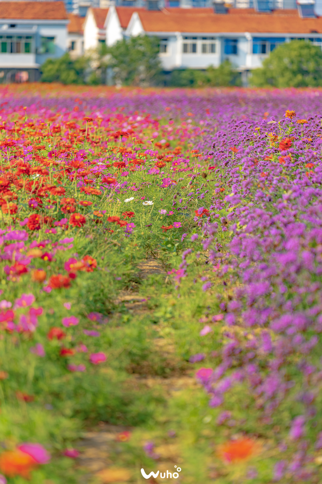 斑斓的花海顺着山坡起伏,远处高楼林立,工业风景和田园油画同框。