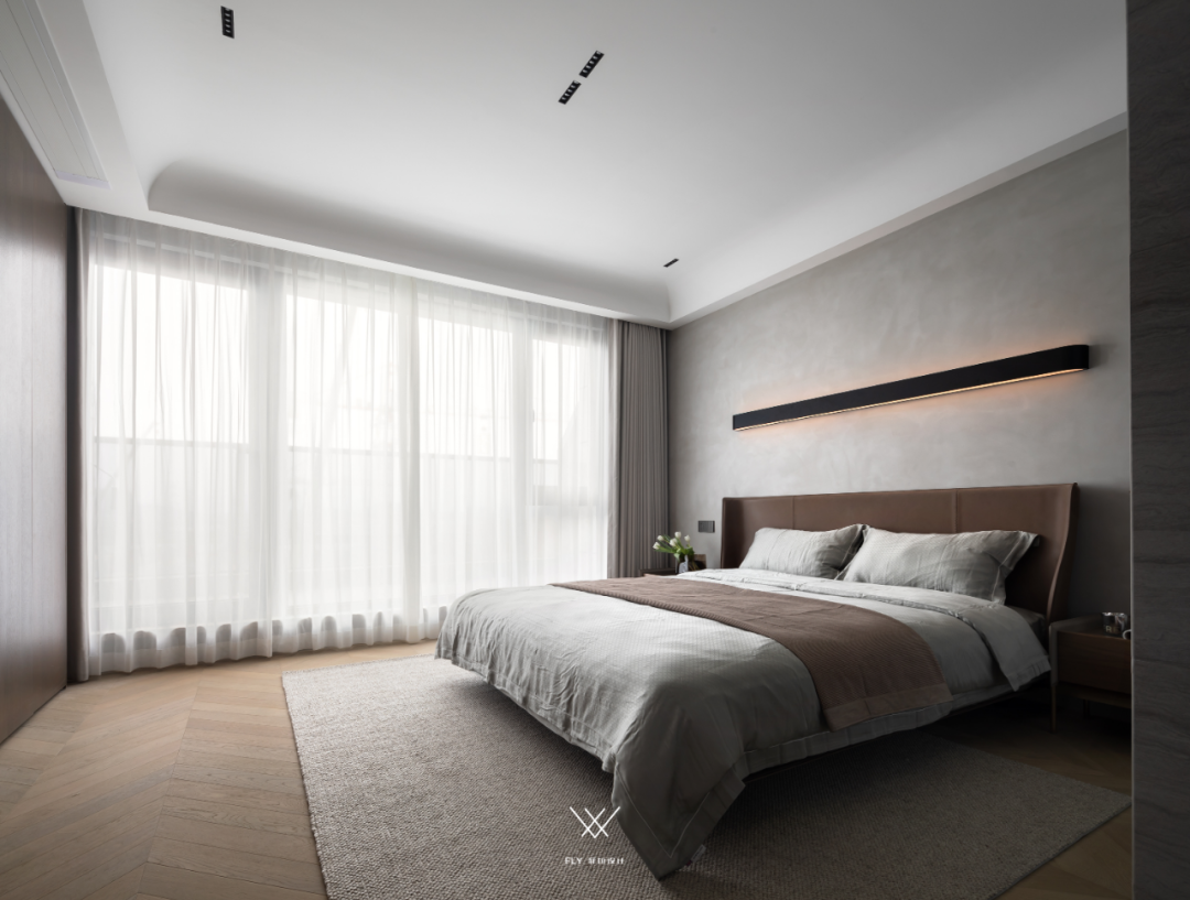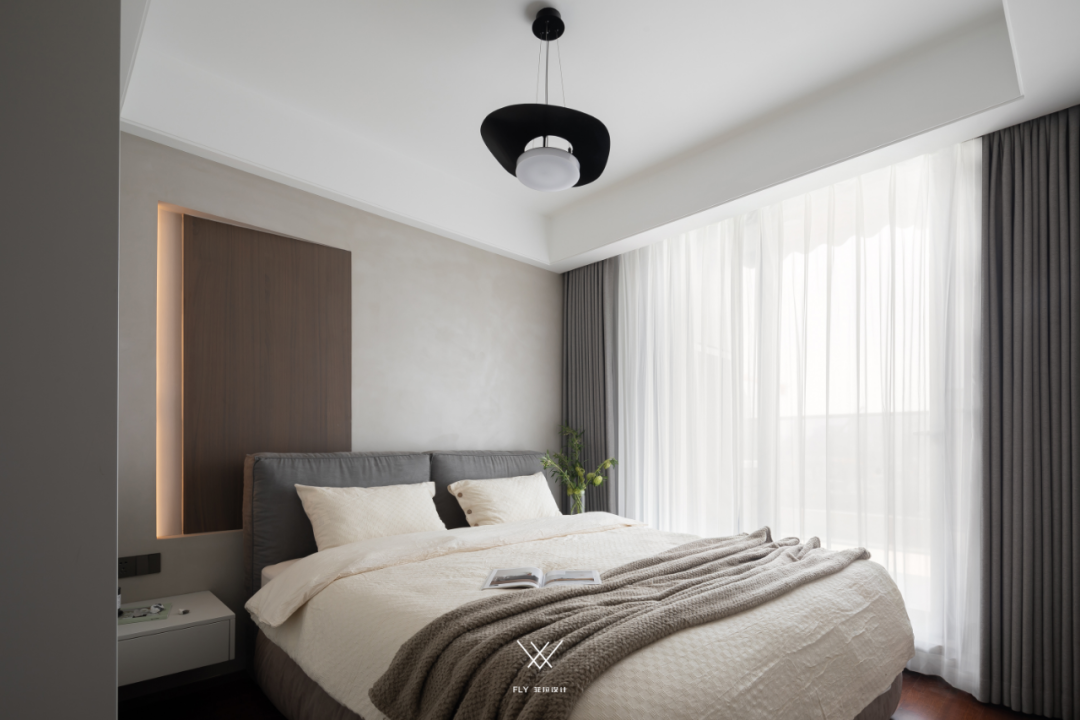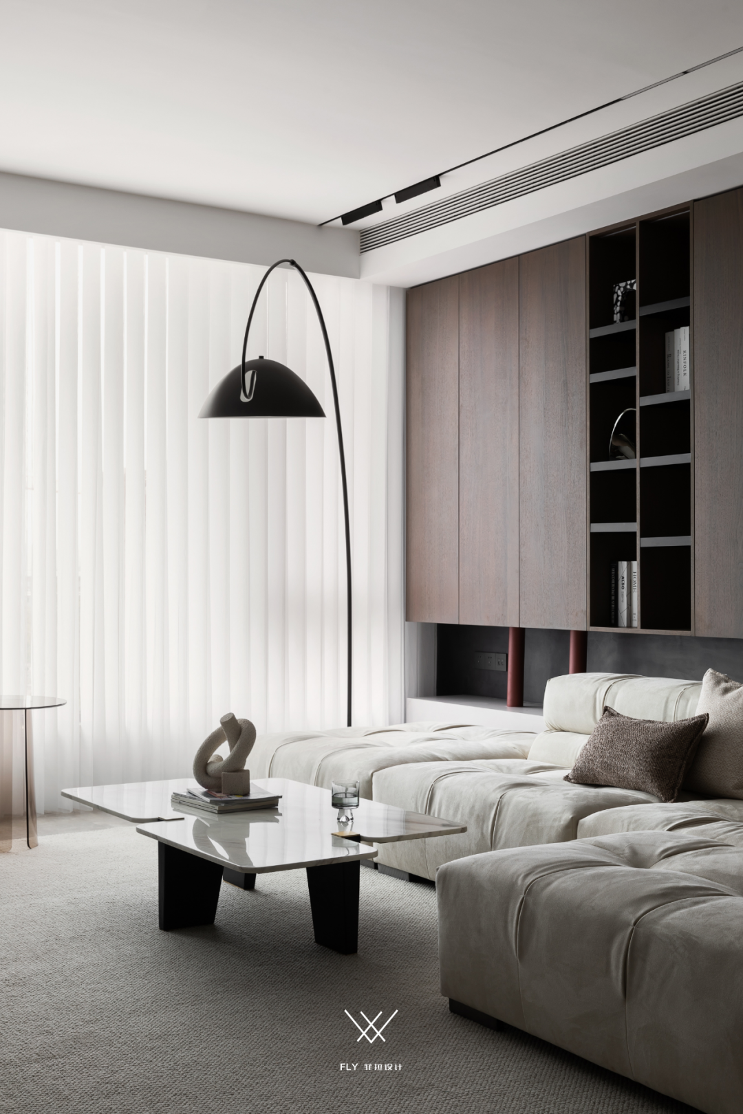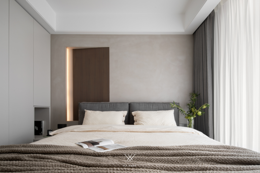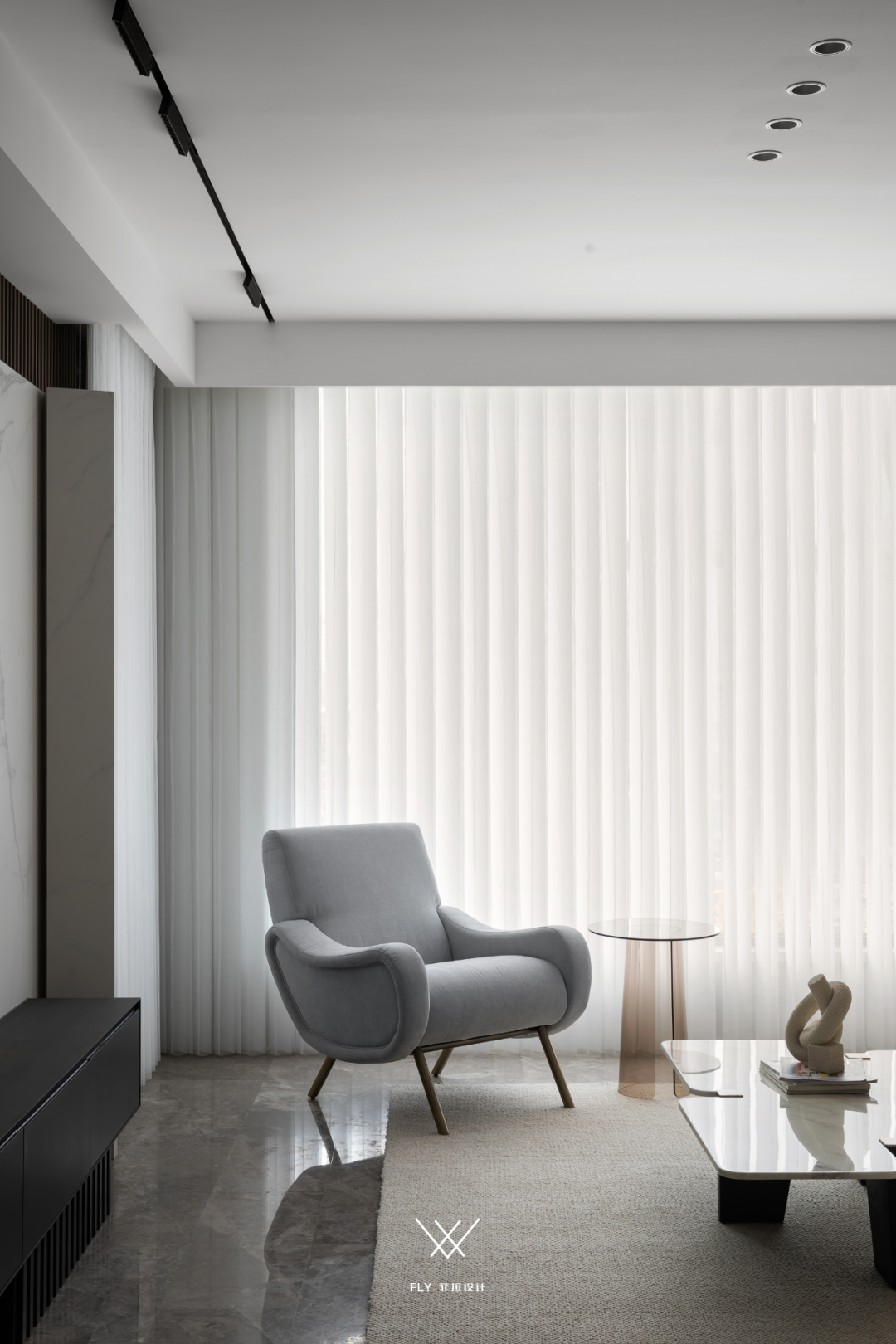 优化空间区域的完整性,次卧入口做隐形处理与电视背景墙融为一体,右侧阳台门以窗帘为掩做视觉清理,以纯粹的比例塑造空间感受。