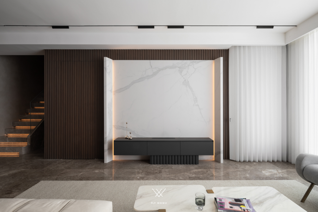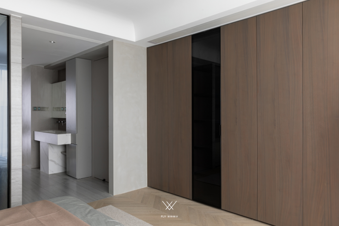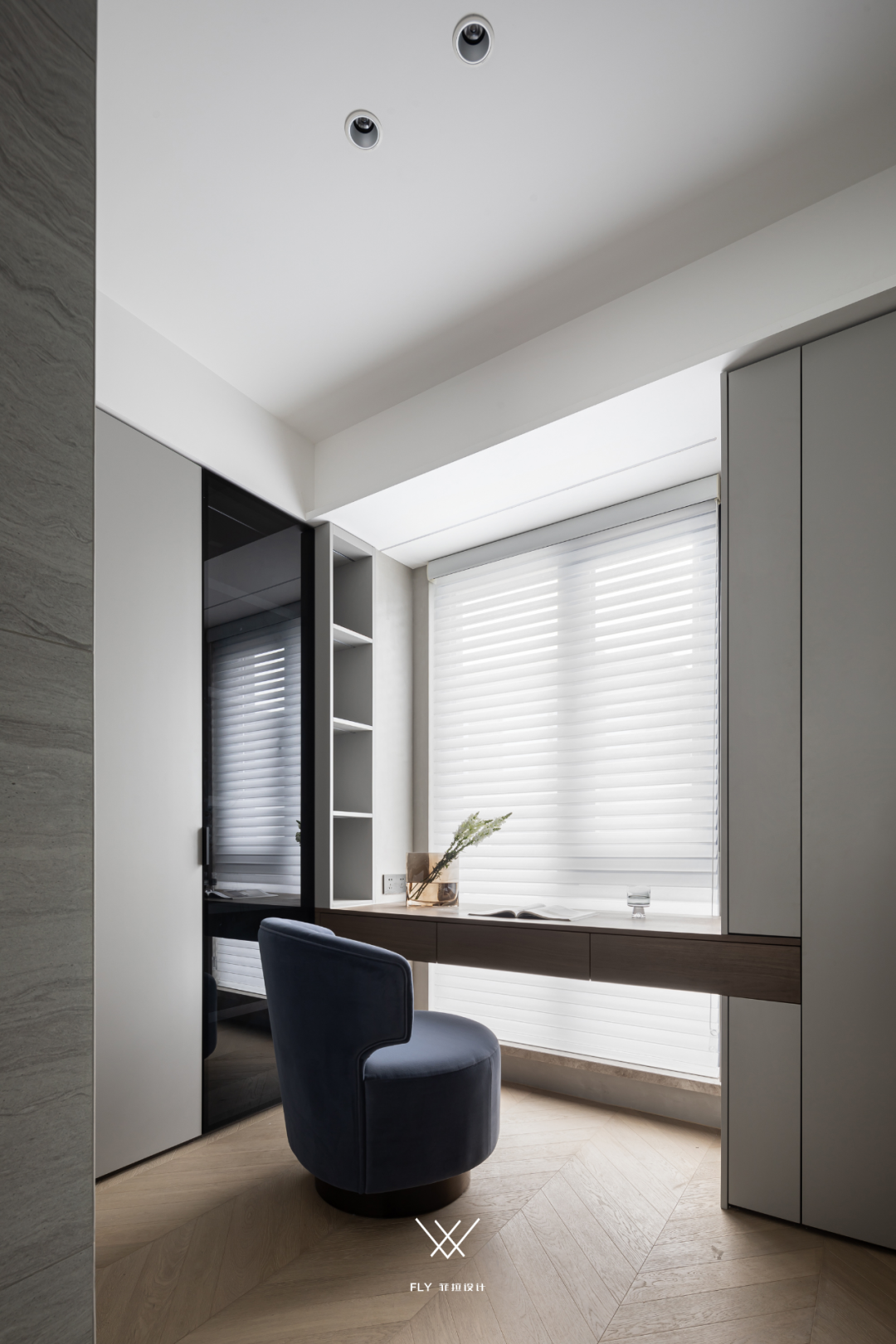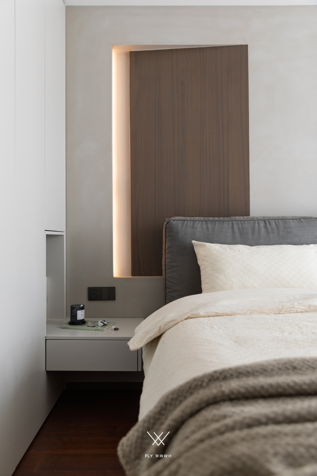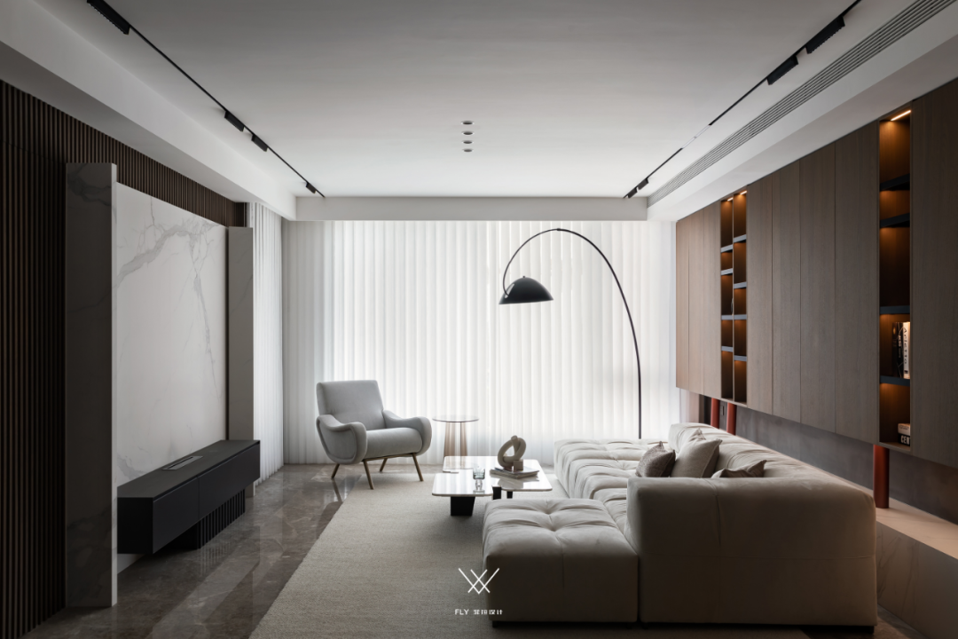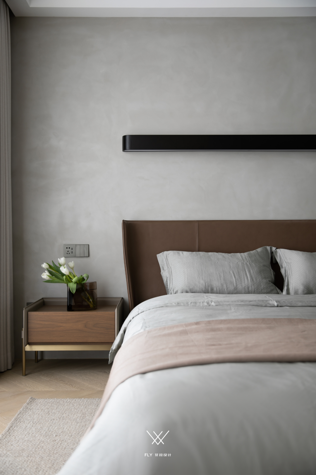 优化空间区域的完整性,次卧入口做隐形处理与电视背景墙融为一体,右侧阳台门以窗帘为掩做视觉清理,以纯粹的比例塑造空间感受。