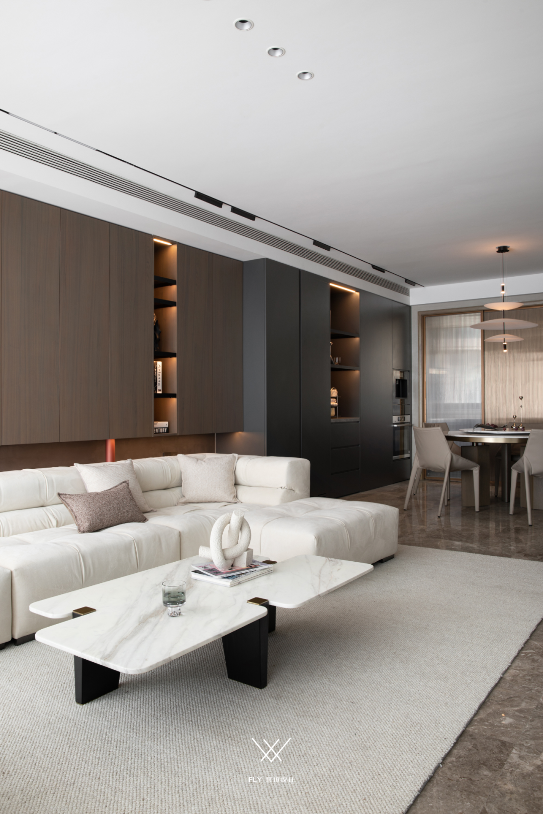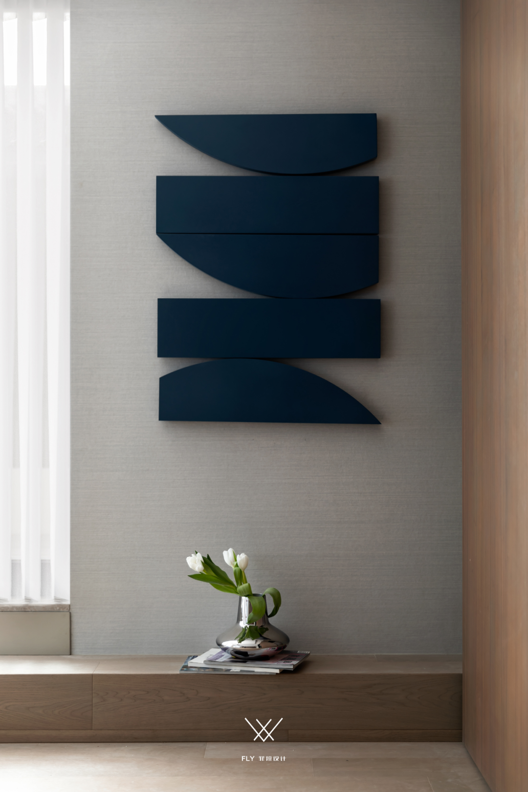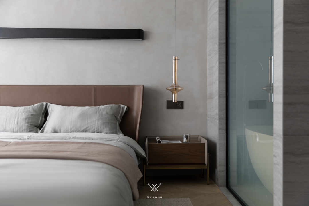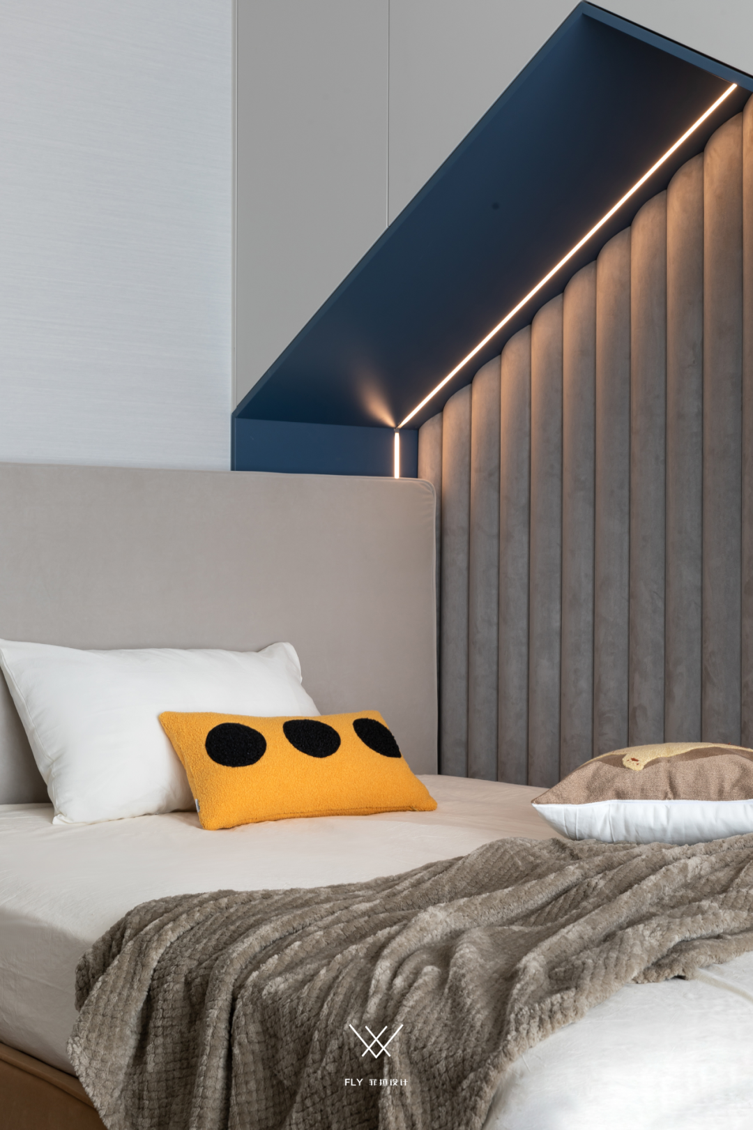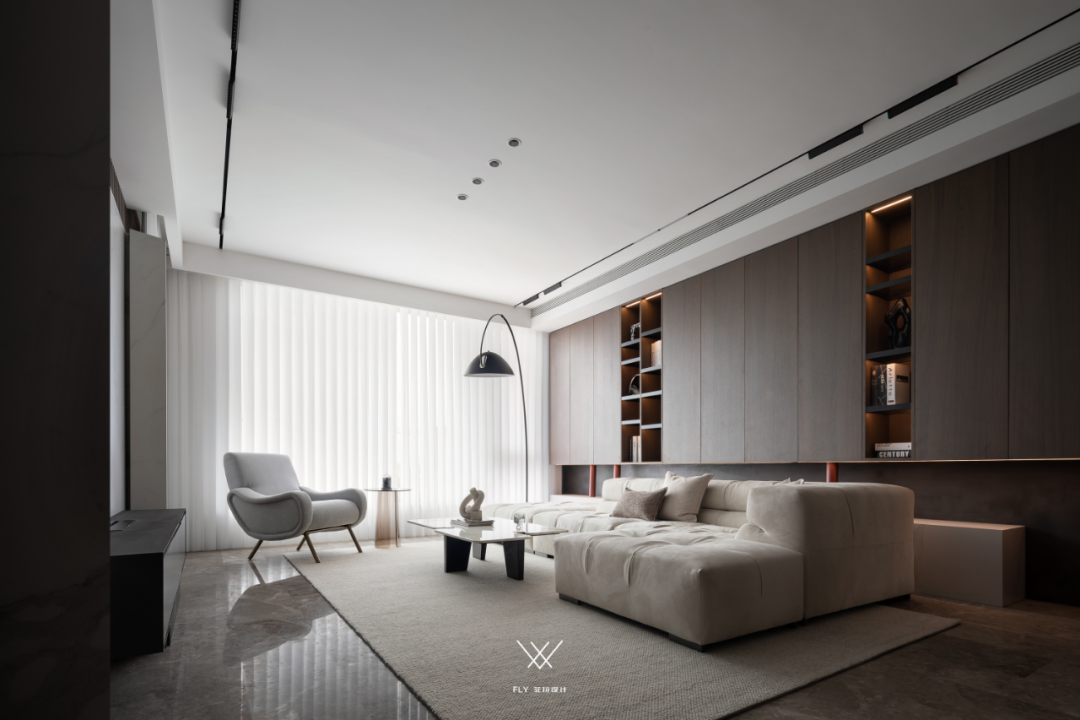 优化空间区域的完整性,次卧入口做隐形处理与电视背景墙融为一体,右侧阳台门以窗帘为掩做视觉清理,以纯粹的比例塑造空间感受。