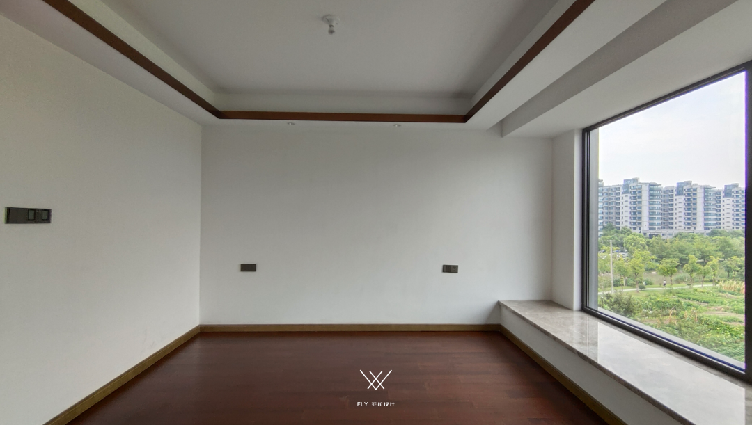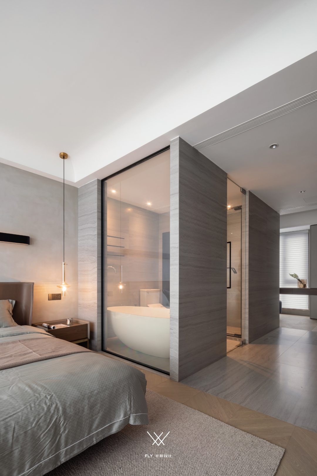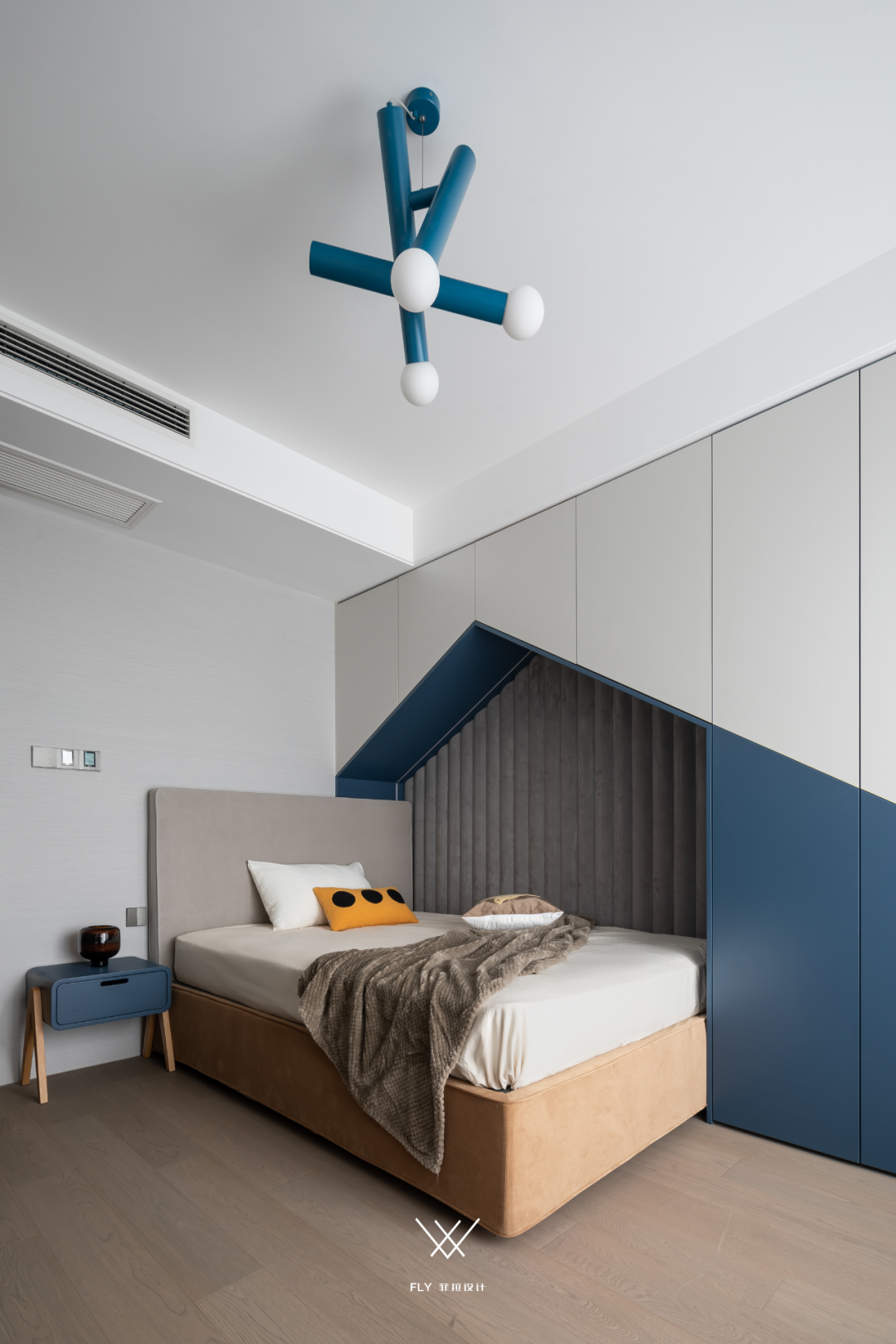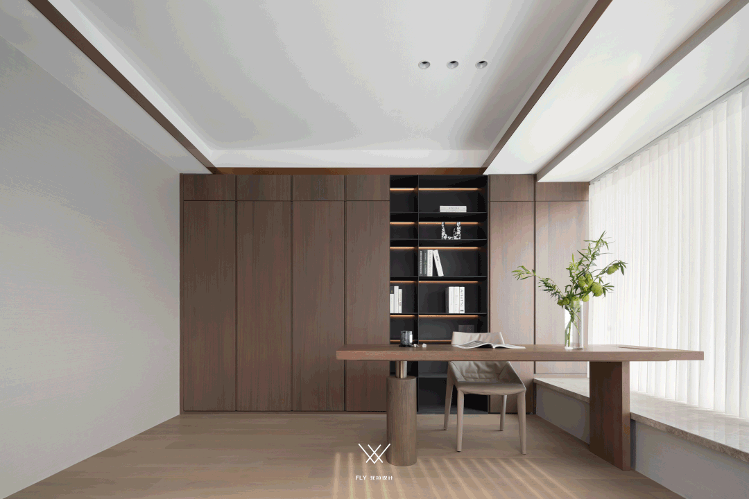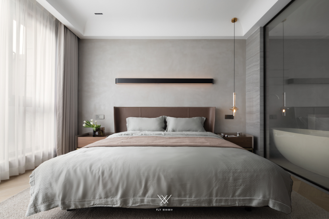 优化空间区域的完整性,次卧入口做隐形处理与电视背景墙融为一体,右侧阳台门以窗帘为掩做视觉清理,以纯粹的比例塑造空间感受。