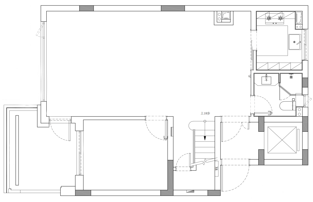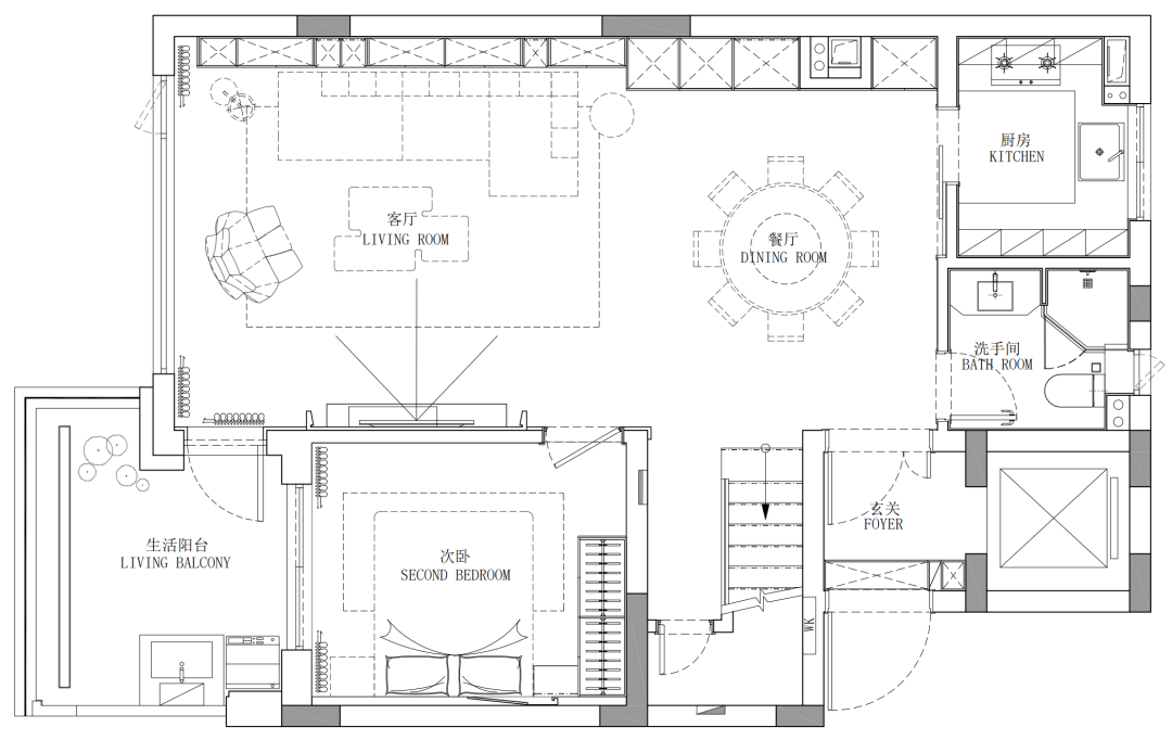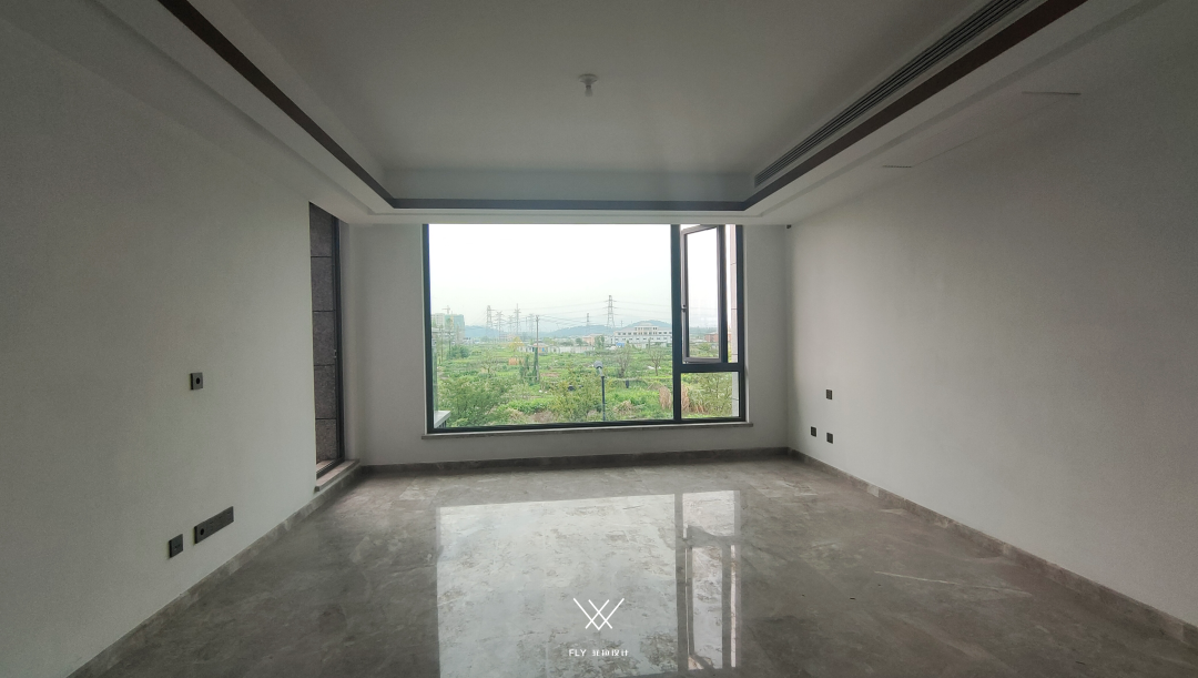 Optimize the integrity of the space area. The entrance of the second bedroom is invisible and integrated with the TV background wall. The right balcony door is visually cleaned with the curtain as the cover to create the space feeling in a pure proportion.