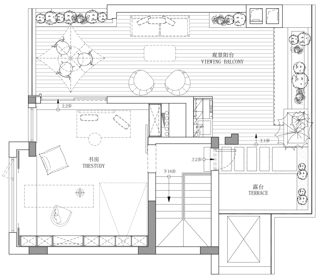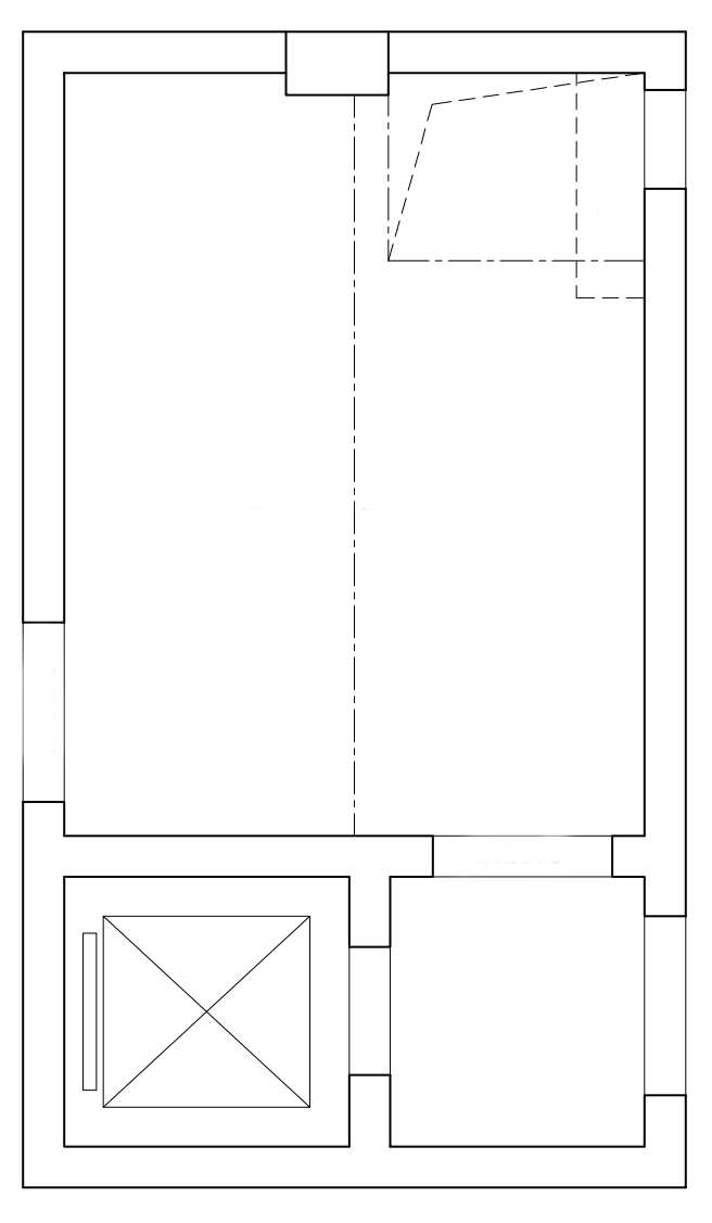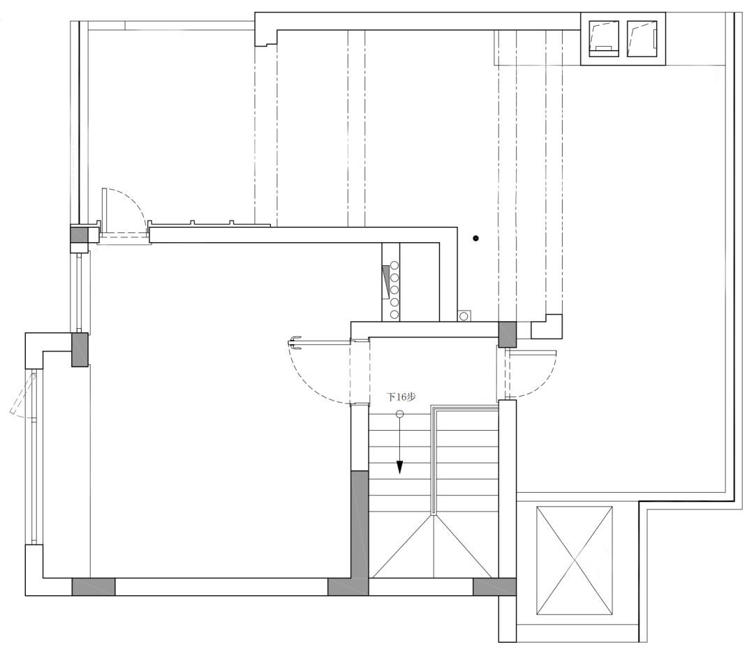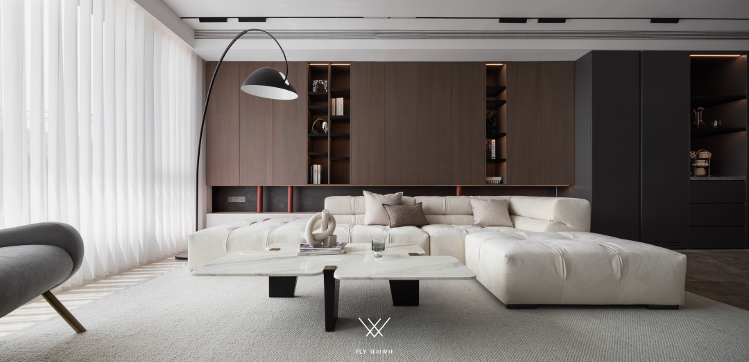 The storage space placed behind the sofa is also a space background model, in which the grid shape inserted, the connecting posture of the red support column and the rock slab platform below, and the collision of color and material create a small interest in the calm space.