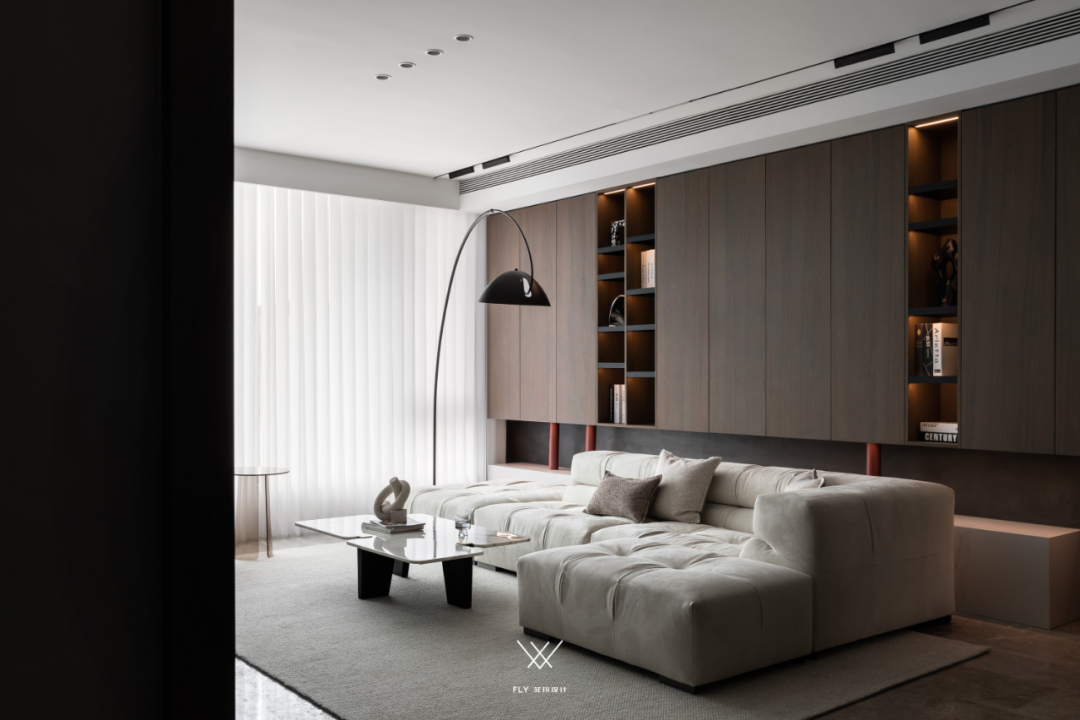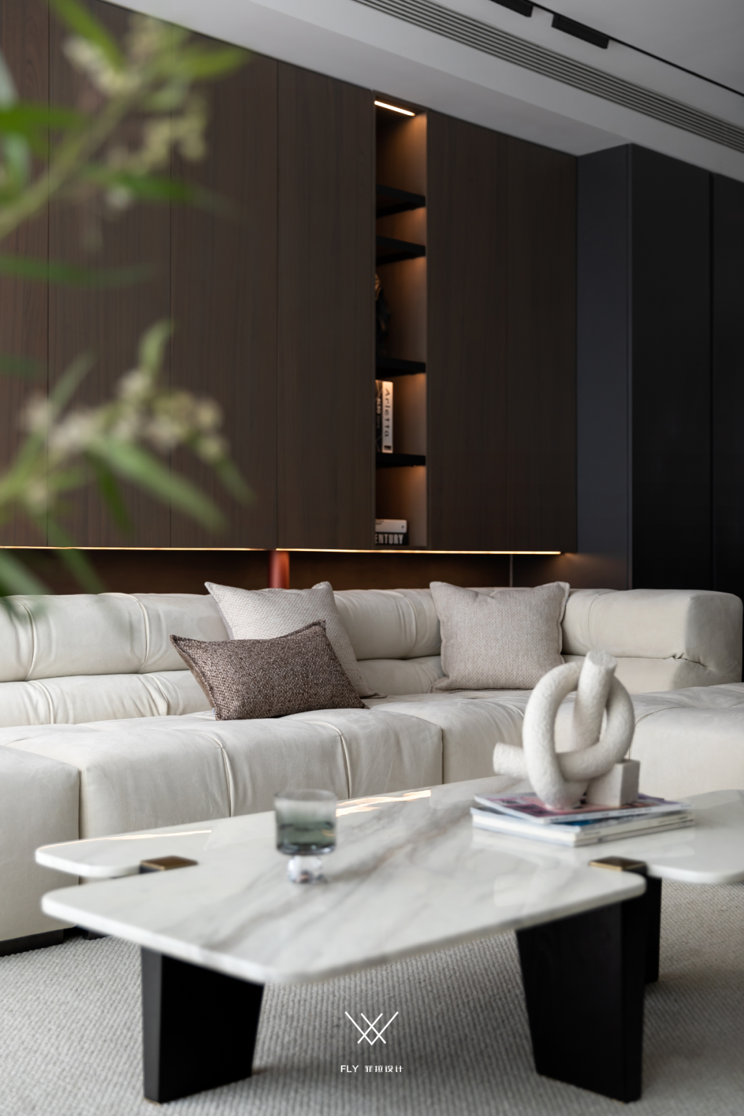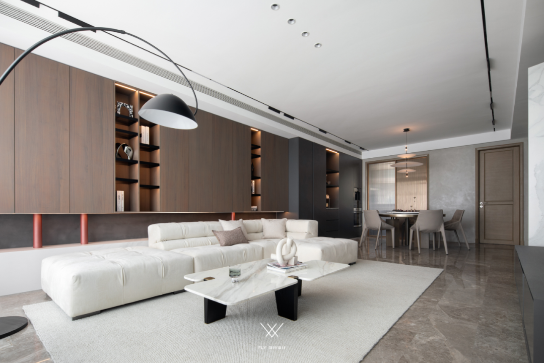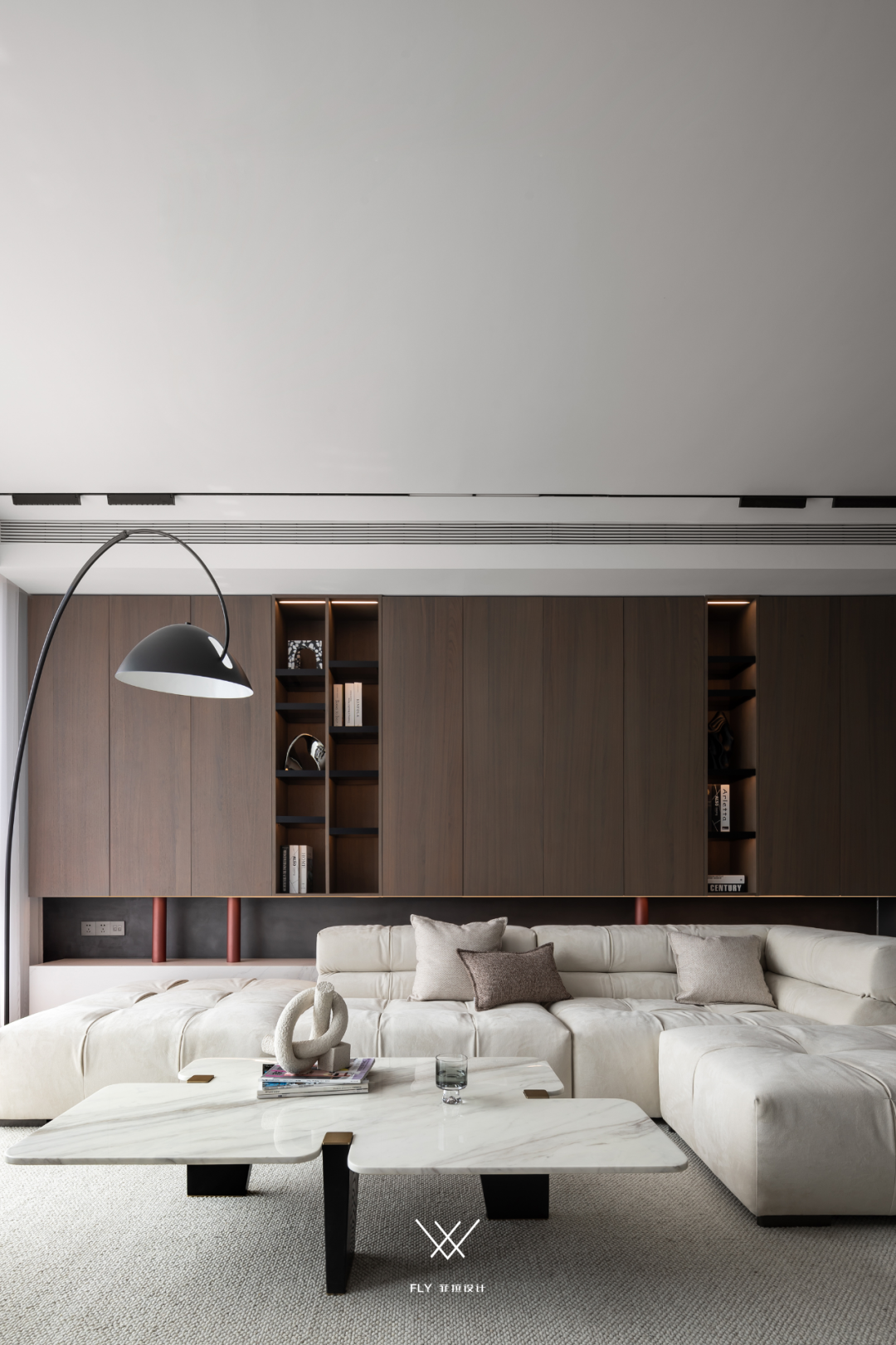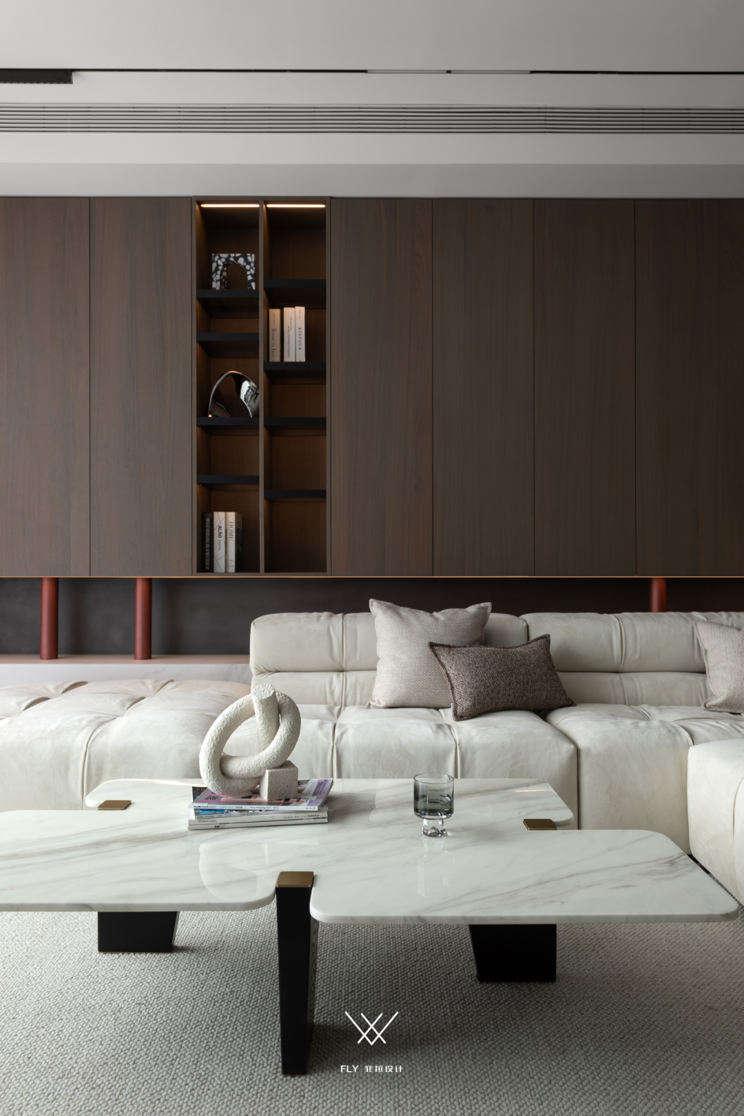 放置于沙发后的收纳柜亦是空间背景造型,其间插入的格口造型、红色支撑柱与下方岩板地台的衔接姿态,是利用色彩与材质的碰撞打造沉稳空间里的小趣味。