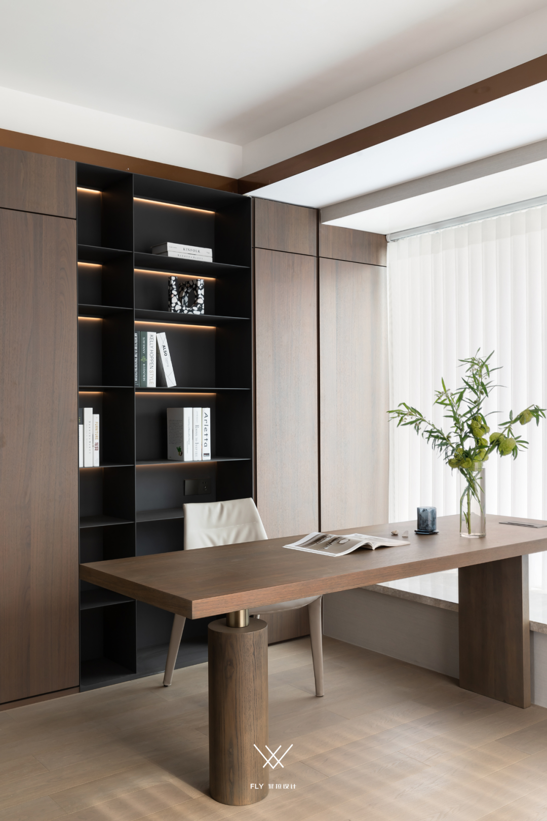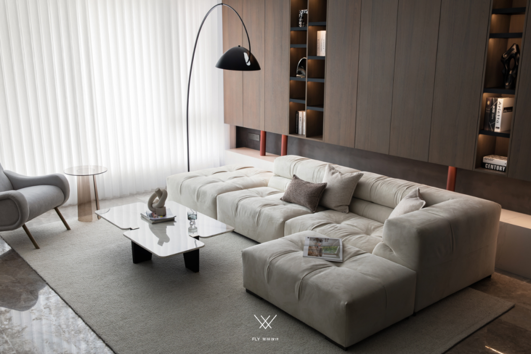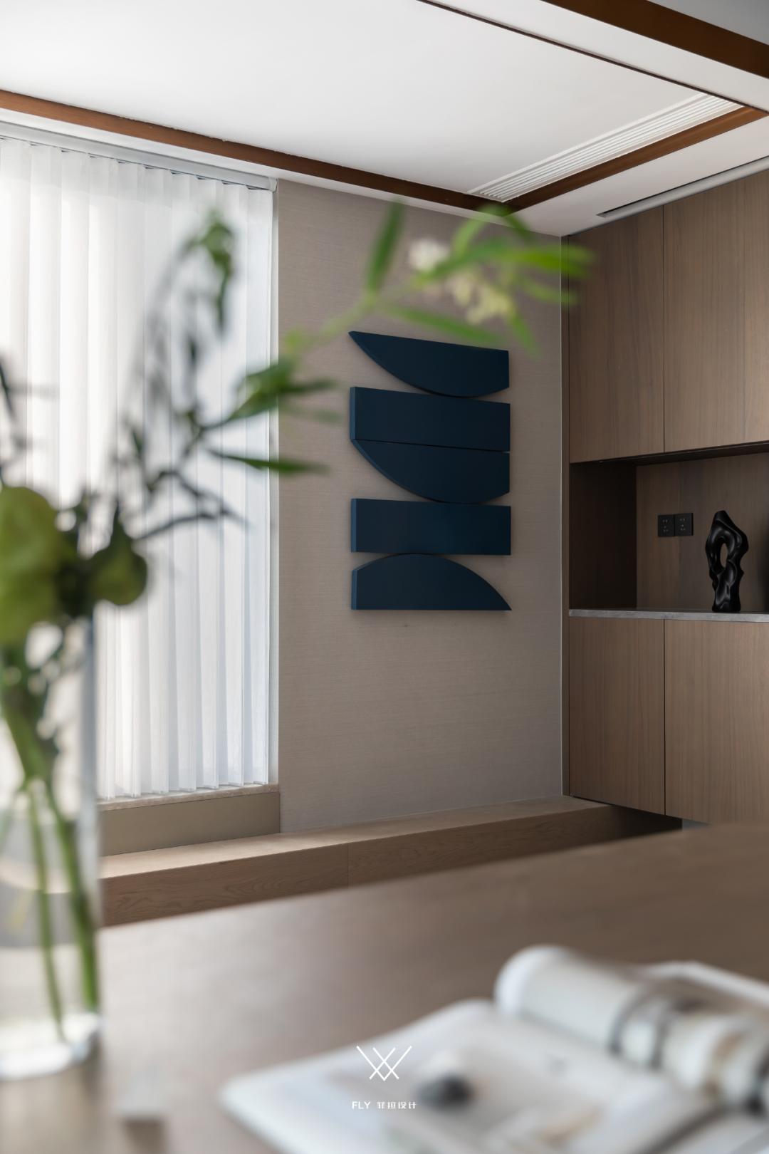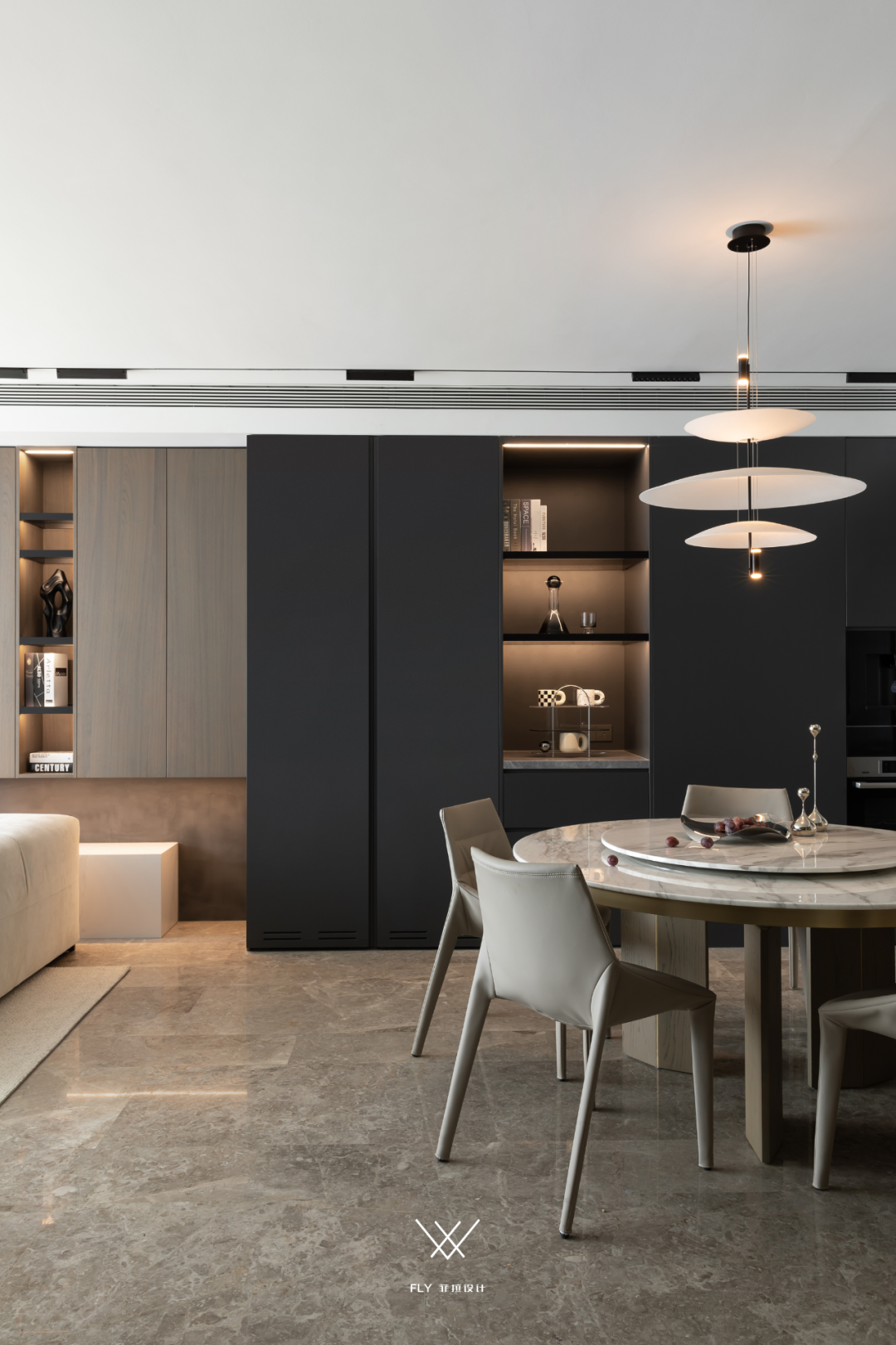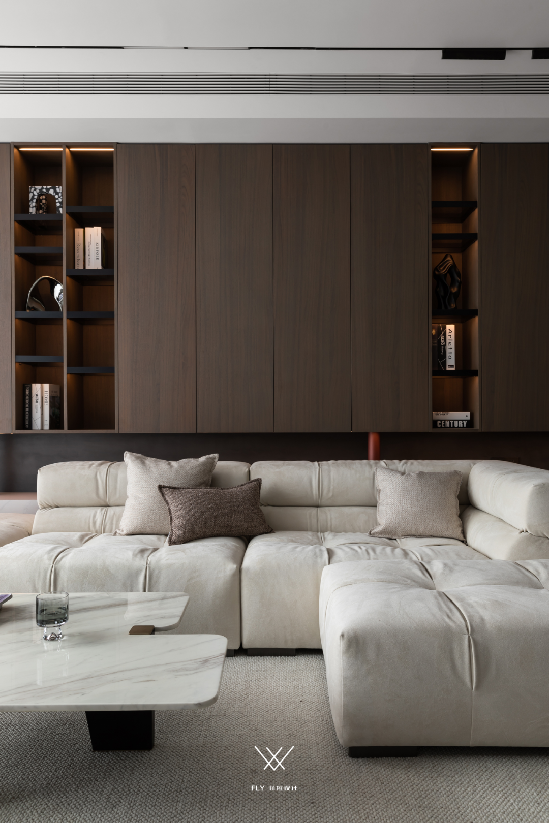 放置于沙发后的收纳柜亦是空间背景造型,其间插入的格口造型、红色支撑柱与下方岩板地台的衔接姿态,是利用色彩与材质的碰撞打造沉稳空间里的小趣味。