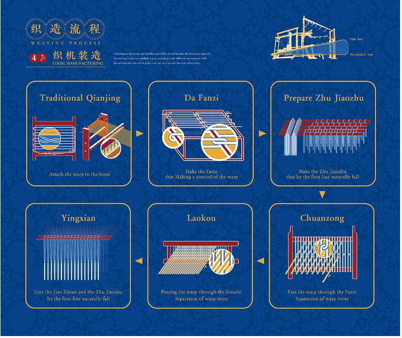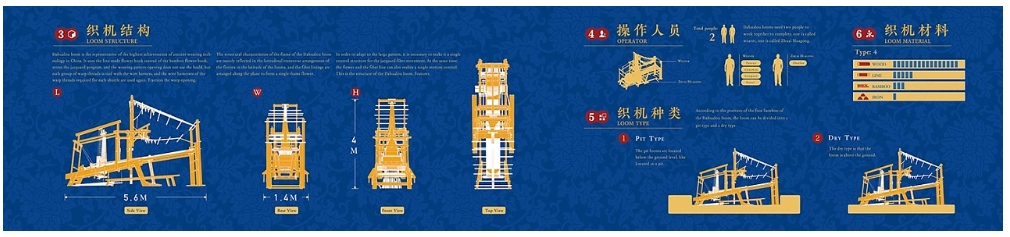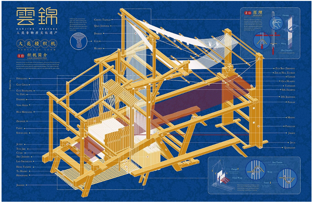 以云锦的织造工具一一大花楼提花机为切入点,在介绍各个部分的基本操作原理和工艺流程后,延展到其它相关信息。探讨如何将云锦的传统织造工艺以最容易被大众接受的视觉信息图解方式表现出来。