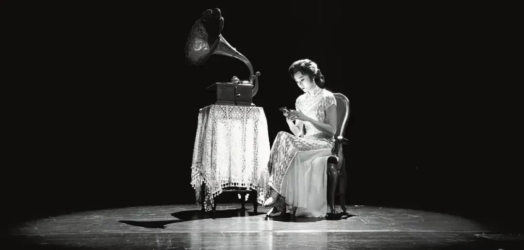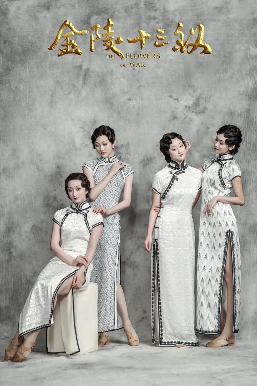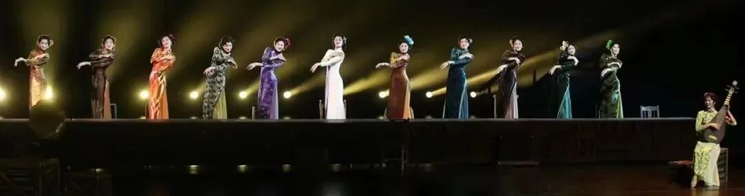 对于⼗三钗来说,在旗袍款式上都以上世纪30年代的曳地旗袍样式为依据, ⼈物身份、环境的变化致使服装选⽤了不同的⾯料和⾊彩来表现⻆⾊。逃亡⽚ 段的⼗三钗⽣活装形象,采⽤以烂花丝绒⾯料为主体的九分⻓袖旗袍,图案除了当时流⾏的竖条以及碎花纹样之外,还有不少⼏何或抽象的装饰性图案,紧贴30年代art deco的时尚⻛向。以不同⾼饱和、低明度⾊彩的旗袍,搭配同⾊ 系的⼤⾐,帮助舞剧表现所处的阴暗的地窖环境。