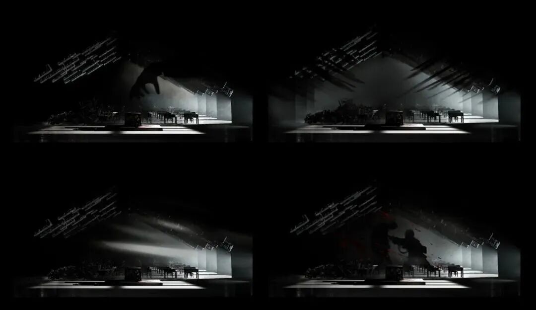 动态光影的手法,更好的营造了紧张气氛,和演员的互动演出,相得益彰