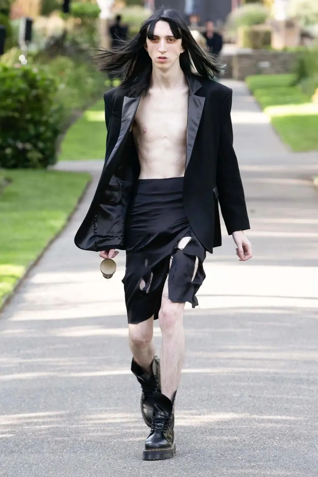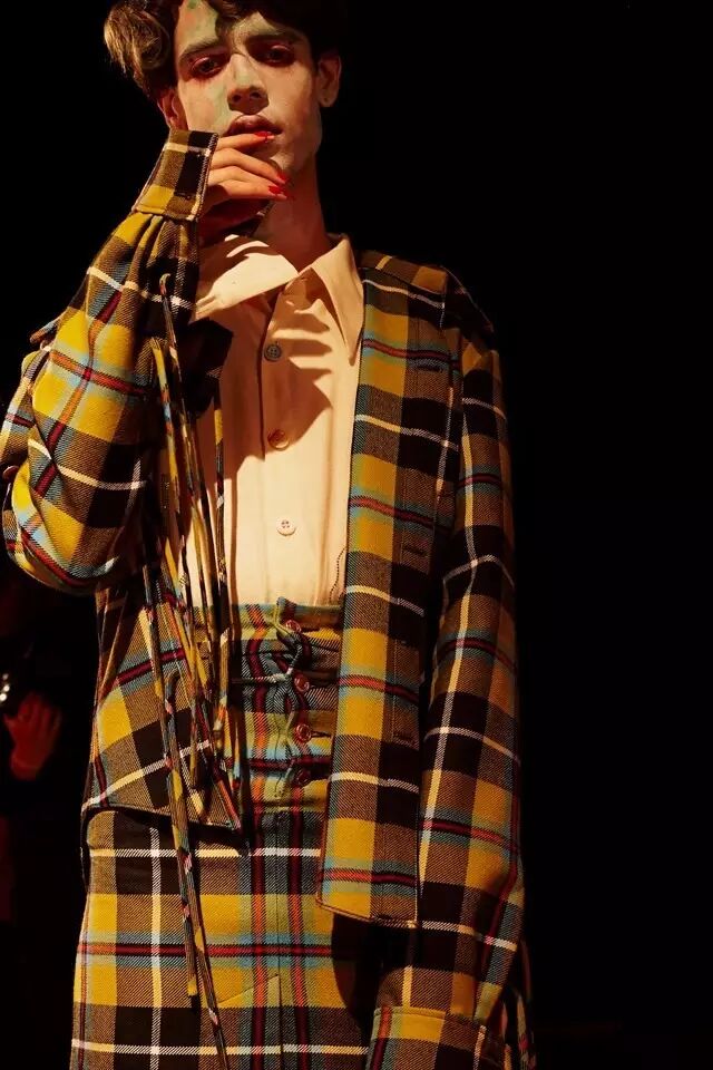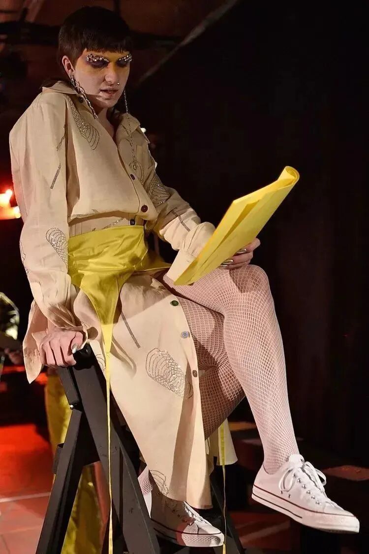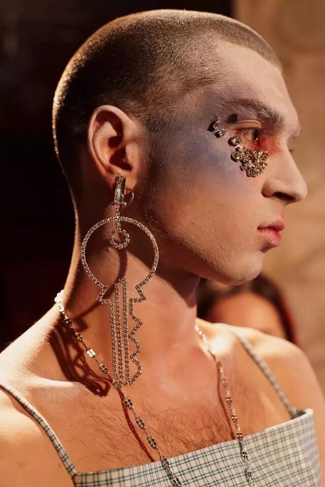 他们穿着模糊性别身份的服装,带着夸张的首饰,他们展示形式也十分特别,一群穿着怪异的人在狂欢,看起来有些歇斯底里,他们凭借身份的多元性,传达一种酷儿本真的时尚态度。