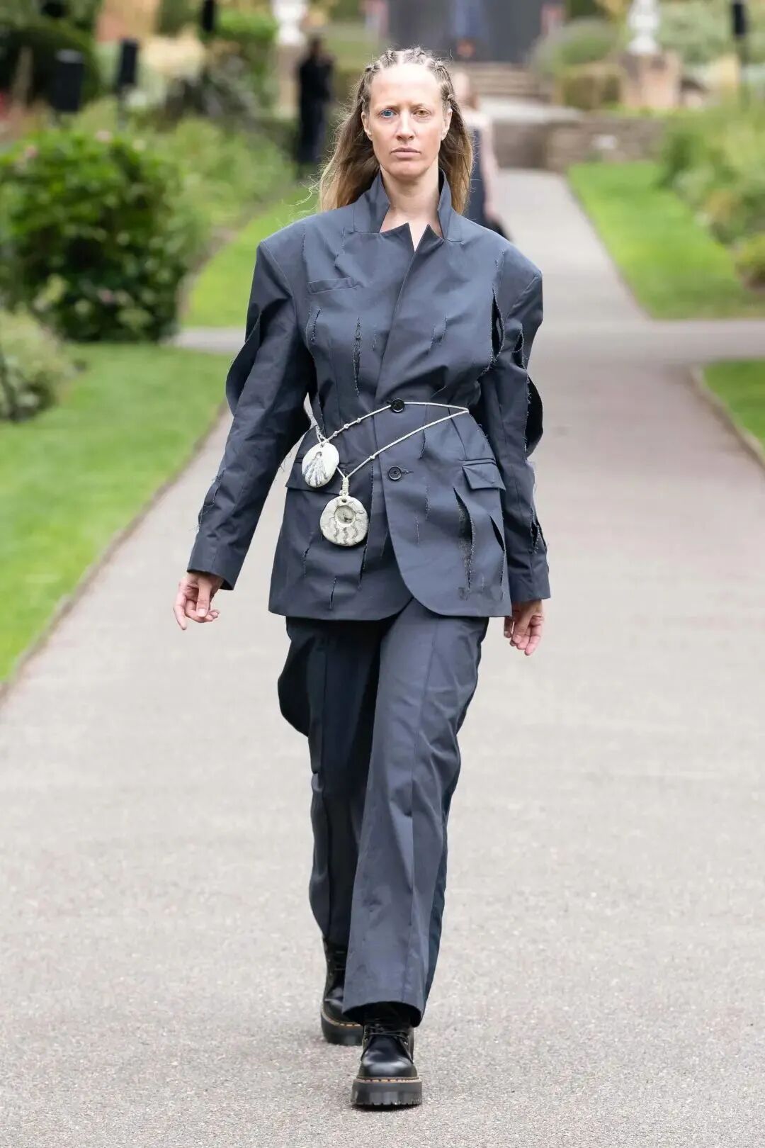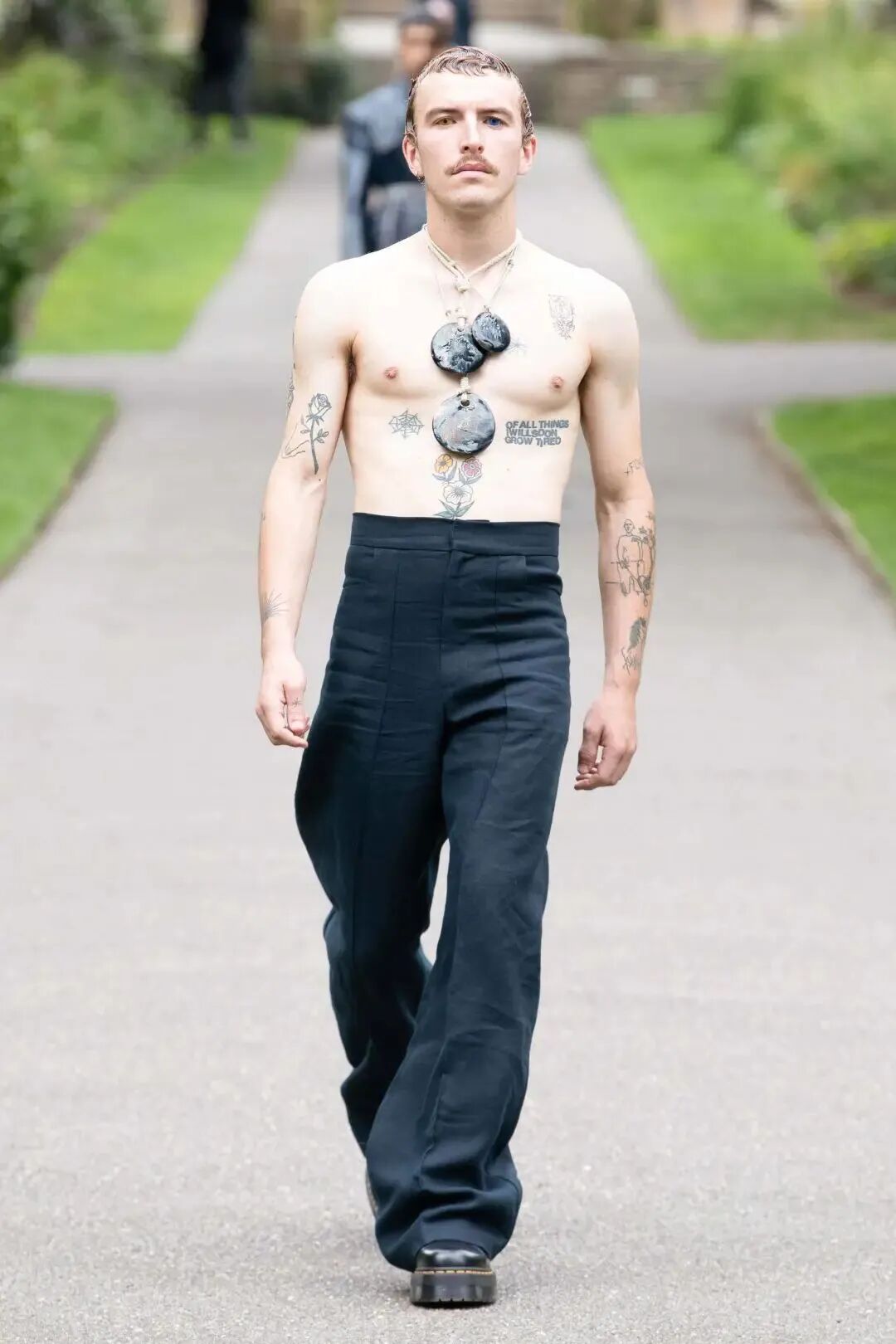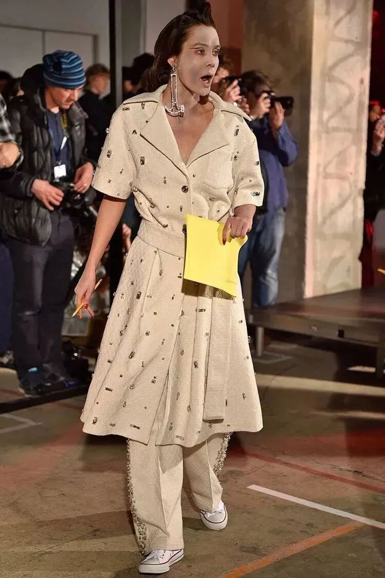 他们穿着模糊性别身份的服装,带着夸张的首饰,他们展示形式也十分特别,一群穿着怪异的人在狂欢,看起来有些歇斯底里,他们凭借身份的多元性,传达一种酷儿本真的时尚态度。