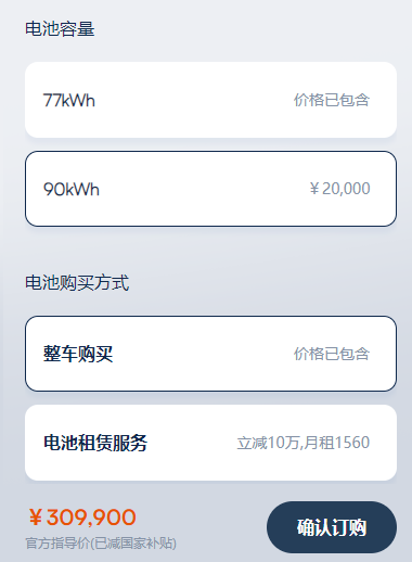 90度电池包的每月租金费用是1560元,同样包含了80元电池保障服务费。立减10万元的车价则是相当于5.3年的电池租用费用。