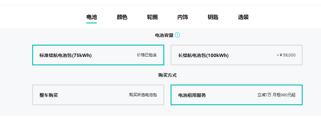 以蔚来ES6为例,75度电池包的每个月租用费用是980元,如果没有购买服务无忧包,你每个月还需要多付80元电池服务费。而选择BASS方案后,75度版本的价格会减去7万元,也就相当于5.5年的电池租金。