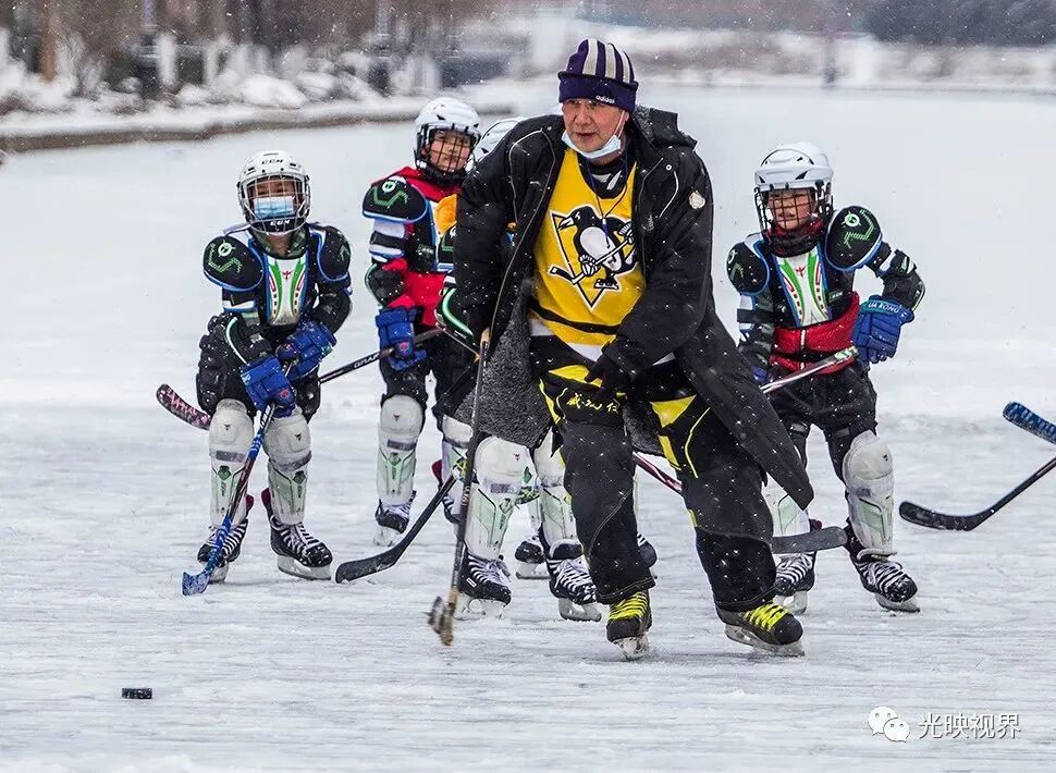随图文字:老人为退役的国家冰球队员,多年在儿童滑雪培训机构任教练,为国家培养冰球人才。身后是几名新学员。